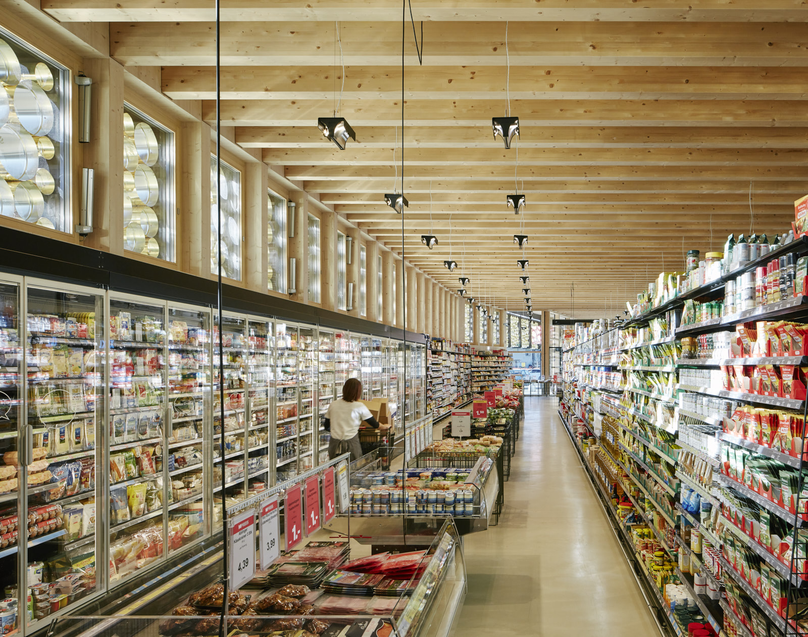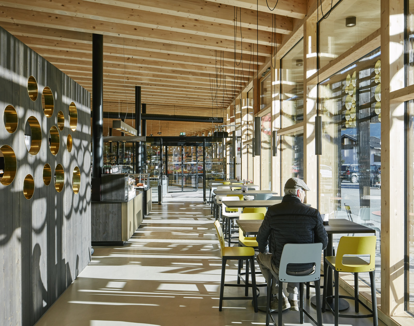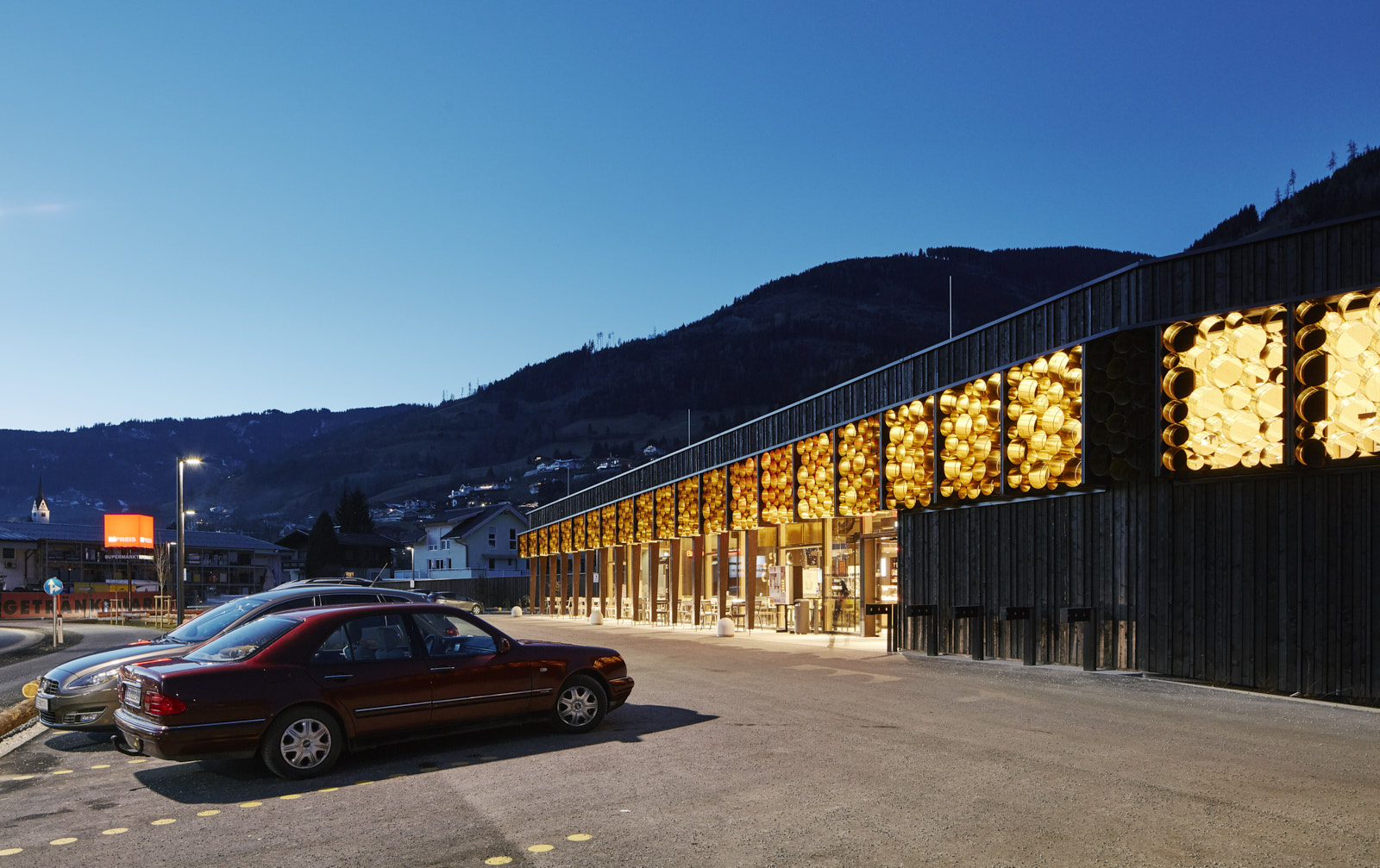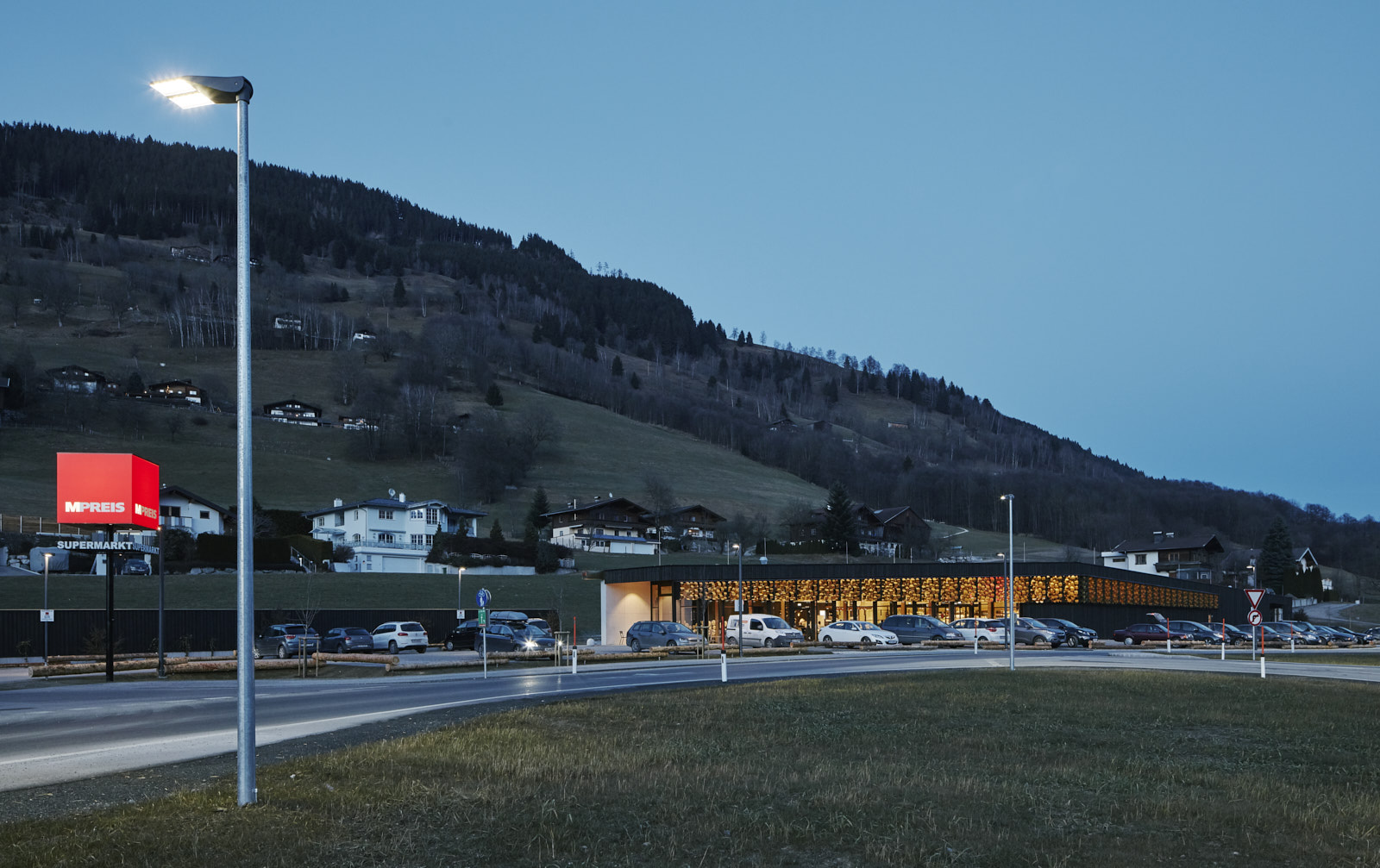 Der Lebensmittelmarkt ist eingeschossig organisiert, die Lage im auslaufenden Hang lässt einen Großteil der Kubatur im Gelände verschwinden.