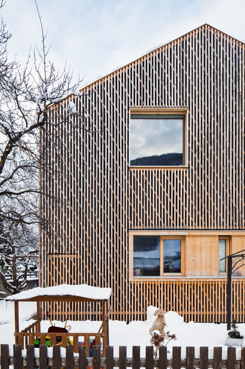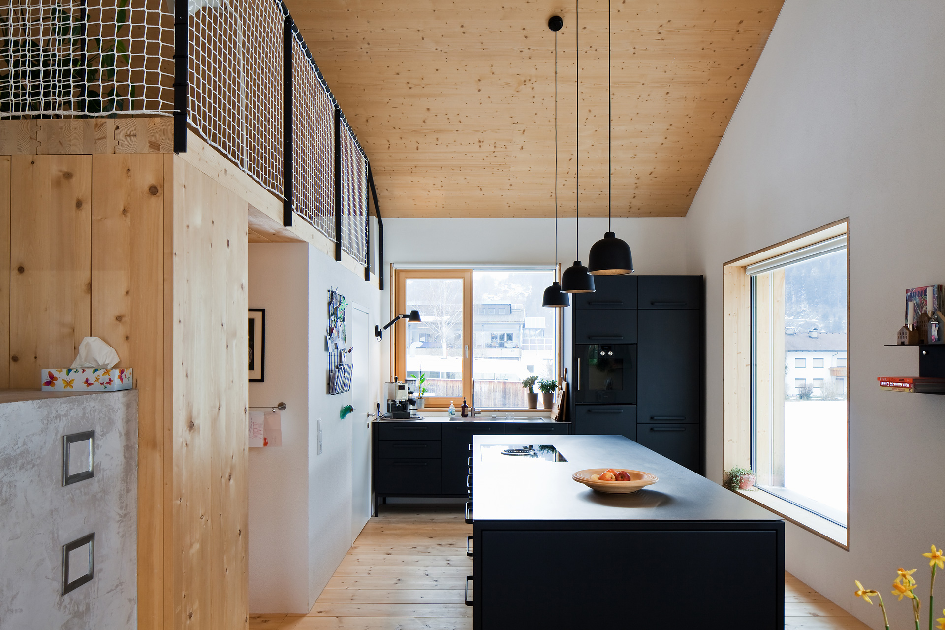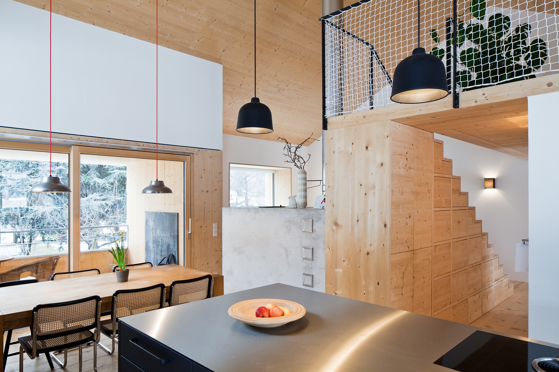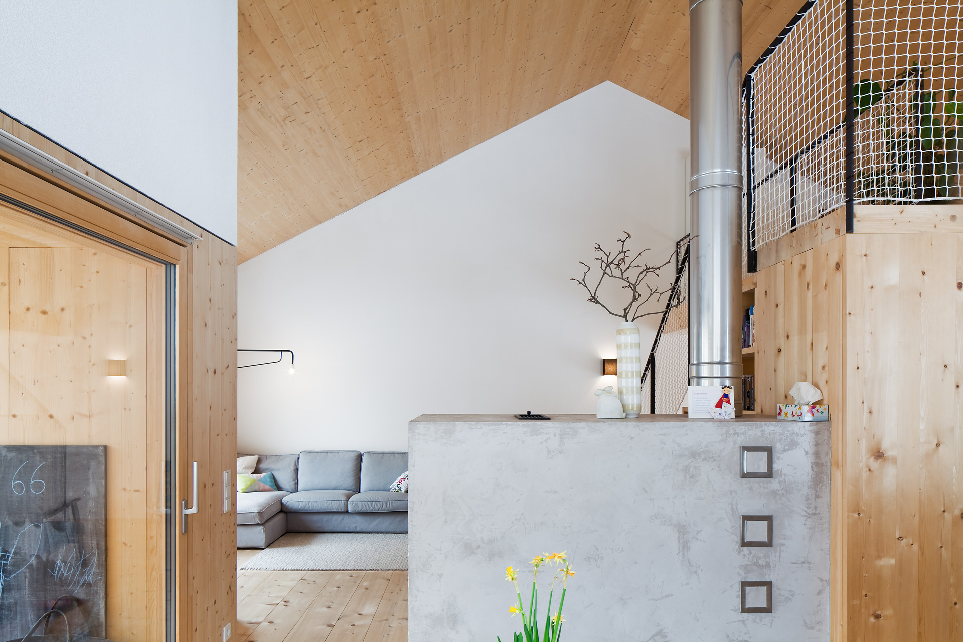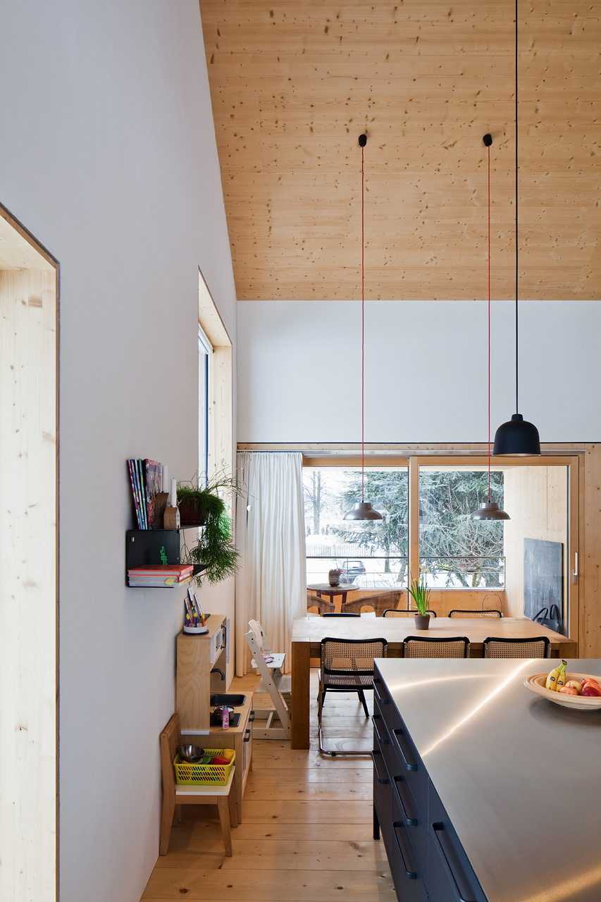 Der Verzicht auf Schein und das Zeigen von Sein war ein essentieller Wunsch der Bauherrenschaft. Die Materialien wurden in ihrer rohen Qualität benutzt – keine aufgetragenen Farben, Lacke oder Beschichtungen. Fichte in seinen unterschiedlichen Oberflächen (handgehobelter Riemenboden, sägeraue Fassadenlattung) war neben Aluminium Natur und Beton direkt aus der Schalung das bestimmende Material. (Text: Architekten)