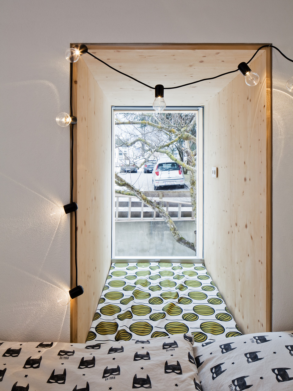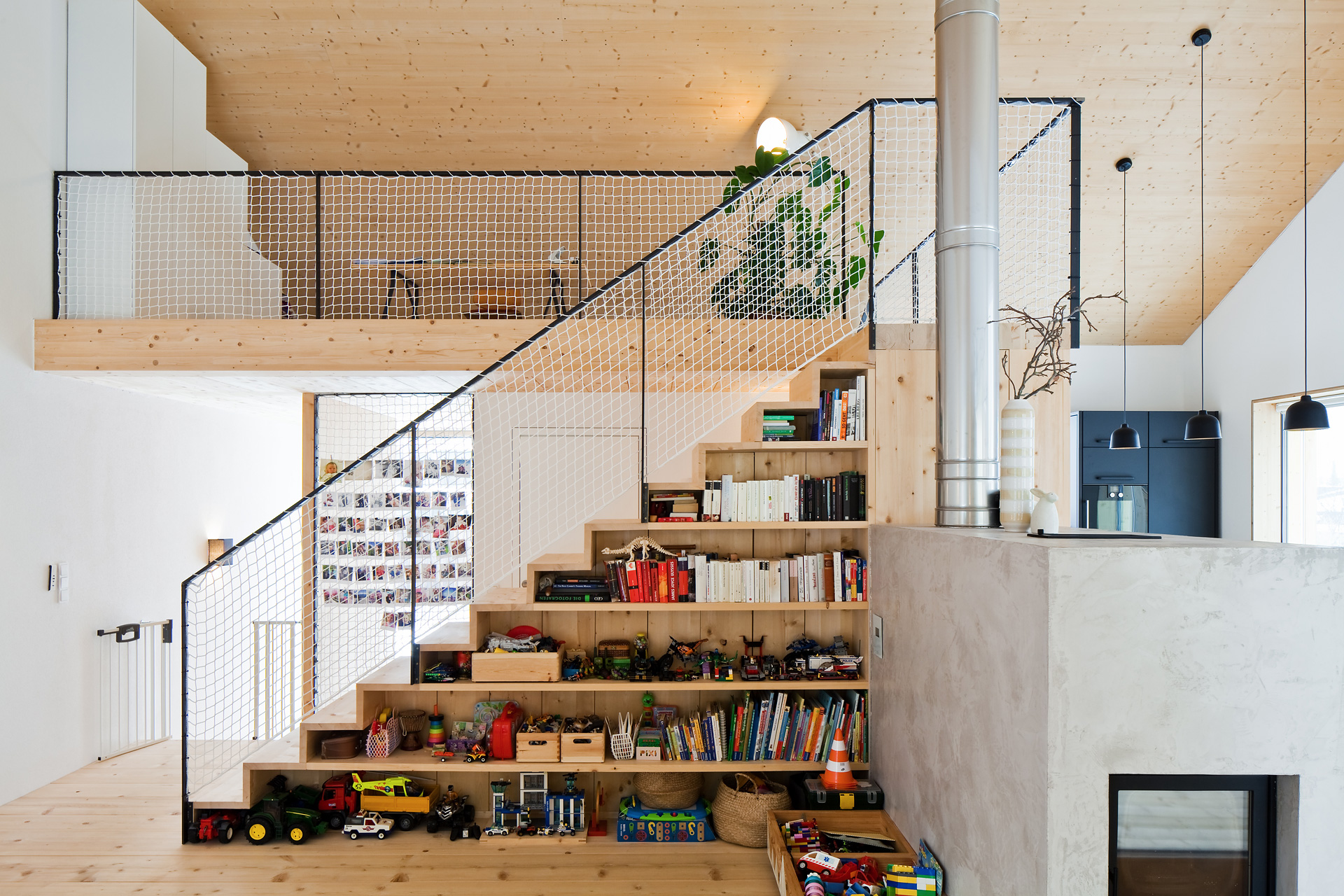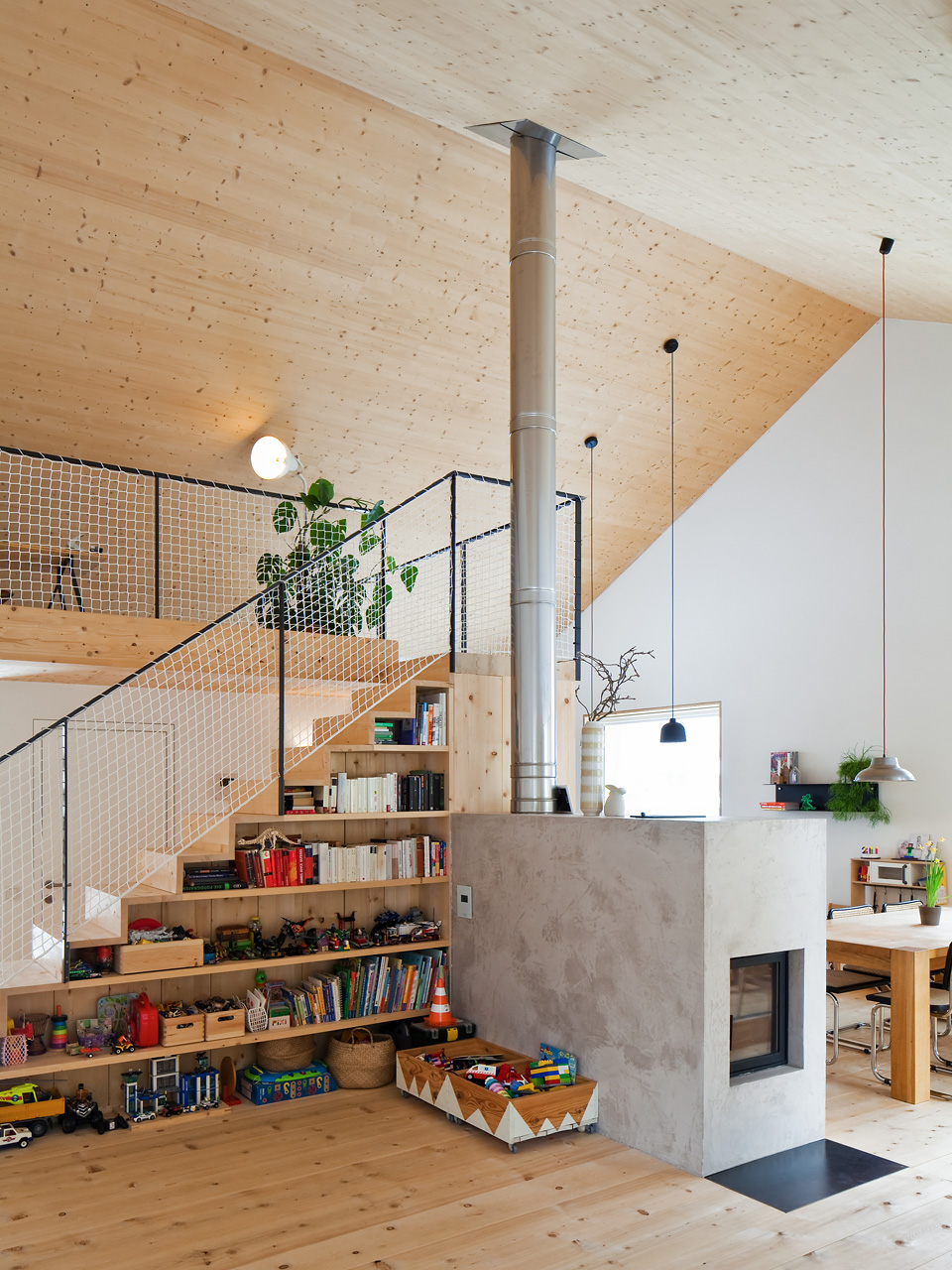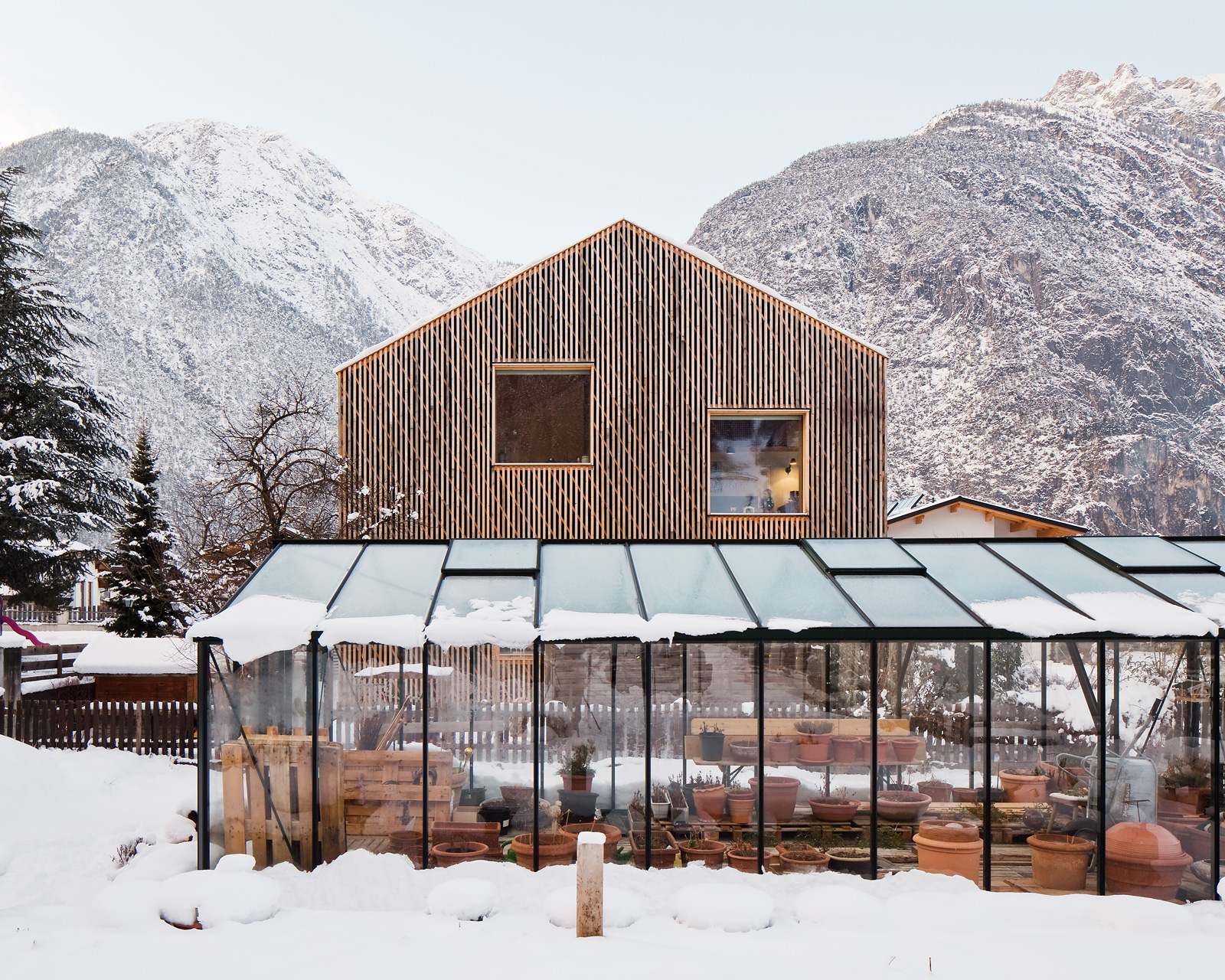 Der Verzicht auf Schein und das Zeigen von Sein war ein essentieller Wunsch der Bauherrenschaft. Die Materialien wurden in ihrer rohen Qualität benutzt – keine aufgetragenen Farben, Lacke oder Beschichtungen. Fichte in seinen unterschiedlichen Oberflächen (handgehobelter Riemenboden, sägeraue Fassadenlattung) war neben Aluminium Natur und Beton direkt aus der Schalung das bestimmende Material. (Text: Architekten)