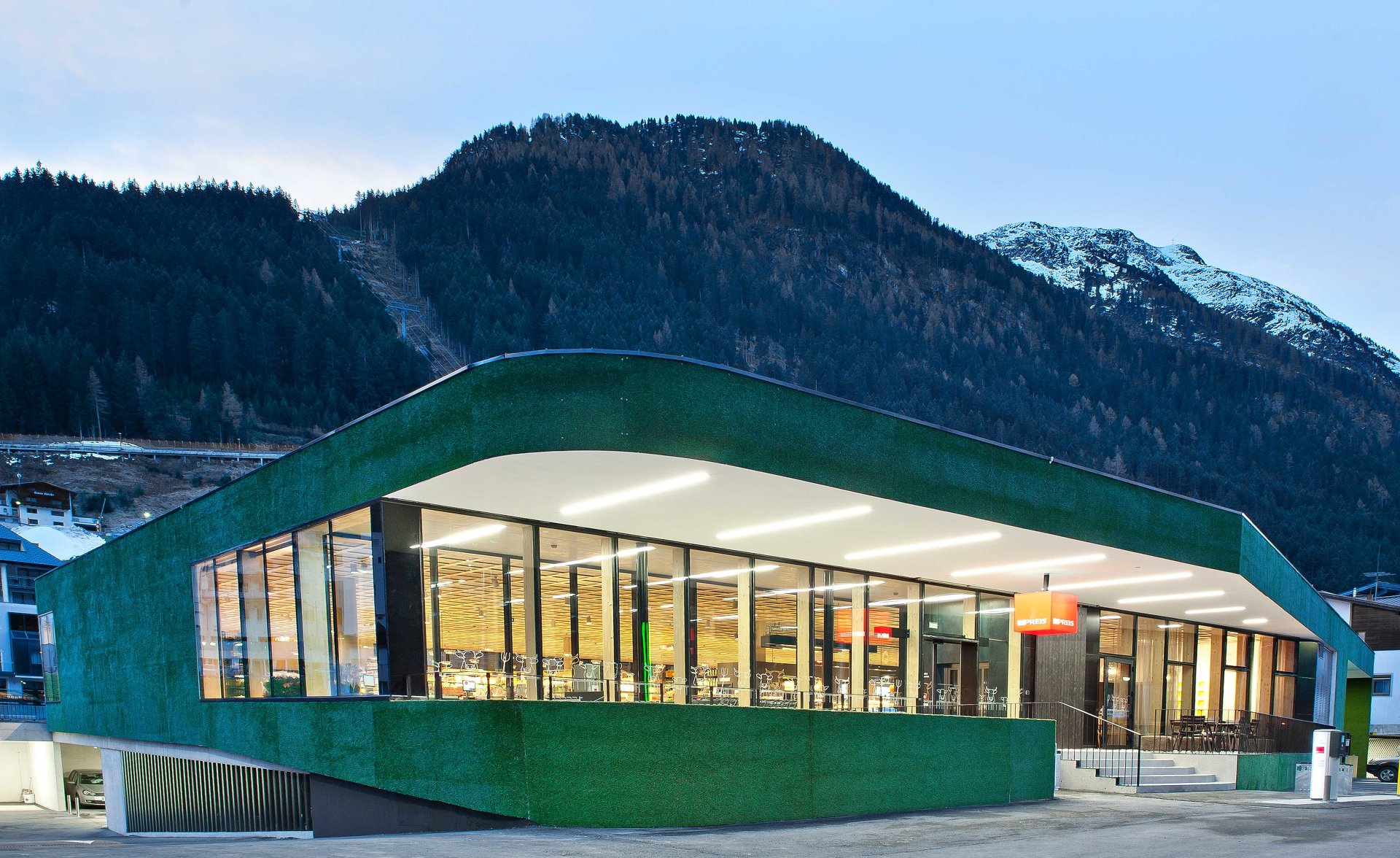 Der neue MPREIS in Ischgl wurde als Passivhaussupermarkt ohne Heizung ausgeführt. Dies ist vor allem deshalb erwähnenswert, da sich der Standort auf ca. 1400 m Seehöhe befindet. Die erforderliche Wärme wird nur durch die Abwärme der Kühlmöbel erzeugt. Das Gebäude wurde mit dem Umweltprädikat „klimaaktiv“ in Gold ausgezeichnet. Voraussetzung für diese Auszeichnung sind beste Qualitätsstandards im Bereich Energieeffizienz, Ressourceneinsatz, Planung, Umsetzung und Raumklima. Der vielfache Einsatz von ökologisch zertifizierten Baustoffen mit Gütesiegel gewährleistet diese hohen Anforderungen im Bereich Klimaschutz. (Text: Architekt:innen)