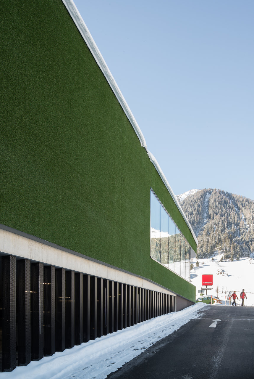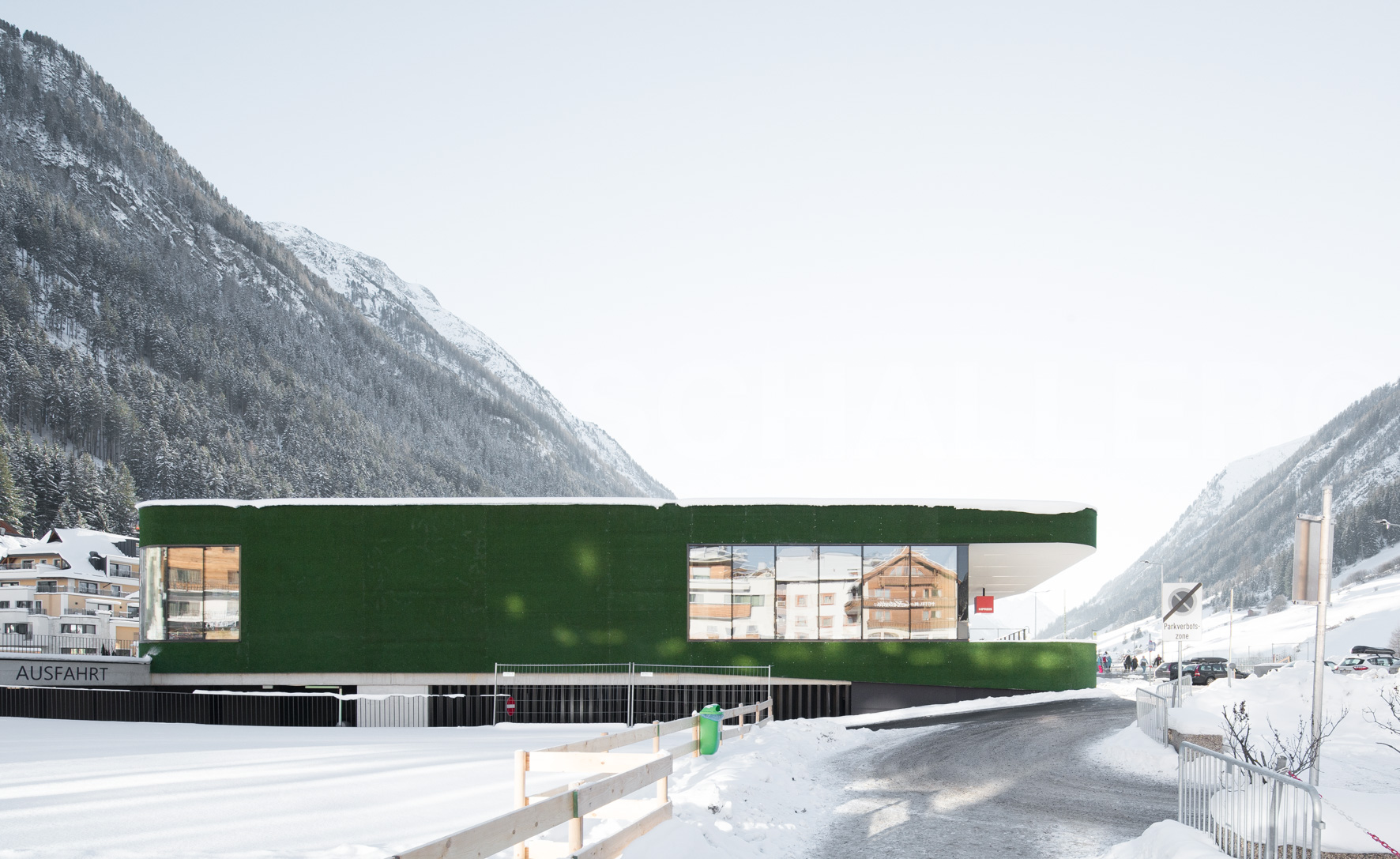 Die gesamte Tragstruktur des Gebäudes ist in Stahlbeton ausgeführt und symbolisiert im Innenbereich die traditionelle Bauernstube mit Kassettendecke und die Struktur eines klassischen Holzbodens. Ganz unter dem Deckmantel, „alles nur Fassade“, stellt sich die Außenhülle des Gebäudes den umliegenden Hotelbauten entgegen und lädt zur Diskussion über das traditionelle und alpine Bauen ein.