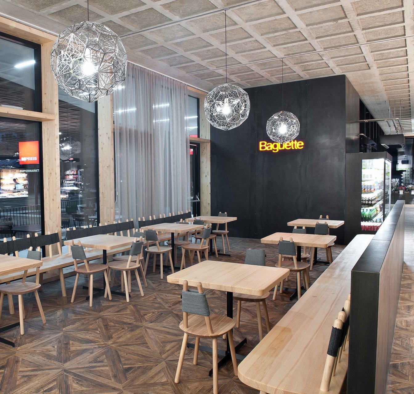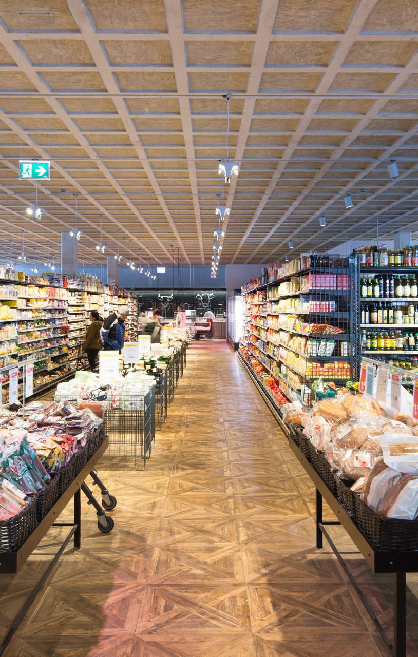 Das Gebäude ist zweigeschossig angeordnet. Im Untergeschoss befinden sich die Parkplätze für den Supermarkt und des benachbarten Hotels sowie Technik- und Lagerräume des Geschäftes. Der erhöhte Verkaufsraum wird über eine Treppe und den Personenaufzug erreicht. In der Verkaufsebene befindet sich neben dem Lebensmittelraum noch ein Café-Bereich mit einem Bistro.