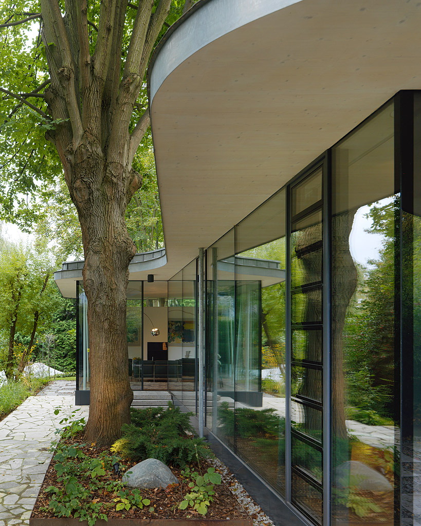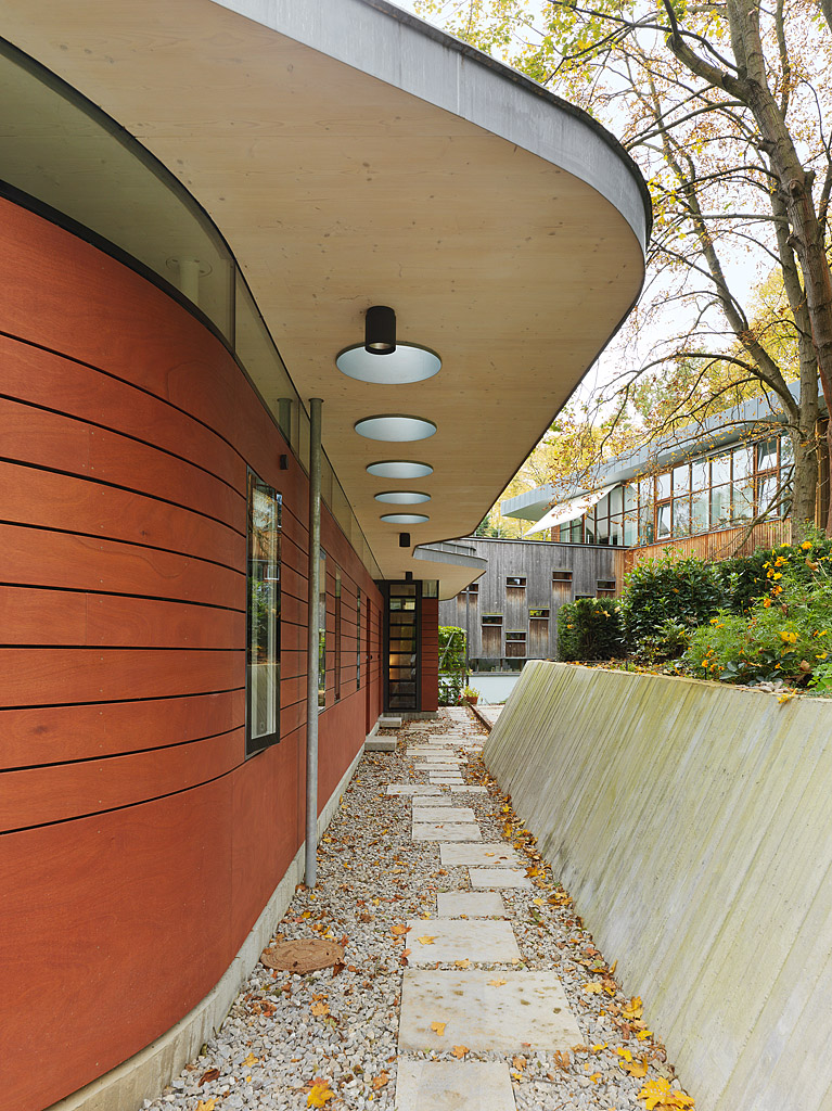 Das Bauwerk wurde als Holztafelbau aus LENO-Elementen konstruiert, die Deckenplatte aus massivem Holz lagert auf filigranen Stahlstützen. Die Rundung zur Seite mit dem terrassierten Zugang vermittelt in weichen Formen zum Naturraum. (Text: Architekt, bearbeitet)