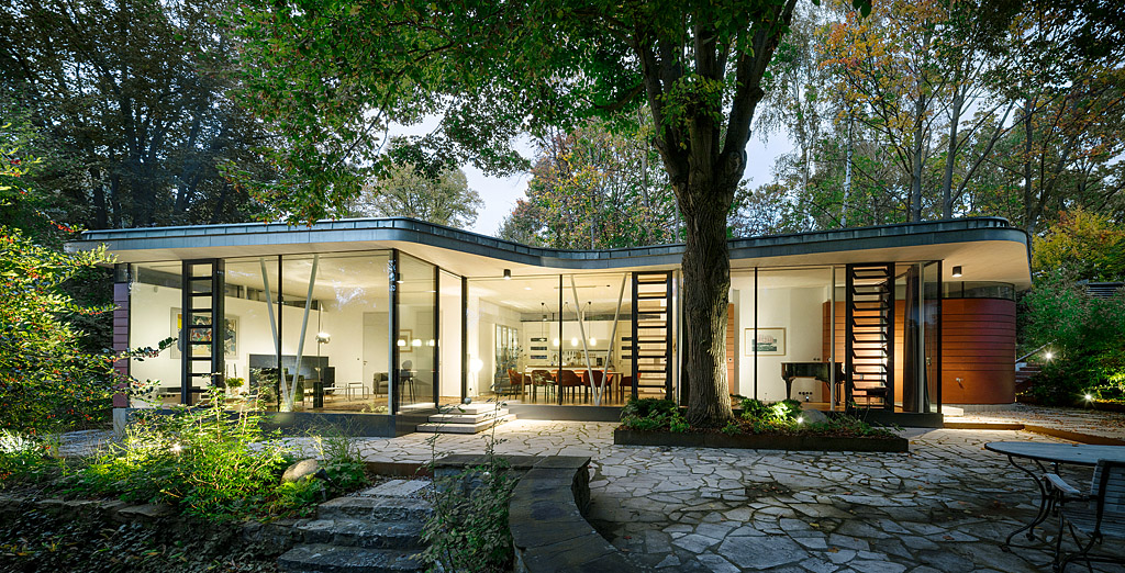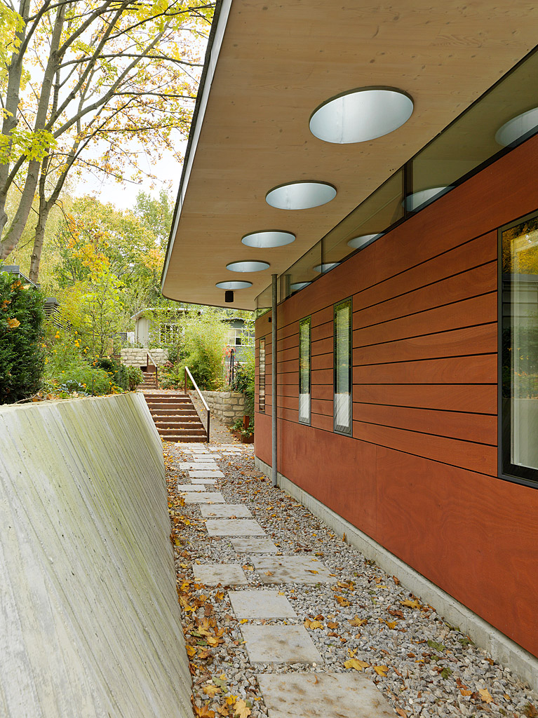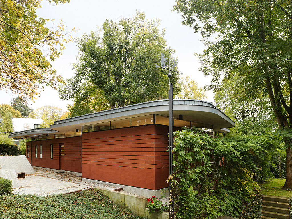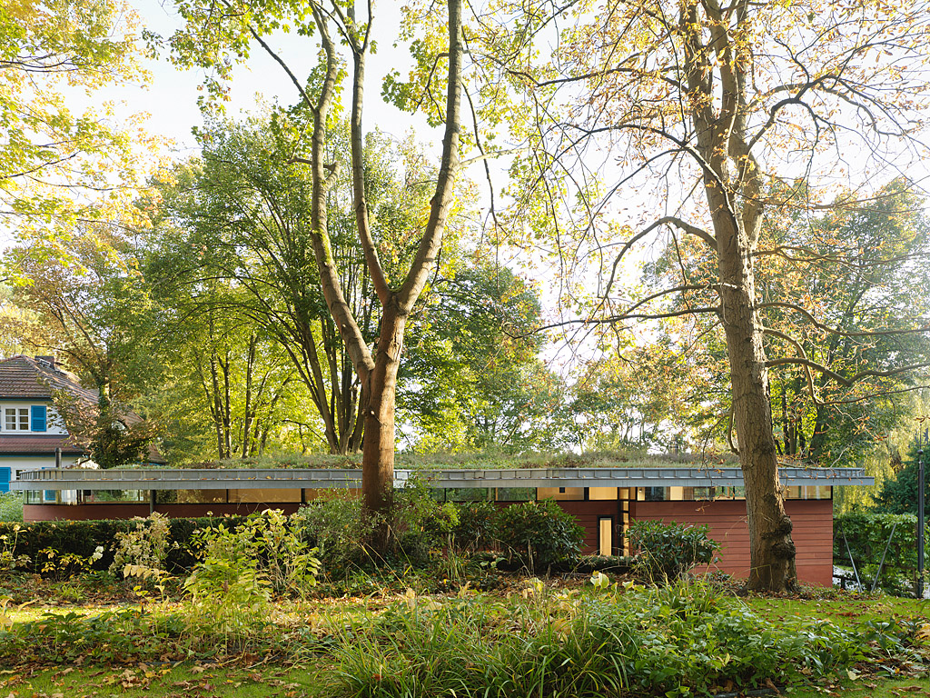 Eine rot lasierte Sperrholzfassade mit fünf schlanken flächenbündigen Fensterflügeln und zwei Eingangstüren, die sich auch nur mit der oberen Hälfte des Türflügels öffnen lassen, bilden die Front zum Nachbarhaus aus den 1990er-Jahren. Die eingeschnittene Böschung aus Betonplatten lässt einen verbindenden Patio entstehen. Zum Garten hin verschmelzen Wohnraum und offene Küche über raumhohe Glasflächen mit der Natur.