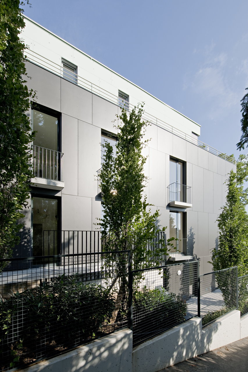 Ein klarer Kubus, drei Wohngeschoße zur Strasse, zwei bergseitig und ein Terrassengeschoß. Die vorgehängten hinterlüfteten Fassaden sind zur Strasse aus Alupaneelen, die Ost und Westseiten aus Eternit Grosstafeln, die mit Licht und Sonne von ganz hell bis glitzernd Anthrazit changieren. Das Terrassengeschoss ist mit Emailglas verkleidet. Die Südfassade mit vorgelagerten Loggien und Terrassen ist in Glas aufgelöst.