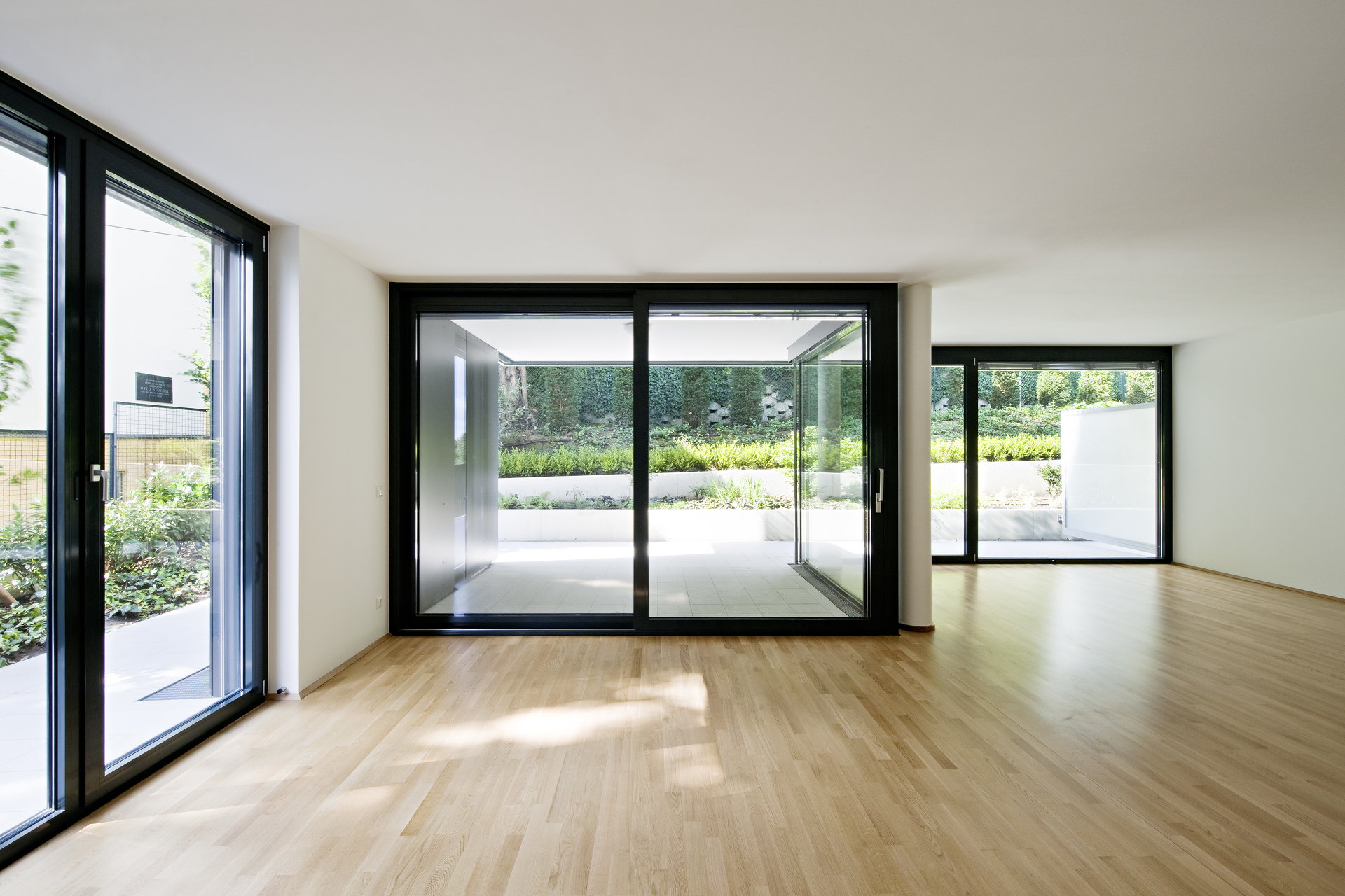 Die drei Geschosse bestehen jeweils aus zwei Wohnungen mit Wohn- Essbereich und Freiraum, einer separaten Küche sowie zwei bis drei Zimmern. Durchgehend raumhohe Fenstertüren, nach Ost und West mit nur 40 cm tiefen Minibalkonen.