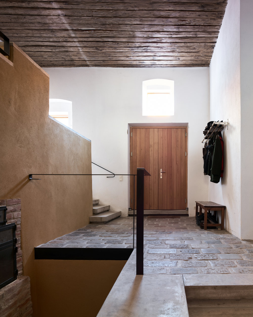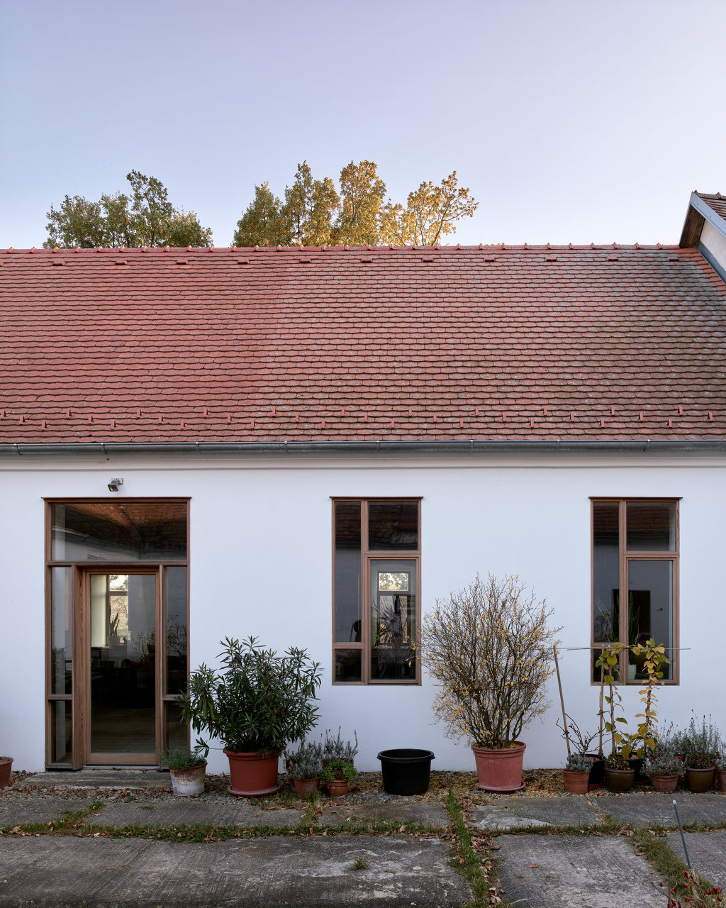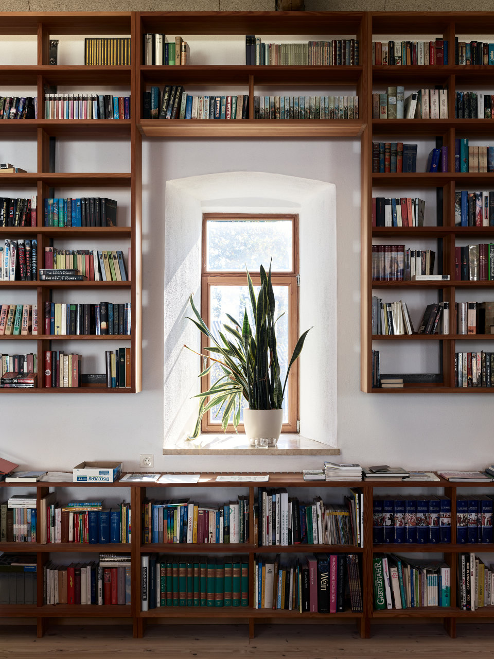 Im nördlichen Waldviertel fegen eisige Winterstürme nahezu ungehindert über die leergeräumte Landschaft, die Ortschaften ducken sich tief in die Mulden und Senken, Kirchturmspitzen zeigen sich oft erst beim Näherkommen. Dort oben, nahe an der tschechischen Grenze, hat sich ein Paar ein Refugium geschaffen und das älteste und wohl auch stattlichste Haus im Ort zu seinem Rückzugsort gemacht. Einst war das alte Haus Gutshof und Vorposten des Stiftes Geras, wovon ein gut erhaltener Wehrturm im Gebäudeverband Zeugnis ablegt, später eine einfache Landwirtschaft mit Stallgebäuden, Scheunen sowie einer kleinen Schmiede. Der bereits renovierte Wohntrakt aus dem 19. Jahrhundert wird von der Bauherrschaft bewohnt, der geschlossene Vierseithof als abgeschiedenes Wochenenddomizil genutzt. Nun ist ein weiterer Ausbau geplant: der ehemalige Kuhstall soll Heimstatt für Bücher werden: Über 2000 Bände aus ihren privaten Beständen will die Bauherrschaft dort in einer Bibliothek vereinen.Der Stall, teils aus mächtigen Granitsteinen gemauert, ist bei Planungsbeginn ein gedrungener, dunkler Raum. Das zentrale Problem der zukünftigen Bibliothek besteht in der unbefriedigenden Anbindung an das Haupthaus: der Zugang erfolgt über eine kellerartige, unattraktive Zwischenzone. Die räumliche Lösung für die neue Situation ist zwingend: Durch Abbruch der Zwischendecke mit darüber befindlicher, ehemaliger Mehlkammer, Verlegung des Haupteingangs und Verkürzung der Trennwand zum Gang auf Parapethöhe entsteht eine großzügige Eingangshalle. Sie bildet als zentraler Verteiler einen Schwellenraum, dessen adaptierte Topographie die verschiedenen Niveaus angrenzender Räume erschließt. Mit seinem Bodenbelag aus Granitsteinen erscheint er wie ein überdachter, beinahe mittelalterlich anmutender Platz. Von Eingang kommend gelangt man rechts über einen ansteigenden Gang zu Bad, Schlafzimmer und Küche, links betritt man die Bibliothek, die als hoher, lichtdurchfluteter Raum ausreichend Platz zum Arbeiten, Wohnen und Lesen bietet. Sämtliche Bücher werden in einem großen Regalelement, das eine ganze Längswand ausfüllt, zusammengefasst. Die bunten, dichtgereihten Buchrücken verleihen dem strengen Großraum eine heitere Note. Große Öffnungen schaffen den visuellen Bezug zum Innenhof, ein großzügiges Oberlicht bringt die Nachmittagssonne in den Raum. Die angrenzende, ehemalige Futterkammer wird zur abtrennbaren Gästeeinheit mit Teeküche, Badezimmer und eigenem Zugang. Eine an der Rückseite des Traktes angebaute Saunakammer, die sich in das große Volumen der angrenzenden Scheune schiebt, komplettiert das Raumangebot.