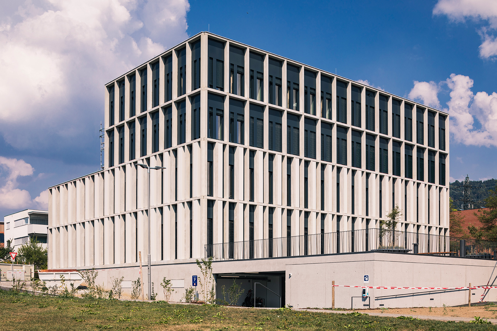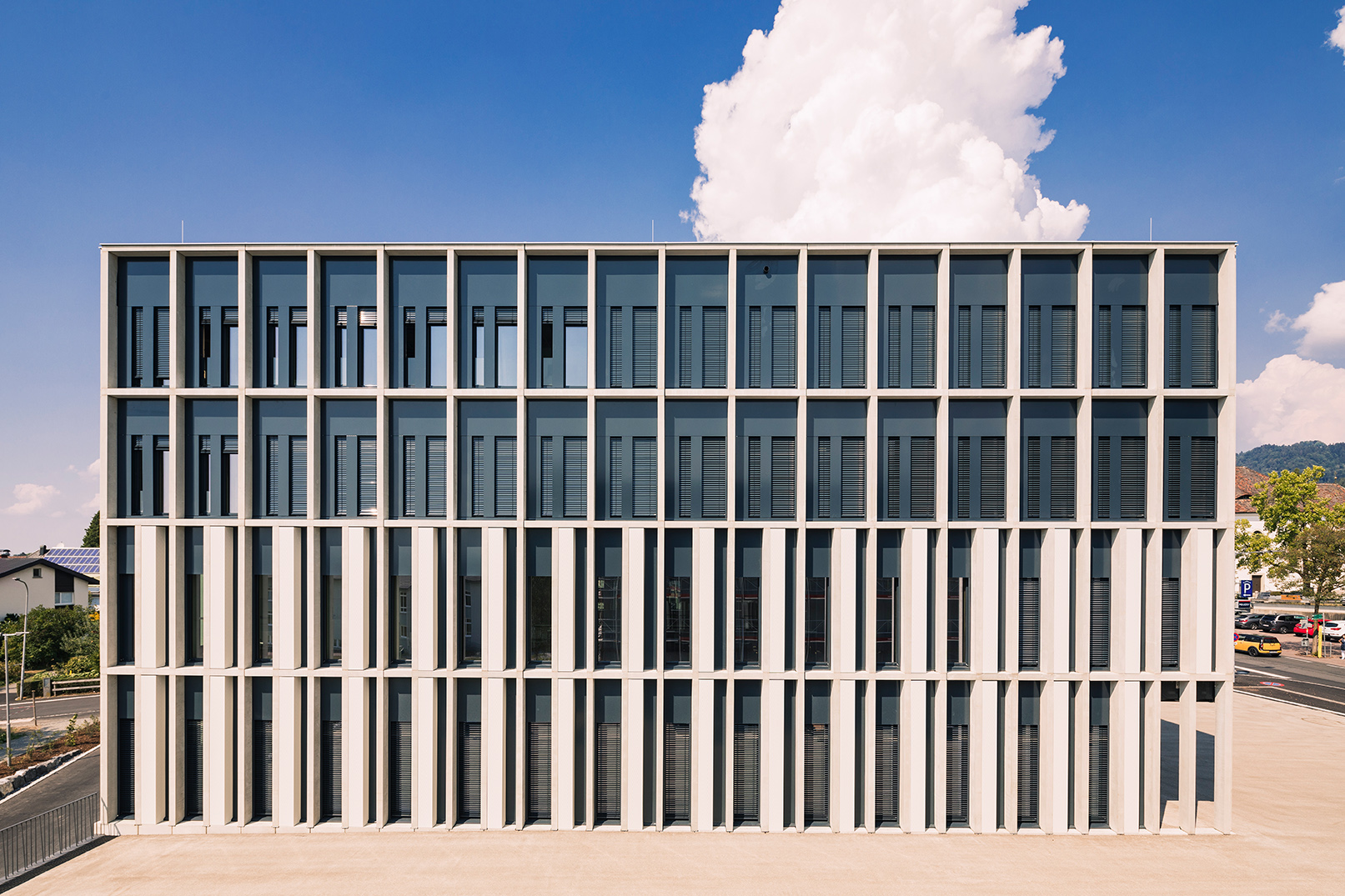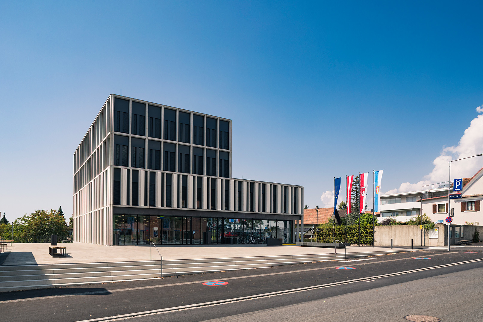 Die Neigung des Grundstücks wurde genutzt, um Gebäude, Bushaltestelle und Tiefgarage formal unangestrengt und barrierefrei miteinander in Verbindung zu bringen. Der Baukörper passt sich in seiner Höhenentwicklung dem unmittelbaren Umfeld an: zweigeschoßig nach Norden, viergeschoßig entsprechend der Nachbarbebauung im Süden. Eine weitere Differenzierung wird durch die Gliederung der Fassade vorgenommen. Offen und transparent zeigt sich die Eingangszone Richtung Platz, ansonsten umhüllt ein enges, vorgesetztes Raster aus Fertigbetonteilen und Lüftungsflügeln die beiden „Sockelgeschoße“ des Objekts. Im Raster etwas ausgedünnt und dadurch in seiner Wirkung leichter, sitzt oben das Stahlbetonskelett der beiden Stockwerke des „Turms“ auf.