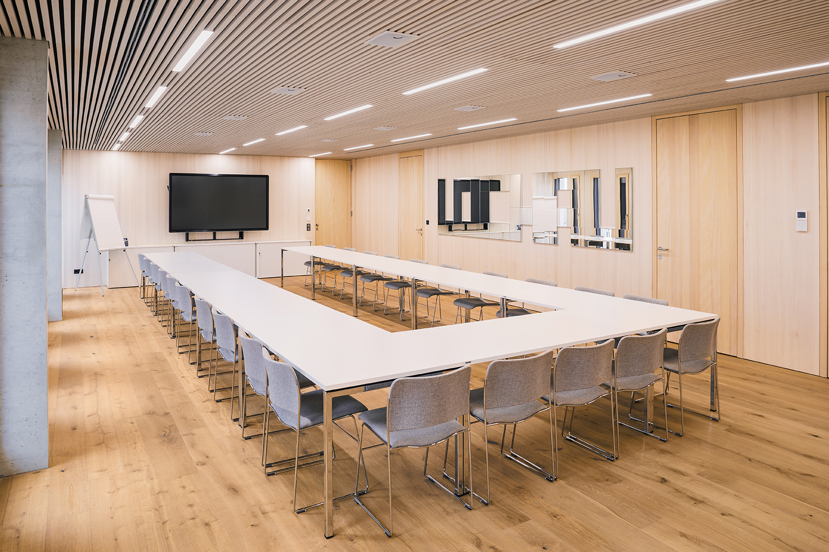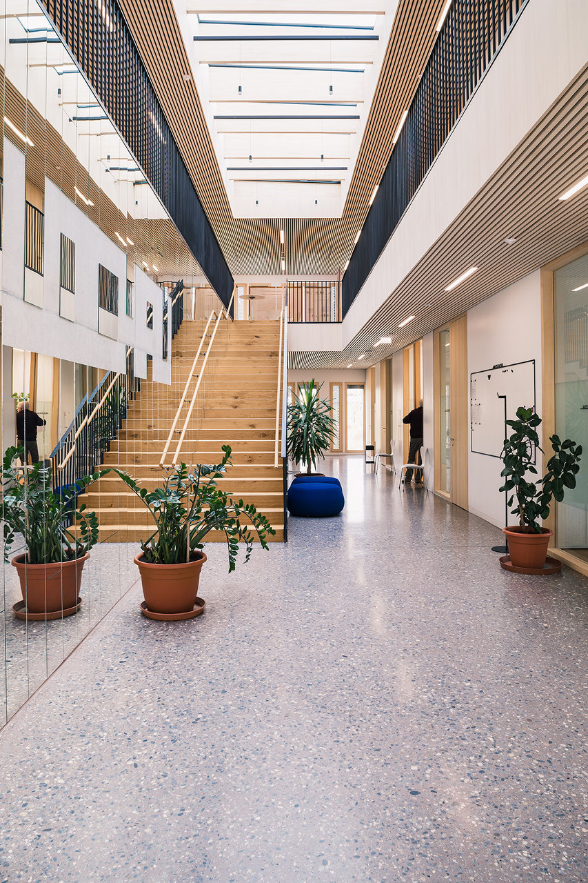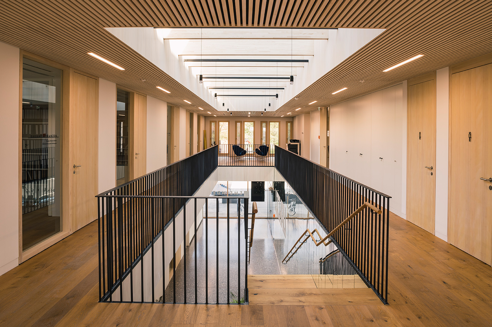 Foyer und Eingangsbereich im Inneren sind mit Empfang und zentraler Treppe unter dem langen Oberlichtband klar strukturiert und einladend gestaltet. Terrazzo, Holz in Natur und – bei Fenstern und Decken – in dezent weißen Abtönungen sorgen für ein helles, angenehm wohnliches Arbeitsklima. Die Wand längs des Treppenaufgangs wurde von Gerold Tagwerker gestaltet: Über die gesamte Höhe bis hinauf zur umlaufenden Galerie verspiegelt, lässt sich als Ausnehmung in abstrakten Lettern „LOCHAU“ erkennen. Die entnommenen Spiegelteile finden sich im Sitzungssaal der Gemeinde im ersten Stock als gegengleiches Schriftbild an der Wand. (Text: Tobias Hagleitner)