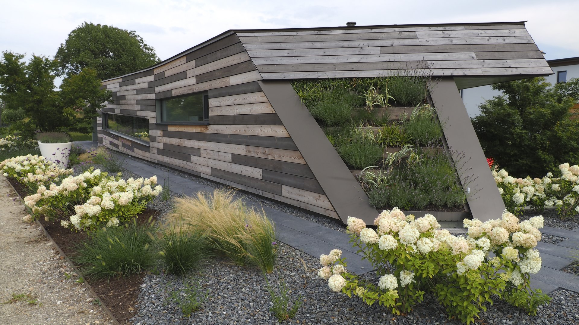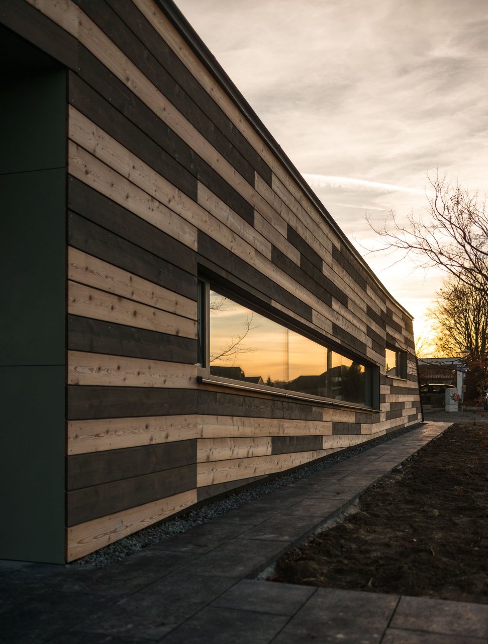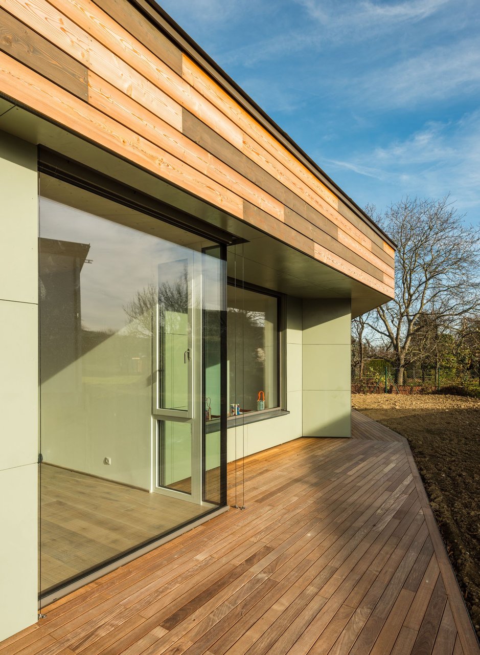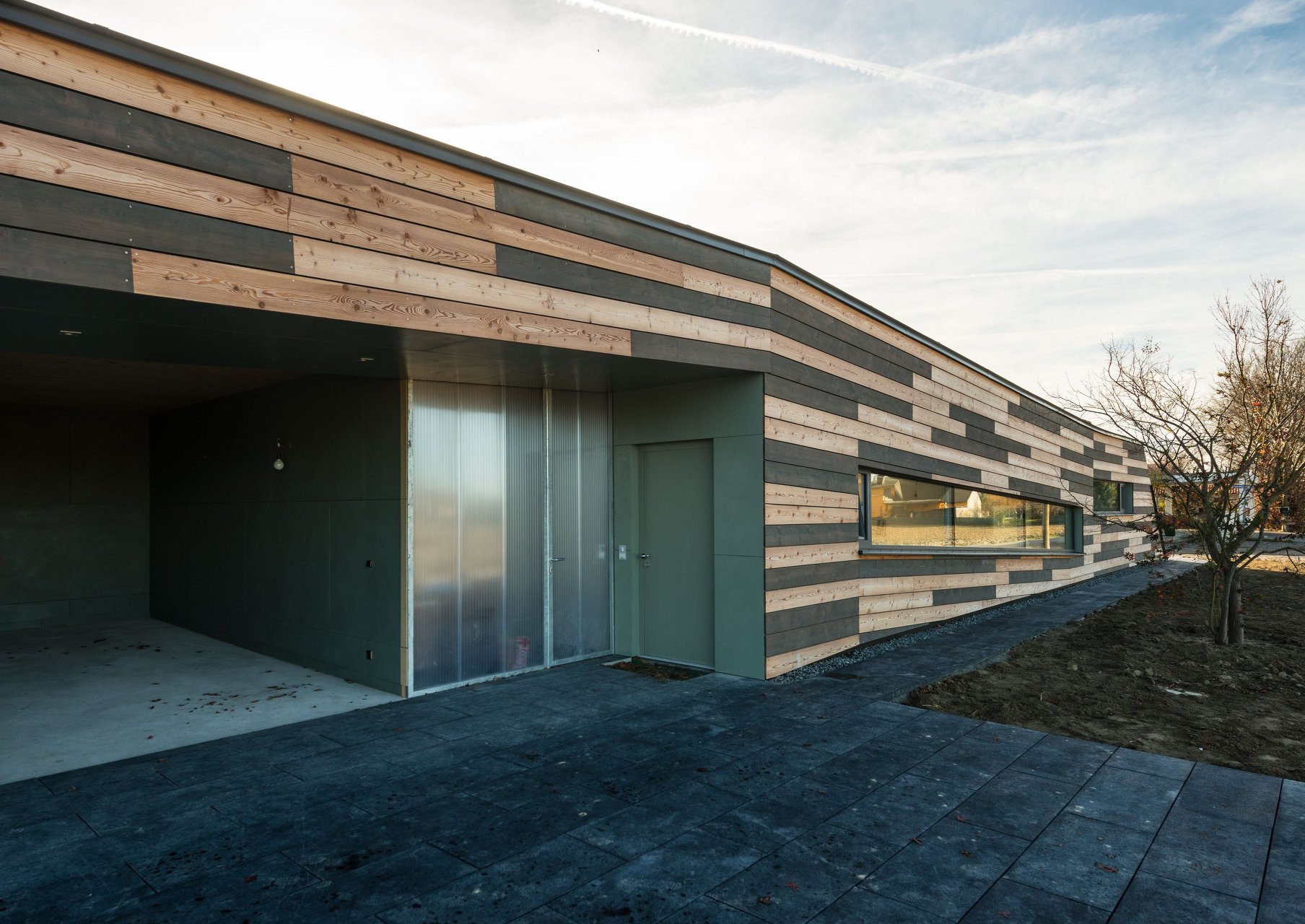 Die Fassade ist als hinterlüftete Lärchenschalung bzw. hinterlüftete Verkleidung aus großformatigen Holzwerkstoffplatten (Tricoya-MDF) ausgeführt. Ein Teil der Lärchenholzschalung wurde unbehandelt belassen, der andere Teil wurde mit einer dunklen Öllasur (Teervitriol) beschichtet. Die Plattenverkleidung wurde mit Leinölfarbe färbig beschichtet. Die Ausführung des Daches erfolgte als extensiv begrüntes Warmdach mit einer Gefälledämmung. (Text: Architekt:innen)