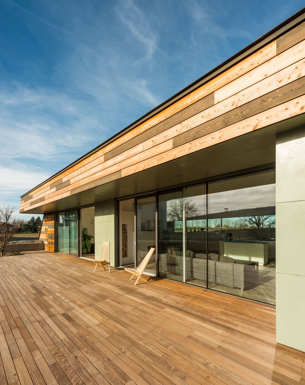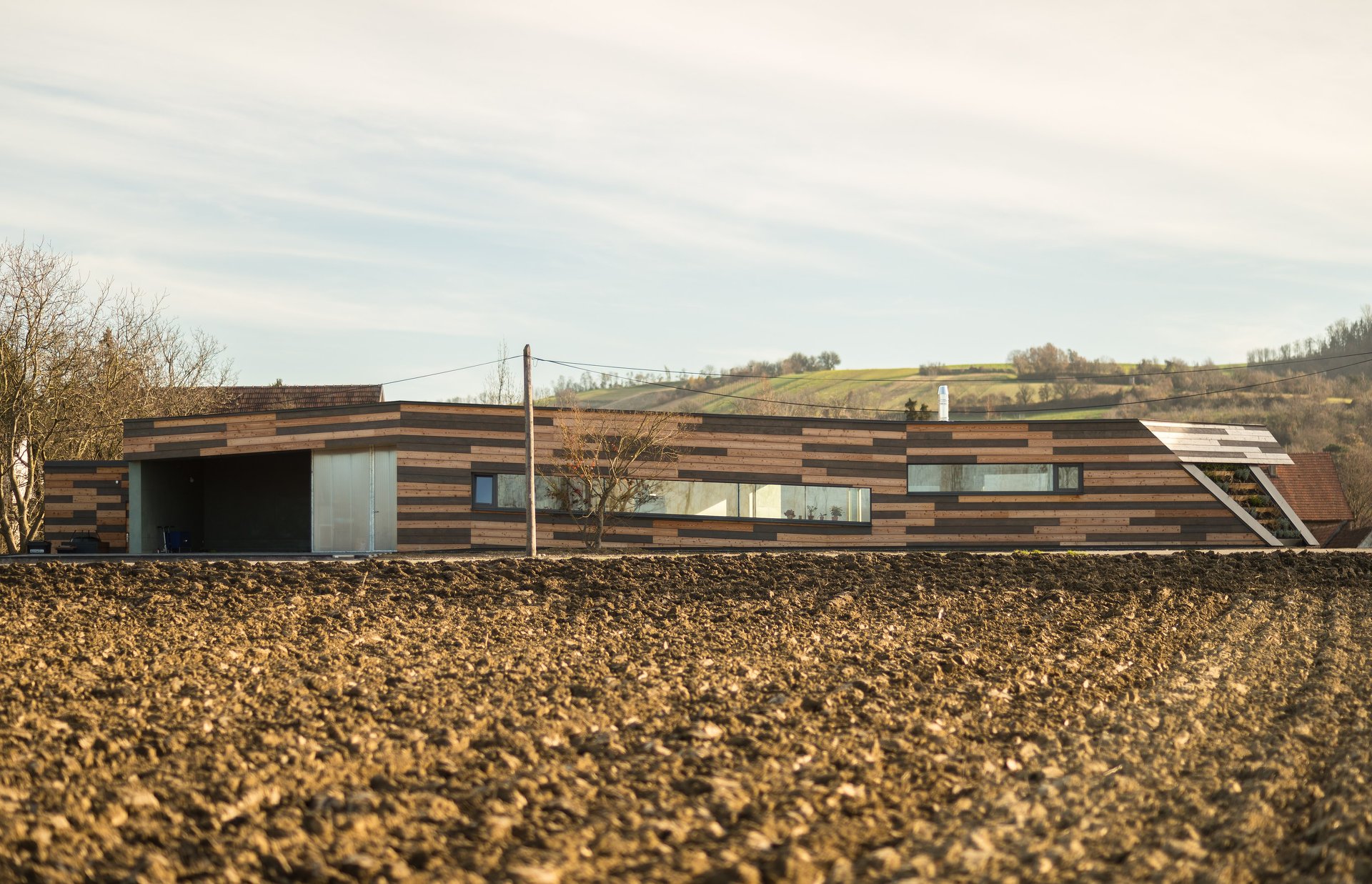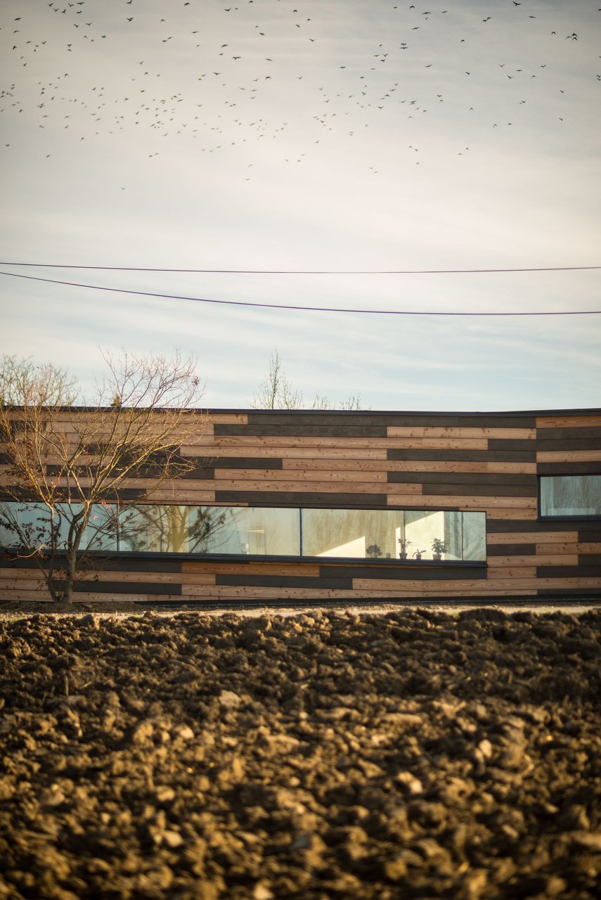 Flach duckt sich das Haus im Wind und am Feld - mit der Umgebung soll es eins werden - die Fassade aus zweifärbigen, horizontal gelegten Lärchenholzbrettern löst das Haus von Weitem gesehen in der Umgebung auf.