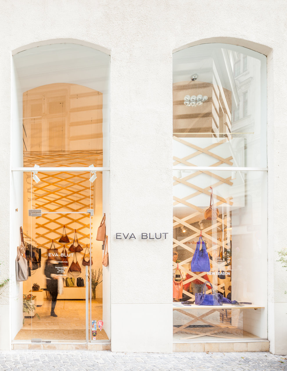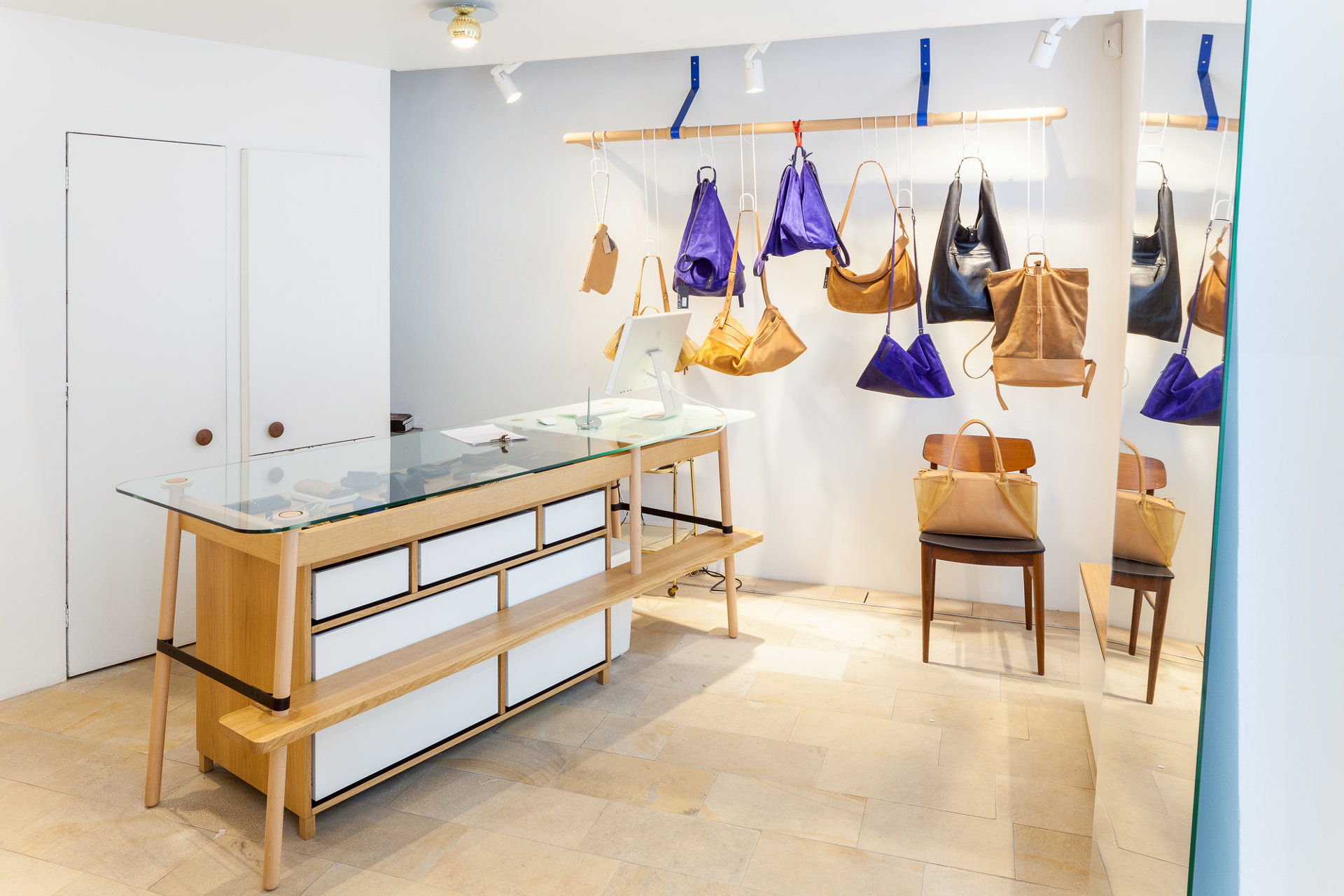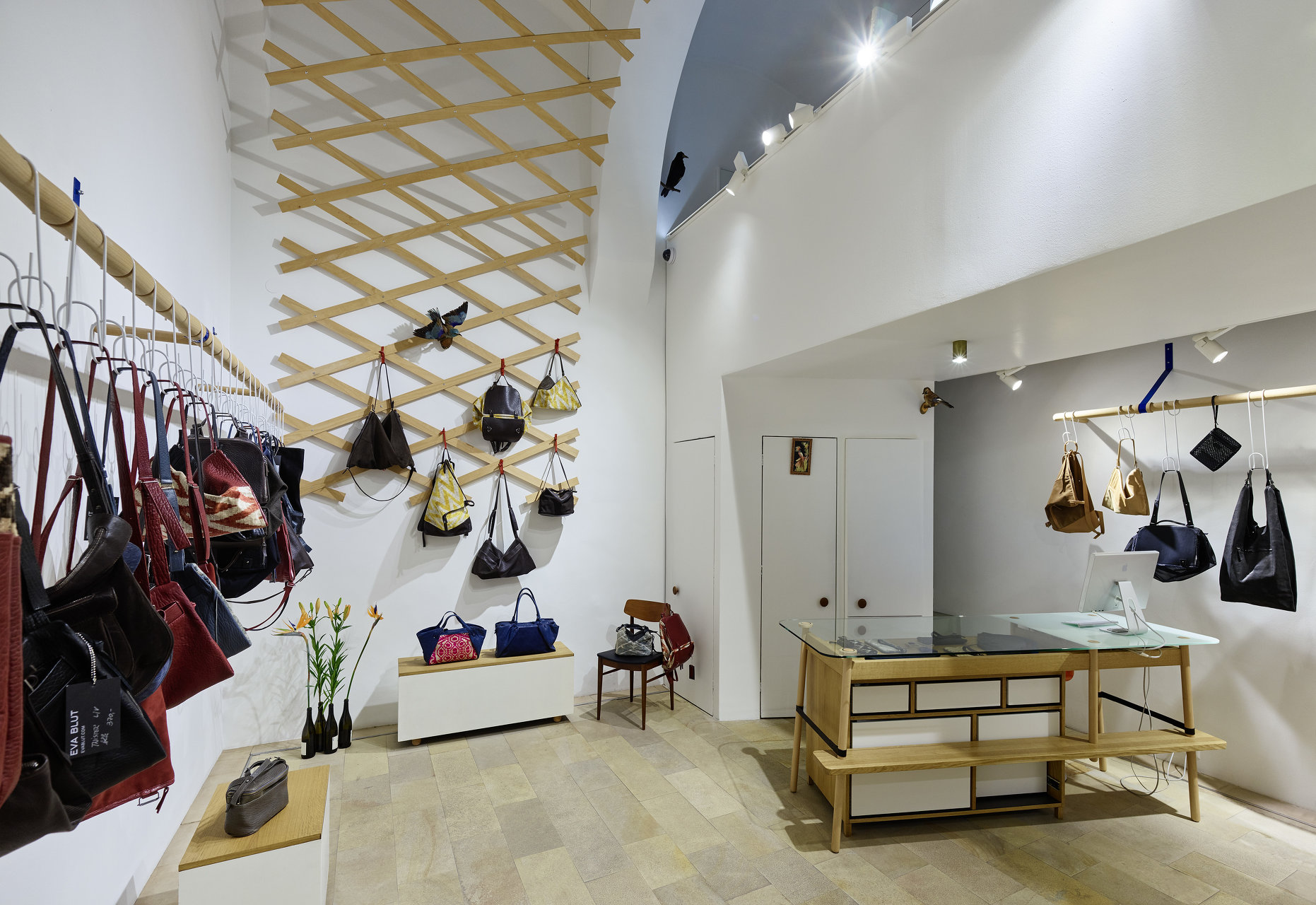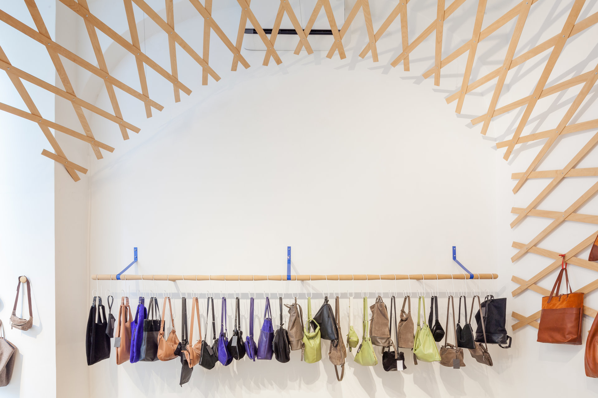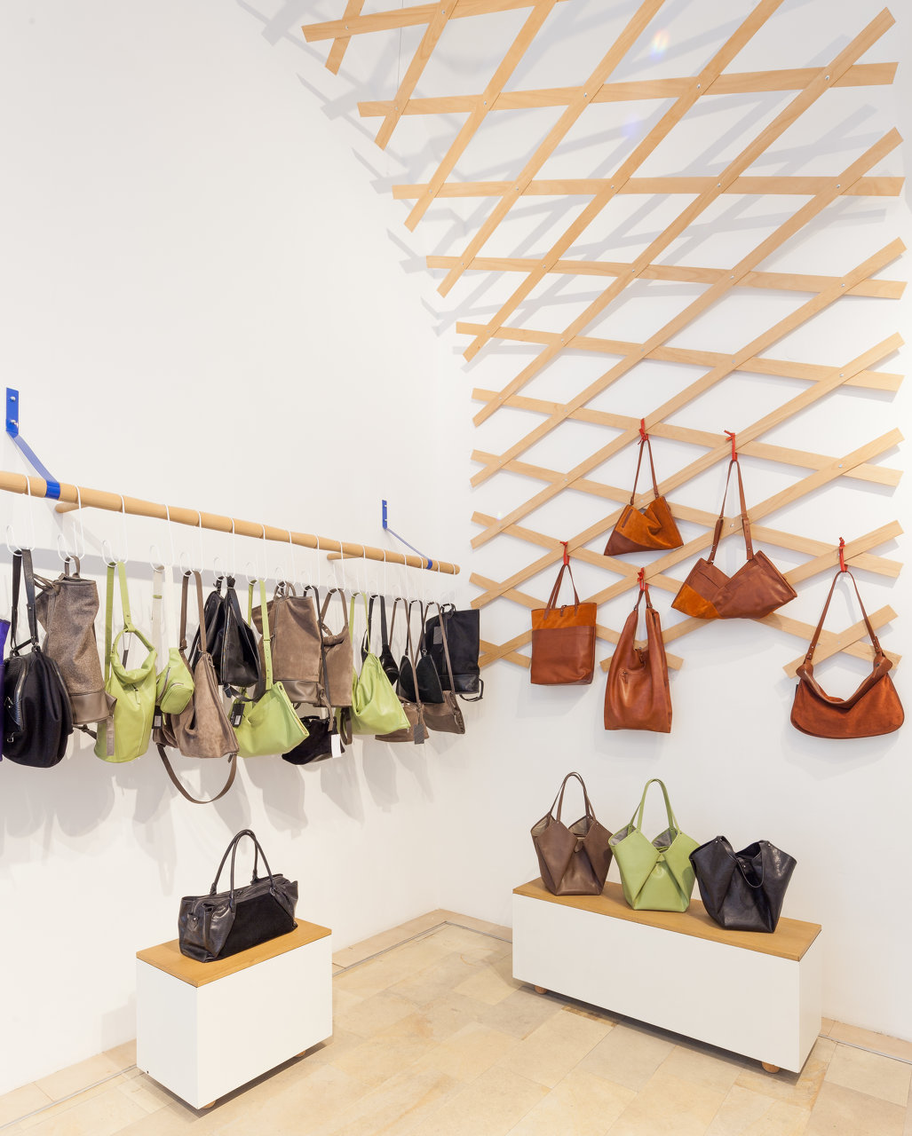Ein gekrümmtes Netz aus dünnem Buchensperrholz überspannt als Baldachin den hohen Teil des Innenraums. Ein zweites Netz hängt am Parapet der Galerie und bildet den Hintergrund des Schaufensters. Die Taschen können mit Lederschlaufen an den Netzen befestigt werden.
