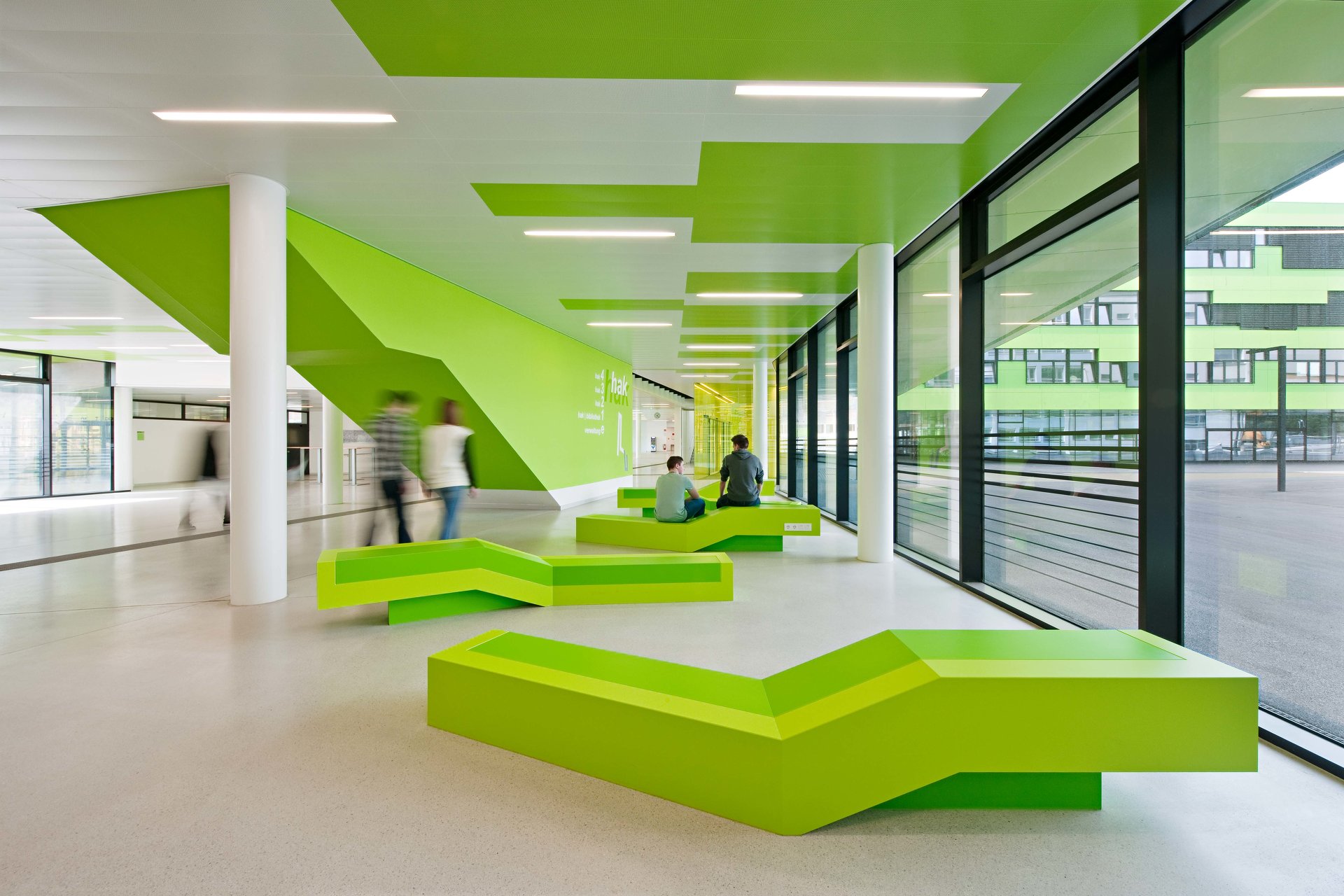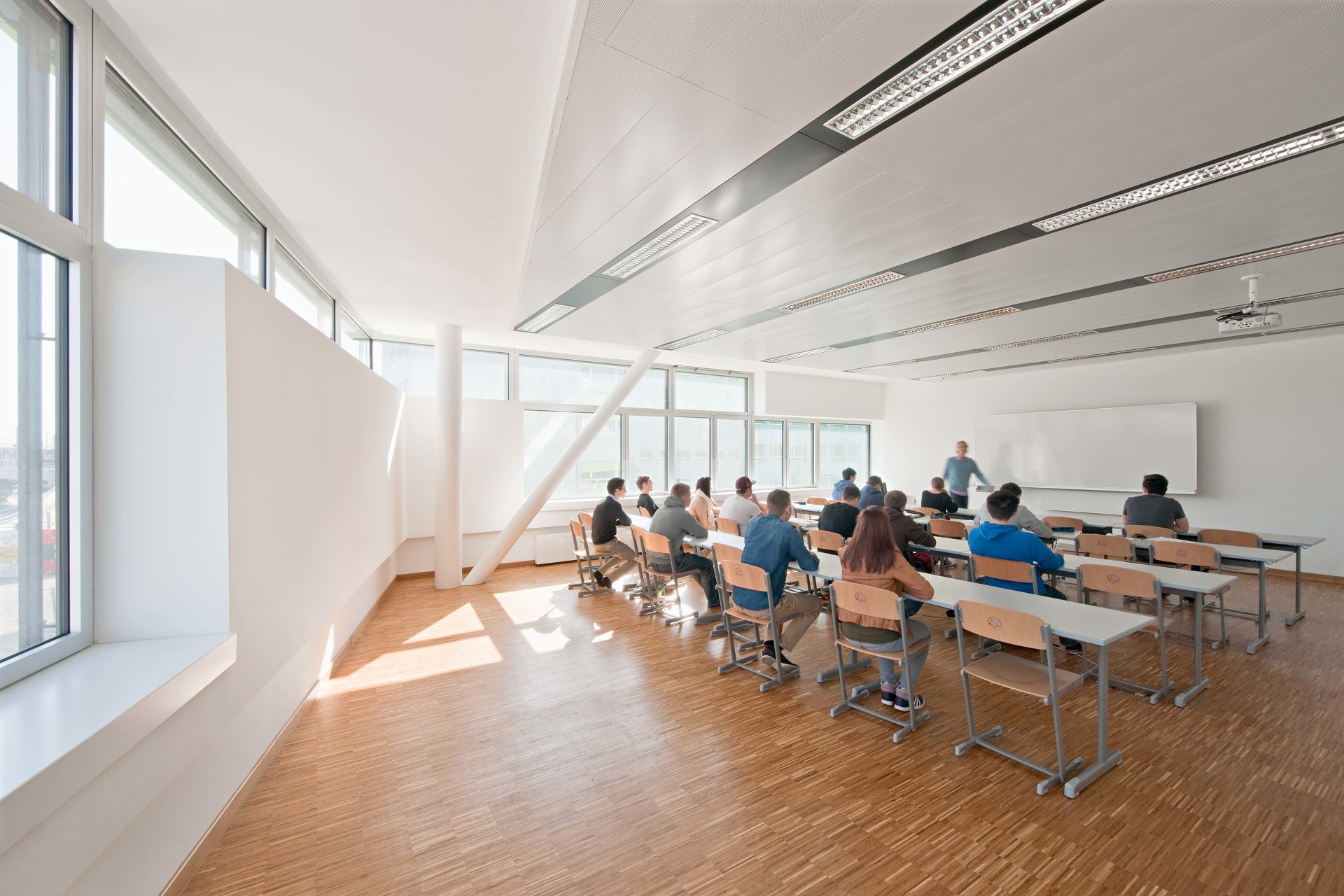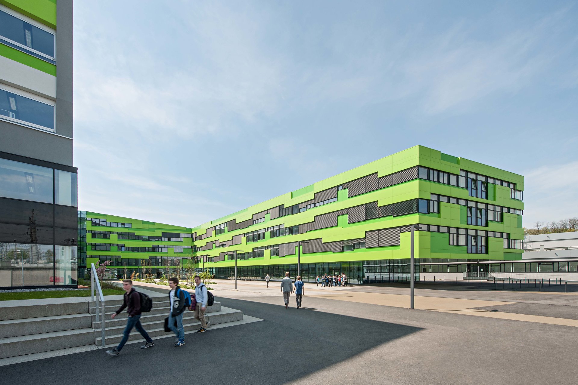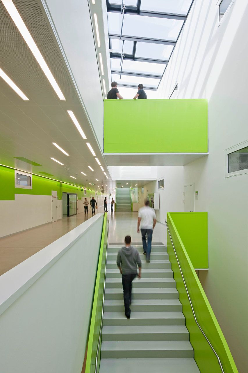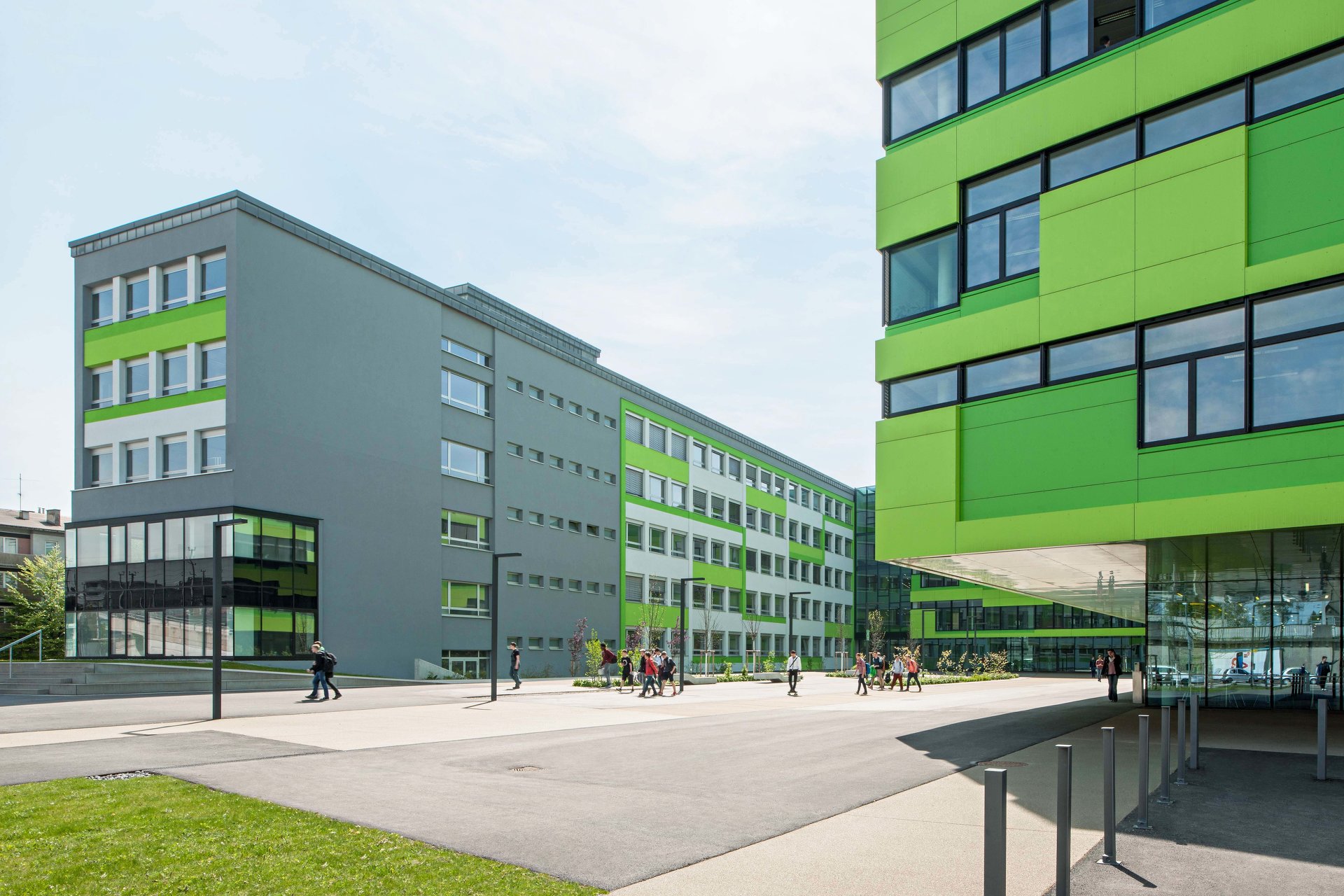 Durch die Erweiterung des Bundesschulzentrums St. Pölten entsteht ein identitätsstiftender weitreichender Schulcampus. Der Neubau wird in deutlicher Formensprache zwischen HAK und HTL gesetzt und führt die Typologie der Bestandsgebäude weiter. Die Erweiterung konnte bei laufendem Schulbetrieb erfolgen. Über den großzügigen Vorbereich gelangt man nun in die gemeinsame Eingangshalle. Diese funktioniert als Bindeglied zu allen Bereichen. Hier befinden sich auch die öffentlichen Einrichtungen. Eine Besonderheit des Campus ist der durchlässige Kommunikationsfreiraum, der zu Gesprächen und zum Austausch einlädt. Daran grenzen die Erschließungshalle, Mensa, Vortragssäle und die Bibliothek an. Über Freitreppen gelangen die Schüler:innen zu den Unterrichtsräumen in den Obergeschossen.Die Sanierung des Bundeschulzentrums beinhaltet die Fassadengestaltung und Überarbeitung der Funktionen der Unterichtstrakte von HTL und HAK, der gemeinsamen Turnsäle sowie der Werkstätten-, Labor- und der KFZ-Hallen der Versuchsanstalt. In diesen Bereichen werden auch die Gebäudeinstallationen sicherheitstechnisch auf Stand gebracht. Auch die Werkstätten-Dächer mit 6.500 m² Fläche werden saniert, und mit einem von der Universität für Bodenkultur Wien entwickelten System für extensive Begrünung zur Rückhaltung von Regenwasser erneuert und rund 220 m² Gründach im Versuch der Boku ohne zusätzliche Dämmung „semi-intensiv“ begrünt. Auch am Parkplatz gibt es bepflanzte „Drain-Gartenelemente“. (Text: Architekt:innen, bearbeitet)