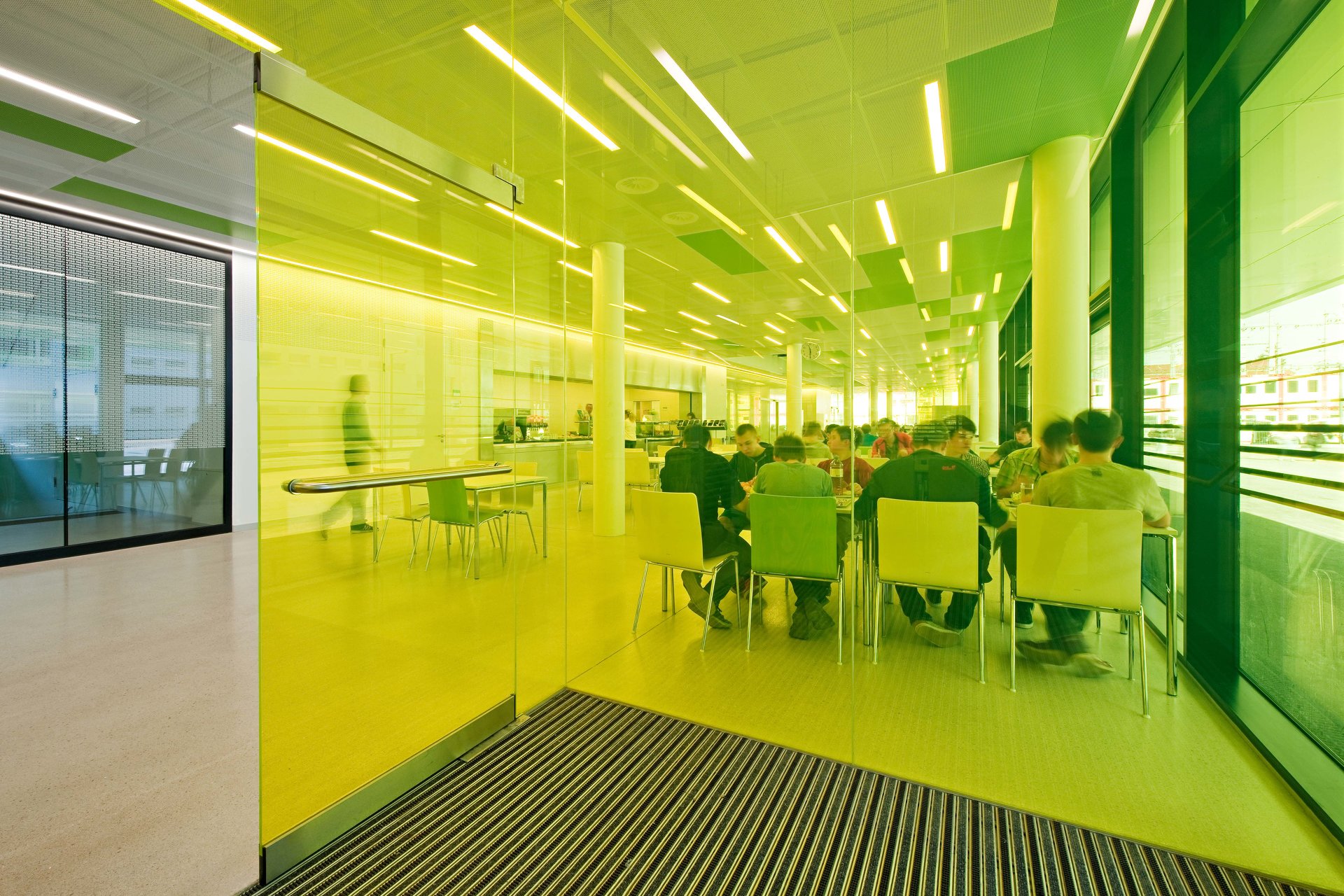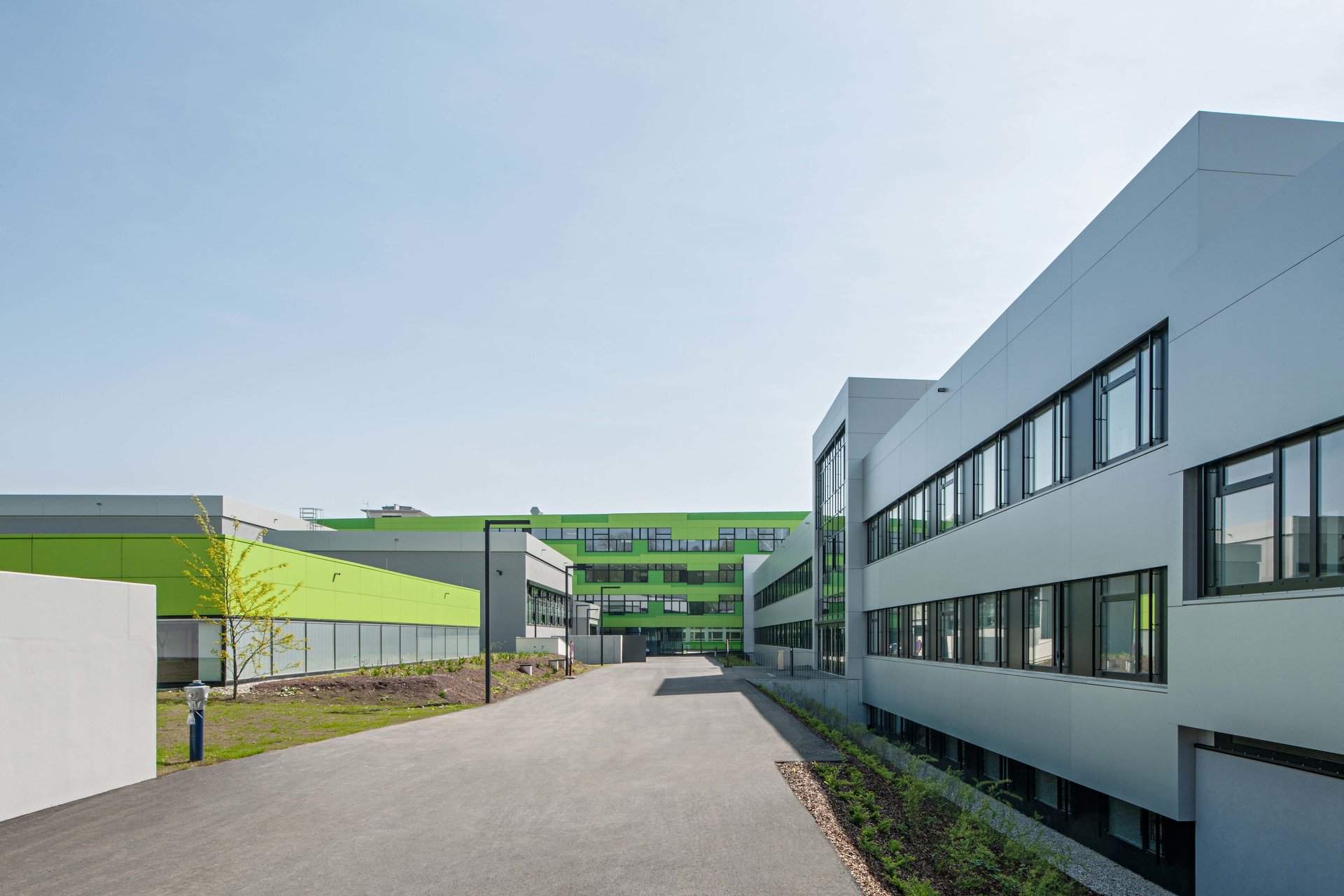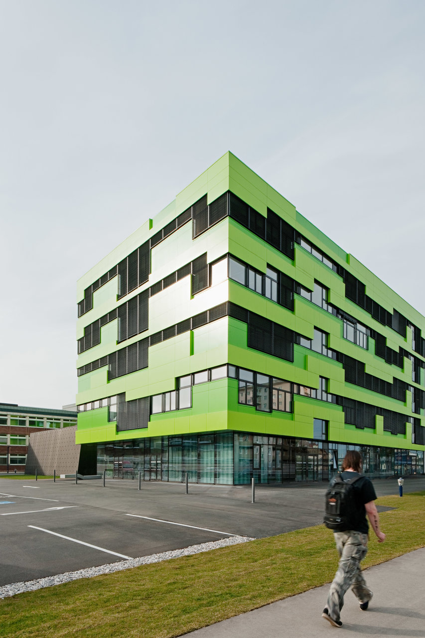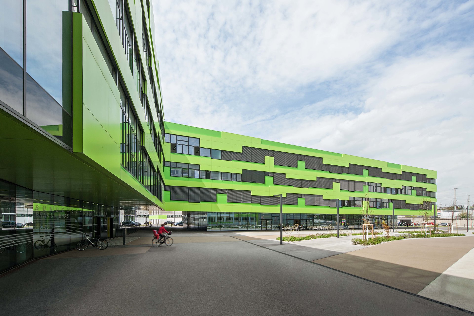 Durch die Erweiterung des Bundesschulzentrums St. Pölten entsteht ein identitätsstiftender weitreichender Schulcampus. Der Neubau wird in deutlicher Formensprache zwischen HAK und HTL gesetzt und führt die Typologie der Bestandsgebäude weiter. Die Erweiterung konnte bei laufendem Schulbetrieb erfolgen. Über den großzügigen Vorbereich gelangt man nun in die gemeinsame Eingangshalle. Diese funktioniert als Bindeglied zu allen Bereichen. Hier befinden sich auch die öffentlichen Einrichtungen. Eine Besonderheit des Campus ist der durchlässige Kommunikationsfreiraum, der zu Gesprächen und zum Austausch einlädt. Daran grenzen die Erschließungshalle, Mensa, Vortragssäle und die Bibliothek an. Über Freitreppen gelangen die Schüler:innen zu den Unterrichtsräumen in den Obergeschossen.Die Sanierung des Bundeschulzentrums beinhaltet die Fassadengestaltung und Überarbeitung der Funktionen der Unterichtstrakte von HTL und HAK, der gemeinsamen Turnsäle sowie der Werkstätten-, Labor- und der KFZ-Hallen der Versuchsanstalt. In diesen Bereichen werden auch die Gebäudeinstallationen sicherheitstechnisch auf Stand gebracht. Auch die Werkstätten-Dächer mit 6.500 m² Fläche werden saniert, und mit einem von der Universität für Bodenkultur Wien entwickelten System für extensive Begrünung zur Rückhaltung von Regenwasser erneuert und rund 220 m² Gründach im Versuch der Boku ohne zusätzliche Dämmung „semi-intensiv“ begrünt. Auch am Parkplatz gibt es bepflanzte „Drain-Gartenelemente“. (Text: Architekt:innen, bearbeitet)