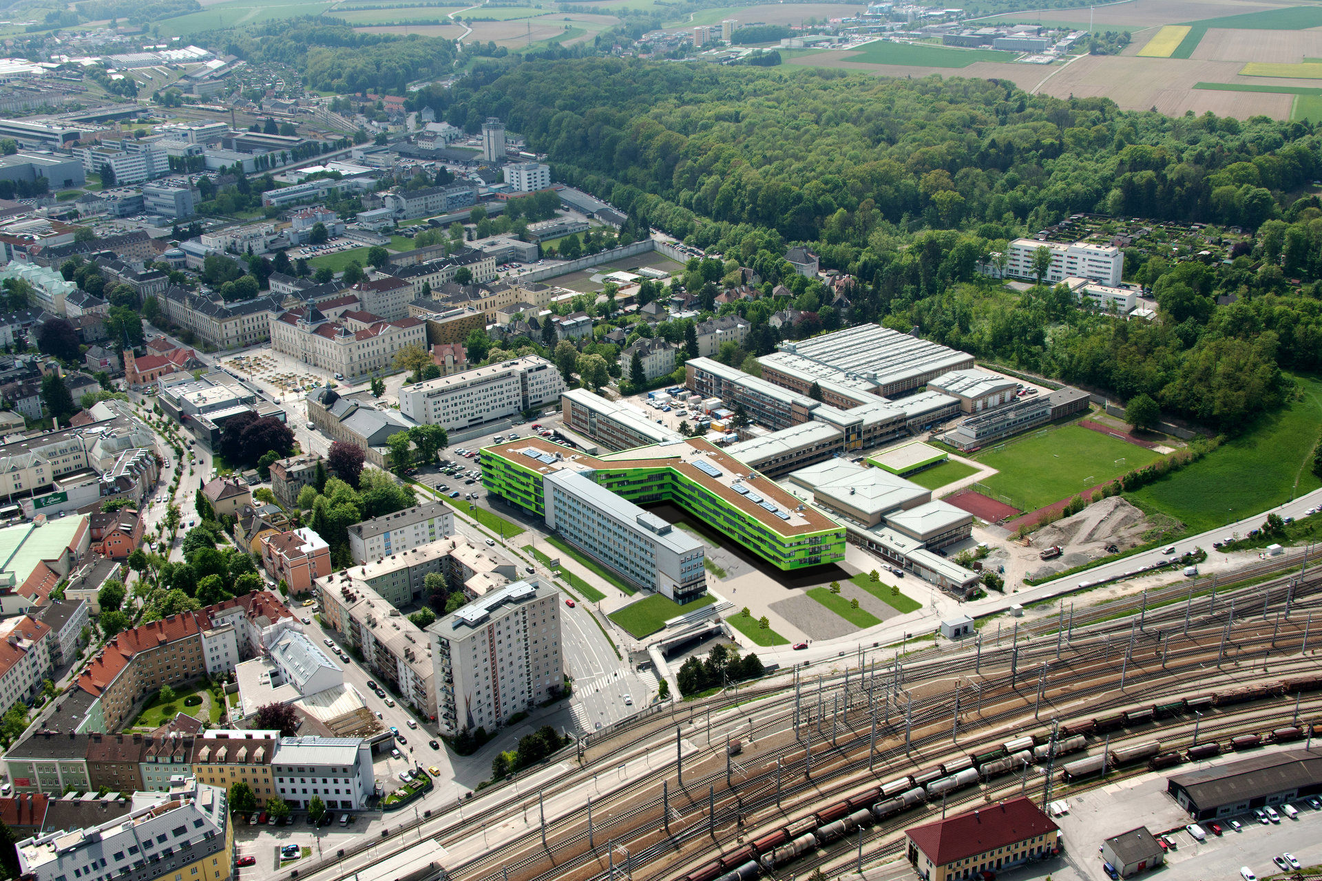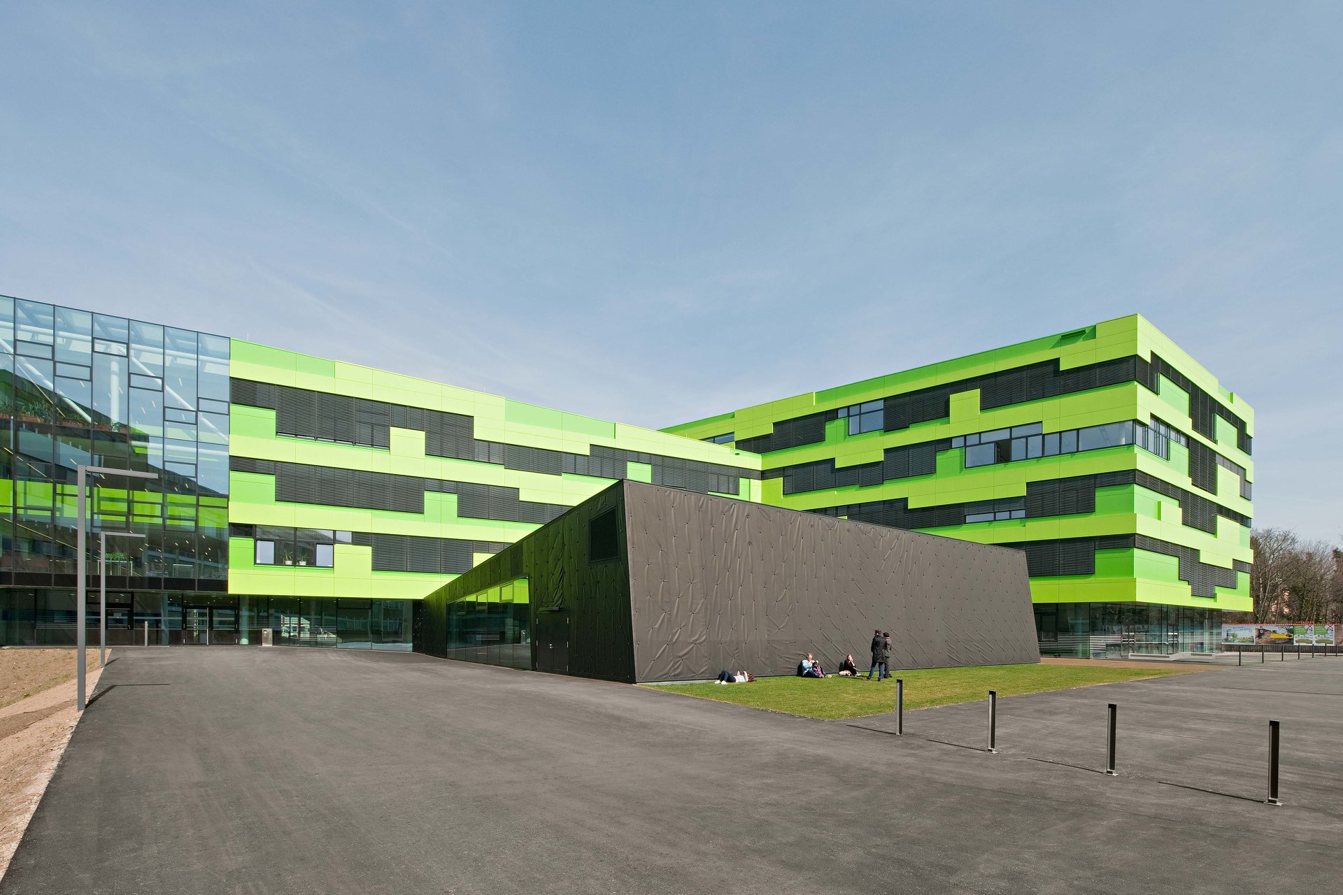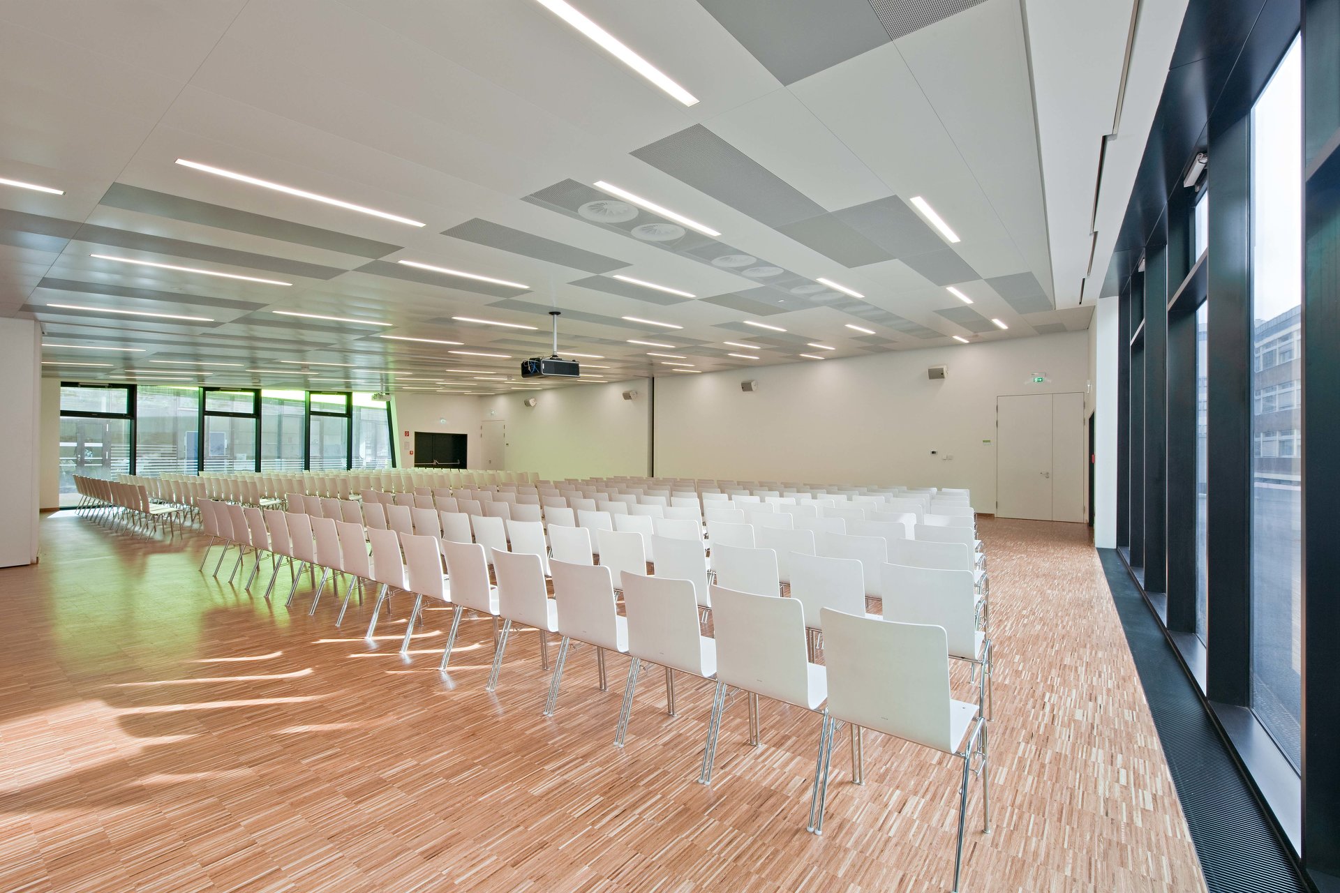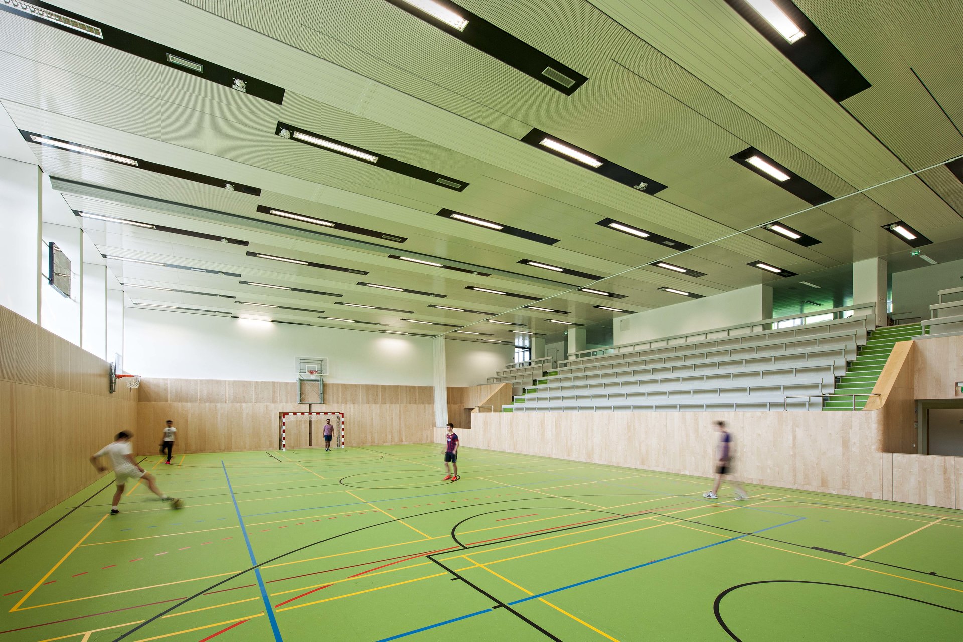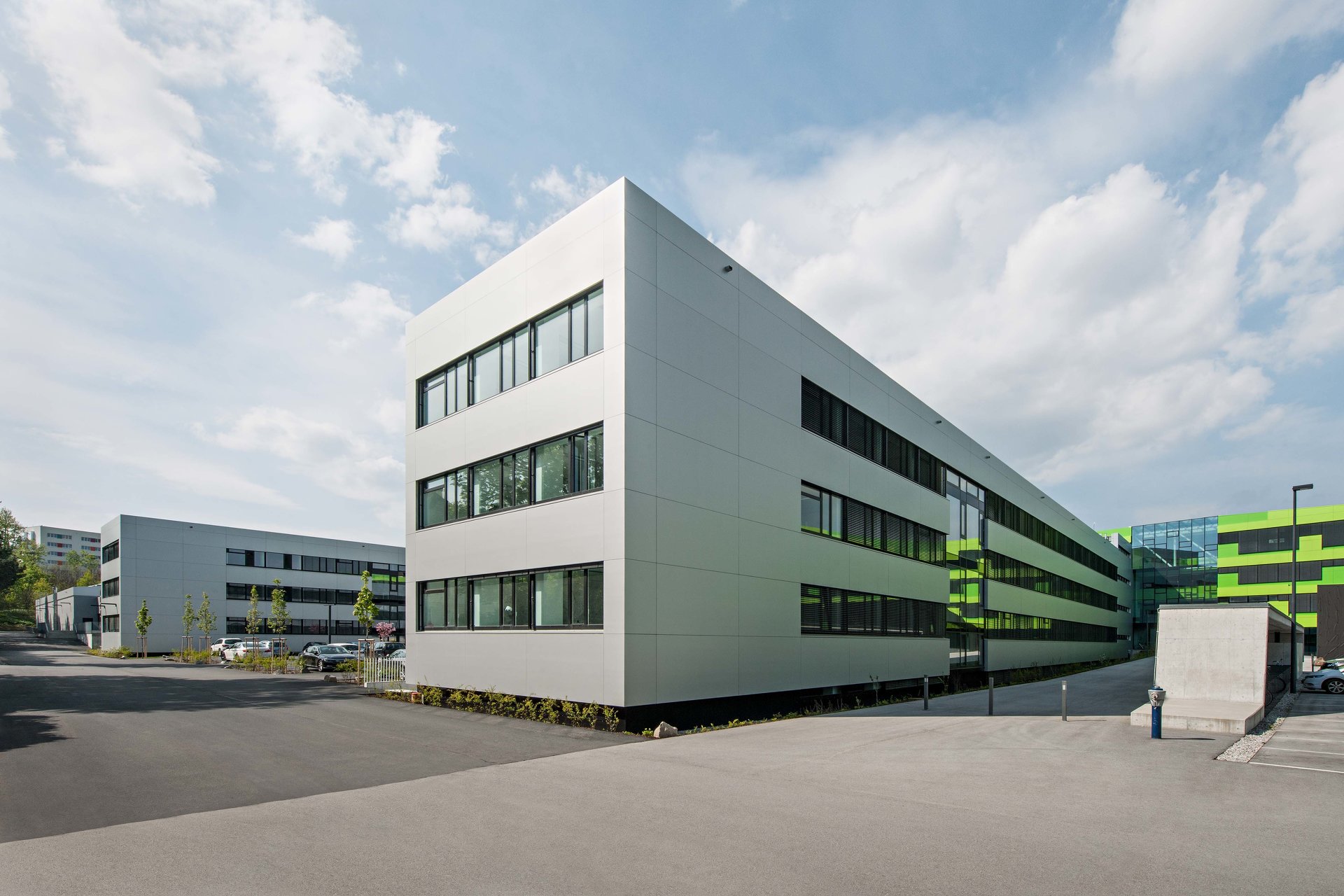 Durch die Erweiterung des Bundesschulzentrums St. Pölten entsteht ein identitätsstiftender weitreichender Schulcampus. Der Neubau wird in deutlicher Formensprache zwischen HAK und HTL gesetzt und führt die Typologie der Bestandsgebäude weiter. Die Erweiterung konnte bei laufendem Schulbetrieb erfolgen. Über den großzügigen Vorbereich gelangt man nun in die gemeinsame Eingangshalle. Diese funktioniert als Bindeglied zu allen Bereichen. Hier befinden sich auch die öffentlichen Einrichtungen. Eine Besonderheit des Campus ist der durchlässige Kommunikationsfreiraum, der zu Gesprächen und zum Austausch einlädt. Daran grenzen die Erschließungshalle, Mensa, Vortragssäle und die Bibliothek an. Über Freitreppen gelangen die Schüler:innen zu den Unterrichtsräumen in den Obergeschossen.Die Sanierung des Bundeschulzentrums beinhaltet die Fassadengestaltung und Überarbeitung der Funktionen der Unterichtstrakte von HTL und HAK, der gemeinsamen Turnsäle sowie der Werkstätten-, Labor- und der KFZ-Hallen der Versuchsanstalt. In diesen Bereichen werden auch die Gebäudeinstallationen sicherheitstechnisch auf Stand gebracht. Auch die Werkstätten-Dächer mit 6.500 m² Fläche werden saniert, und mit einem von der Universität für Bodenkultur Wien entwickelten System für extensive Begrünung zur Rückhaltung von Regenwasser erneuert und rund 220 m² Gründach im Versuch der Boku ohne zusätzliche Dämmung „semi-intensiv“ begrünt. Auch am Parkplatz gibt es bepflanzte „Drain-Gartenelemente“. (Text: Architekt:innen, bearbeitet)