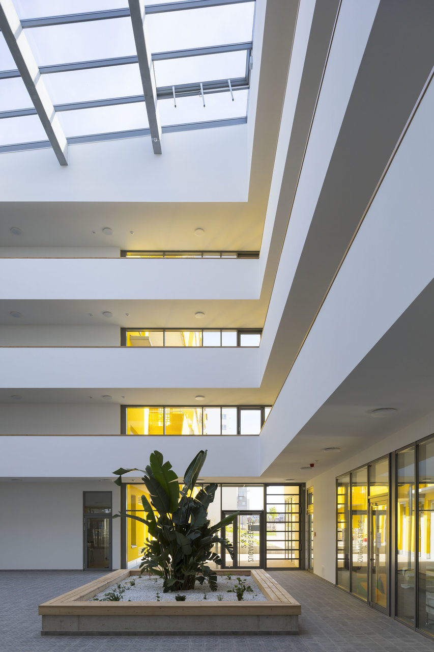 Es gibt eine kommunikative Seite des Gebäudes mit Hauptzugang, Seminarraum und Senioren-Wohngemeinschaft sowie eine privatere Seite mit Freibereichen, Kleinkinderspielplatz und Schwimmbad.