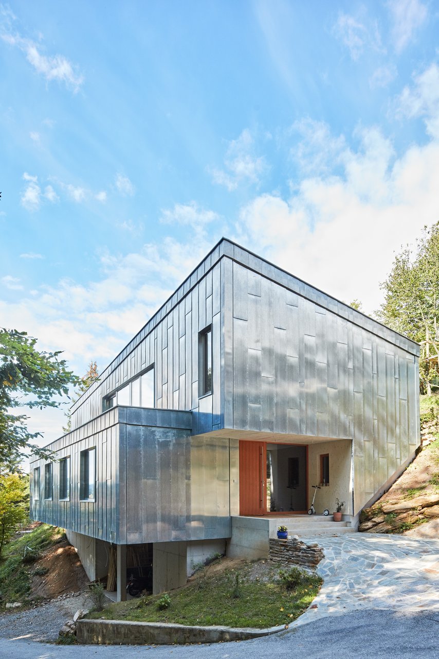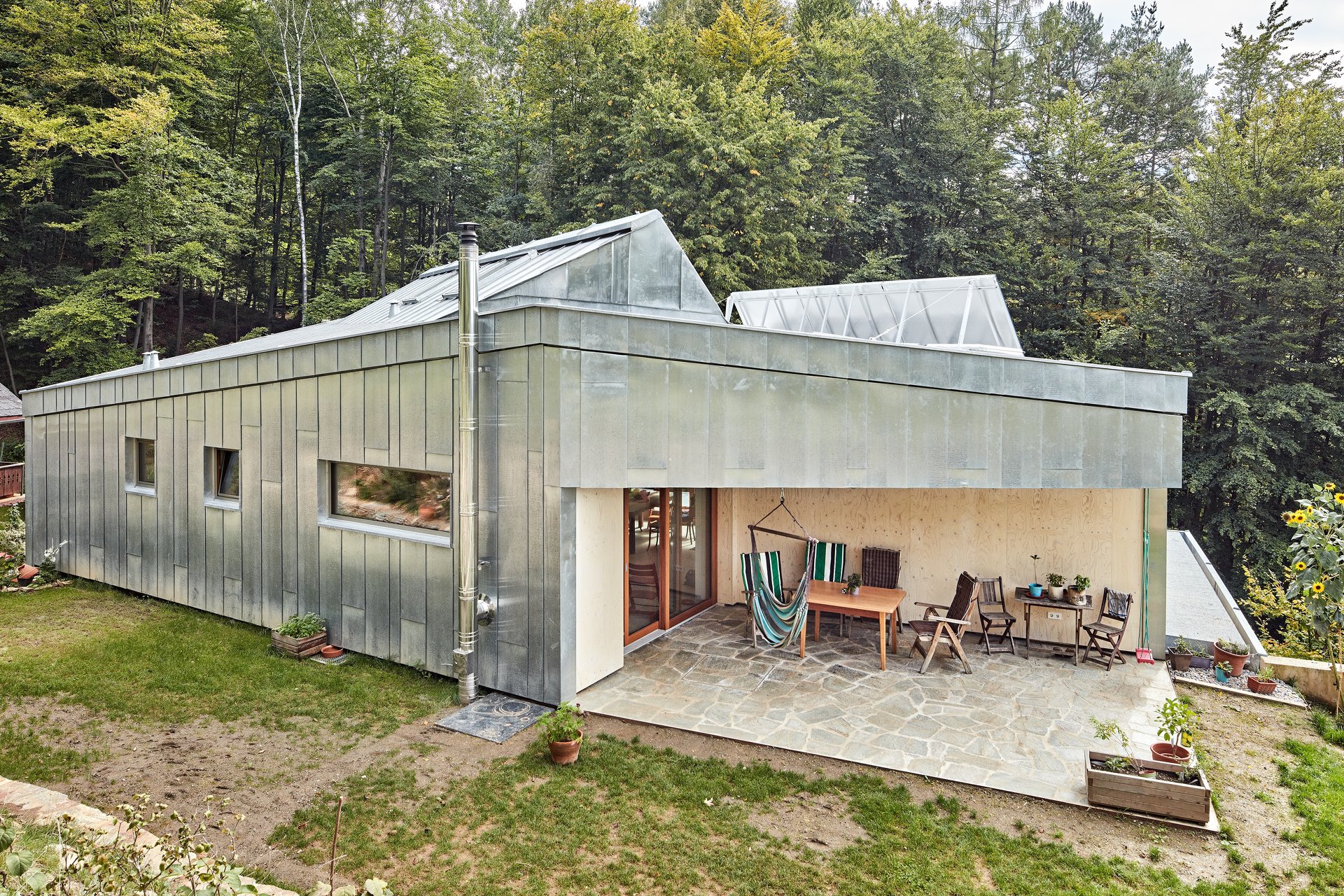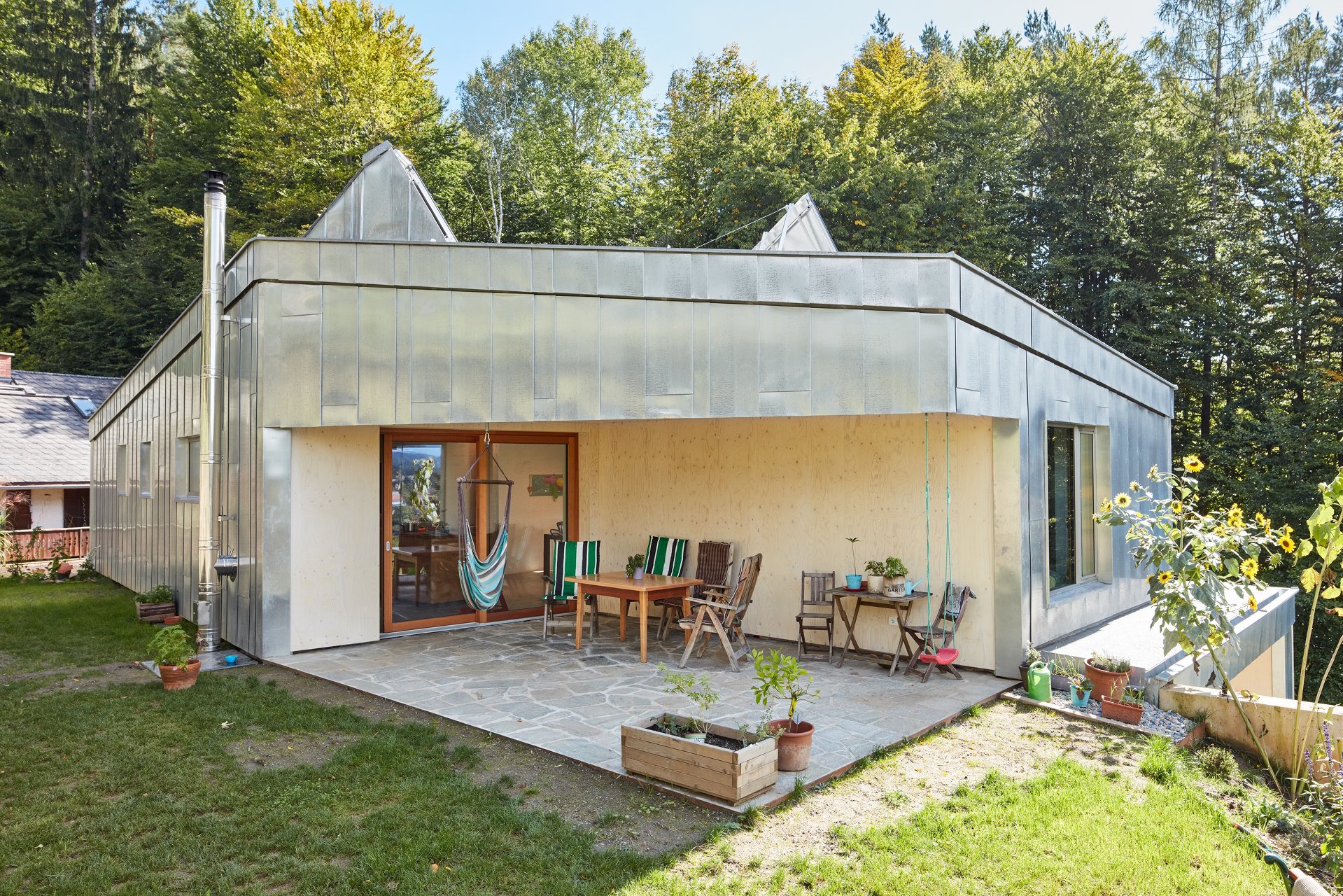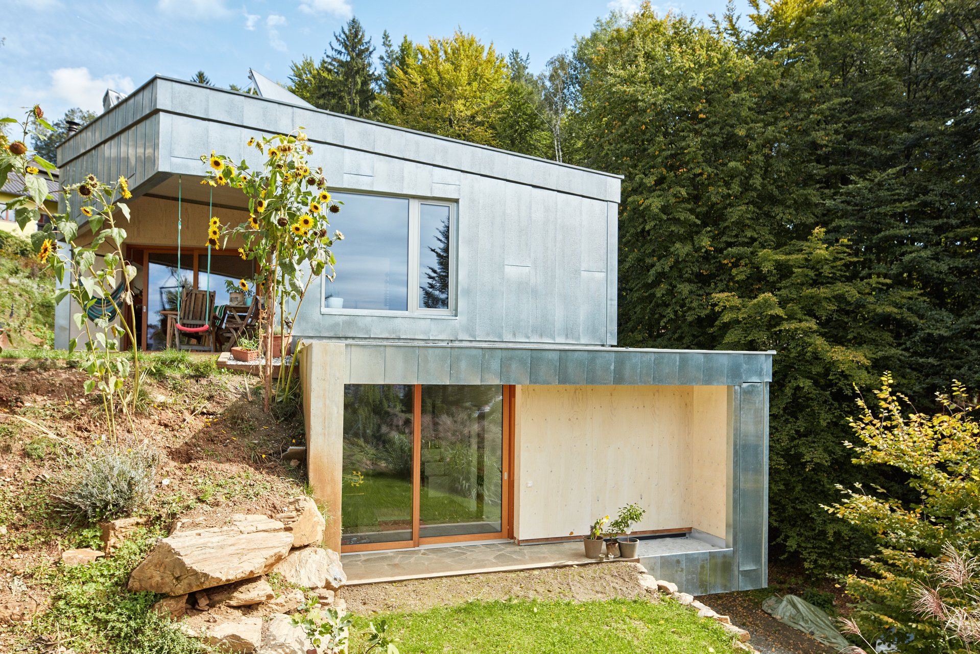 Als Dämmmaterial für erdberührende Bodenflächen dient Glasschaumschotter. Ansonsten wird mit Strohballen gedämmt. Eine hinterlüftete Holzverschalung bildet die Basis für die Zinkfassade. Die unterschiedlich breiten Bahnen wurden im Werk gekantet und bauseits nur mehr montiert. Die Konditionierung des Hauses erfolgt ausschließlich über einen einfachen Küchenherd der auch zum Kochen dient und einer Solaranlage. Diese beiden Komponenten speisen zwei „Pufferspeicher“ die über eine Fußbodenheizung die Wärme auch zeitverzögert verteilen können. Die Solaranlage deckt in etwa 45% des jährlichen Heiz- und Warmwasserverbrauchs. (Text: Architekt:innen, bearbeitet)