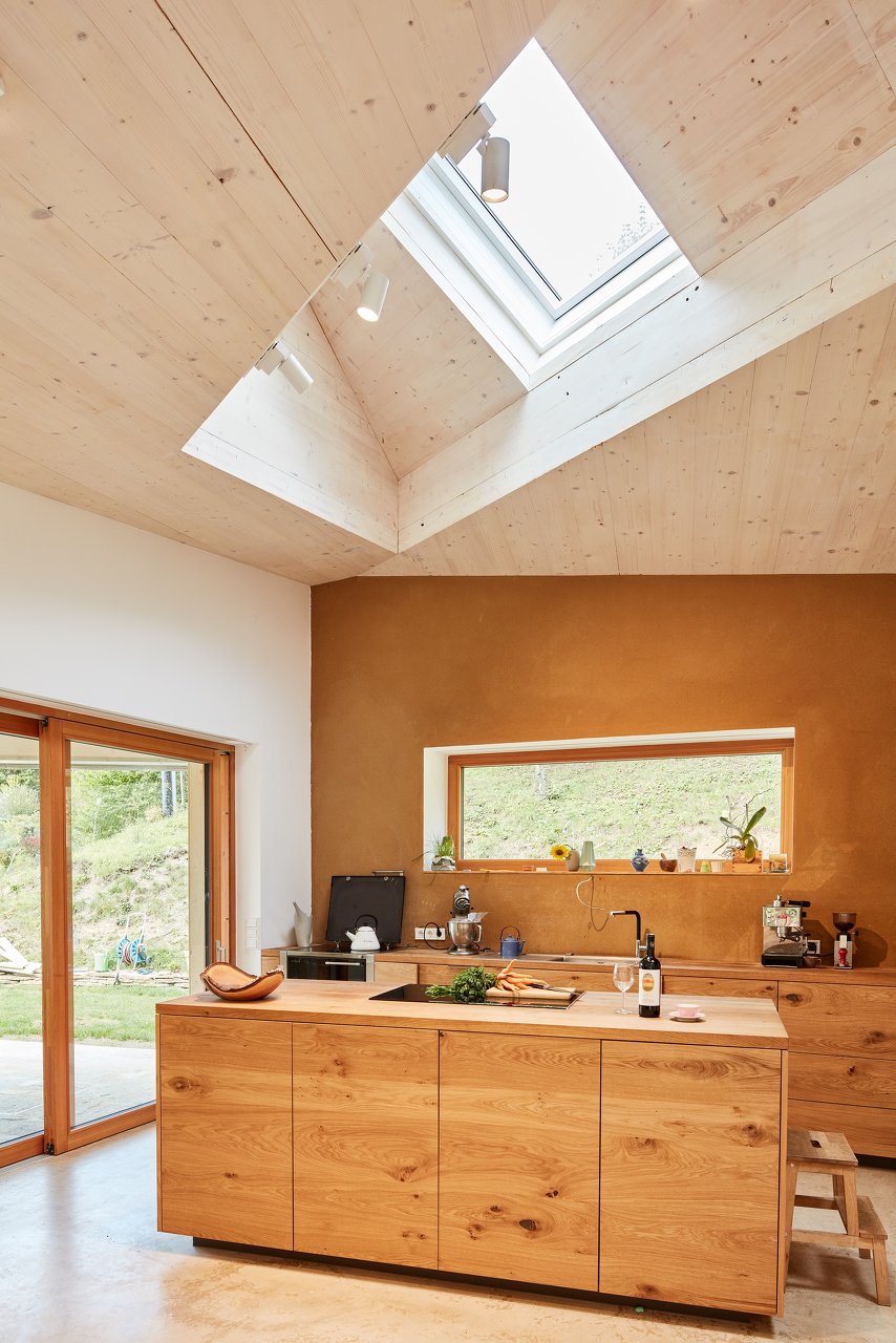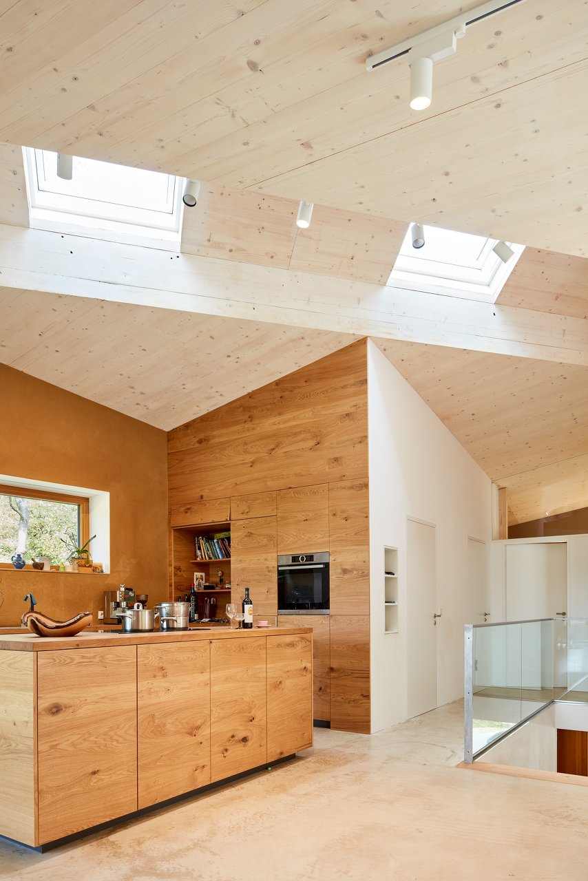 Die Deckenflächen sind roh in Holzoptik mit weißer, zarter Lasierung gegen Vergilben, die Wände mit Lehm verputzt. Möbelelemente, wie die in der Küche, werden raumbildend integriert. Die Fronten aus massiver, geölter Eiche reichen bis zur Decke. Über die nördlich ausgerichteten Dachflächenfenster erfolgt eine schöne, gleichmäßige Belichtung des Wohnbereichs.