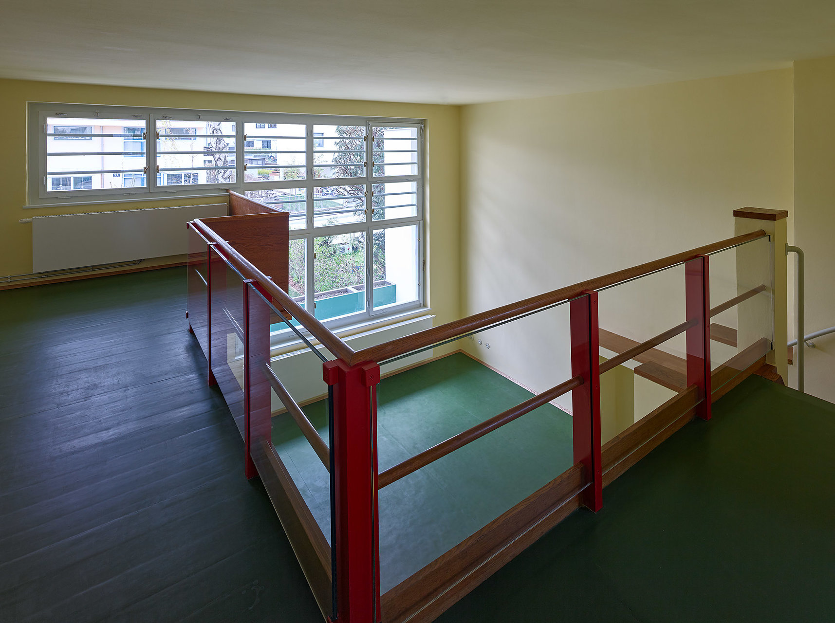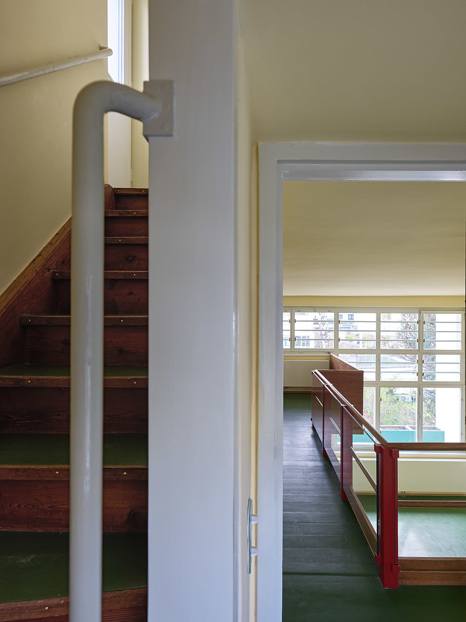 Am Beginn der umfassenden Sanierung stand eine gründliche Befundung mit Analyse, Fotodokumentation und Neuvermessung des Gebäudes. Mit einer mikroskopischen Untersuchung analysierte man in einer regelrechten „Archäologie der Moderne“ das Material in allen historischen Schichten, um Zustand und Farbigkeit der überdurchschnittlich gut erhaltenen originalen Substanz zu ermitteln. Bei der Sanierung des Linoleumbodens griff man auf die Erfahrungen aus dem Haus Rietveld zurück. Für die thermische Sanierung dienten kompensierende Maßnahmen, da eine Außendämmung aus Denkmalschutzgründen nicht möglich war. Wie bei allen Häuser der Werkbundsiedlung wurde nur das Kellergeschoß außen gedämmt und das feuchte Mauerwerk trockengelegt, weiters das Dach isoliert, die ursprünglichen Einzelöfen durch neue Heizkörper in den Zimmern ersetzt, die Fenster thermisch optimiert und ein effizientes Gas-Brennwertgerät im Kellergeschoss sowie eine kontrollierte Wohnraumlüftung mit Wärmetauscher installiert. (Text: Architekten, bearbeitet)