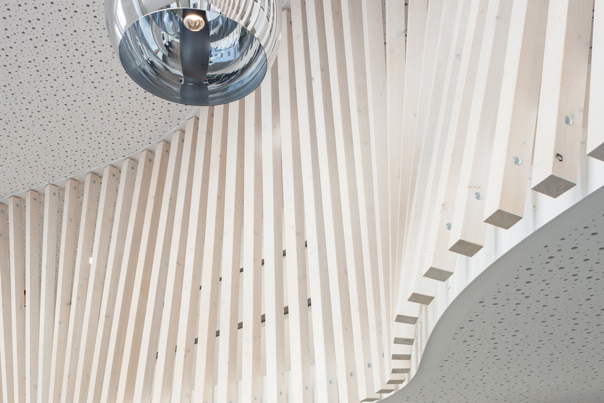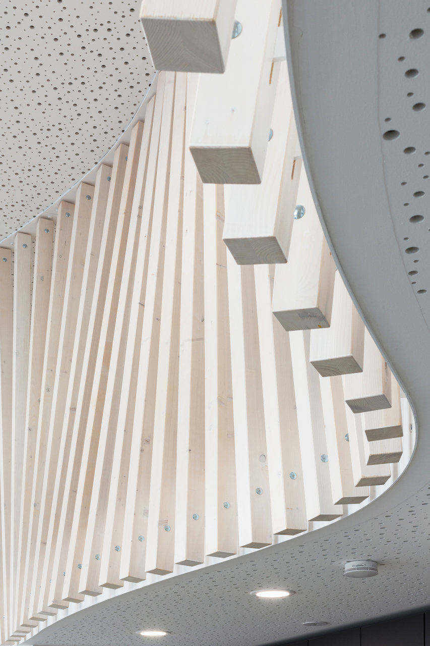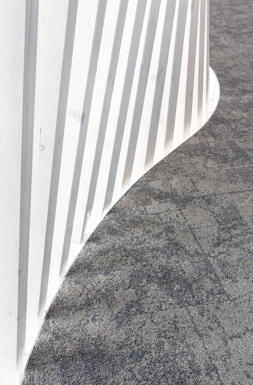 Eine der zentralen Herausforderungen des Innenarchitektur-Projektes war es, den Eingangsbereich neu zu ordnen, um eine freundliche Arbeits- und Empfangsatmosphäre zu schaffen. Ein einfacher aber für das Gesamterscheinungsbild umso wichtiger Eingriff war die räumliche Abtrennung des vorhandenen Galeriebereiches. Zuvor als reiner Gangbereich zu Nebenräumlichkeiten genutzt, wurde dieser nun durch die formale Ausgestaltung zu einem zusätzlichen Aufenthaltsbereich. Ein geschwungener und aus Holzstäben bestehender räumlicher Abschluss schafft eine aufgelockerte Raumstimmung und bringt den hohen Eingansgbereich in seiner Gesamtheit zur Wirkung.
