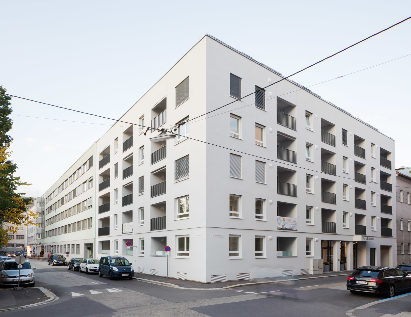 Alle Grundrisse sind nach Süden und Westen orientiert (Ecke Gesellenhaus– und Auerspergstraße). Durch eigene Freibereiche (Loggien) wird den Bewohner:innen die Teilnahme am öffentlichen Leben ermöglicht. (Text: Architekten, bearbeitet)