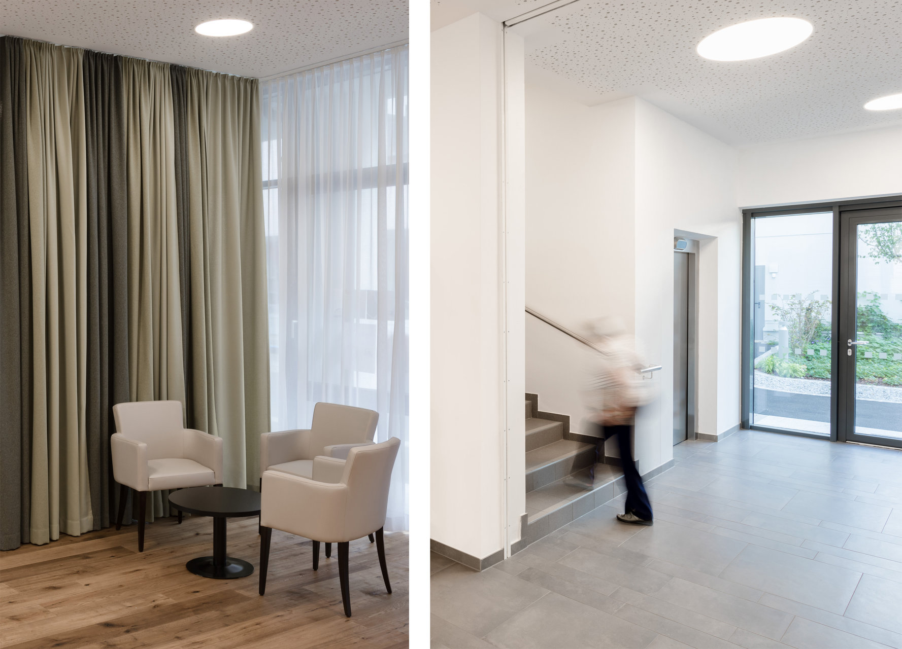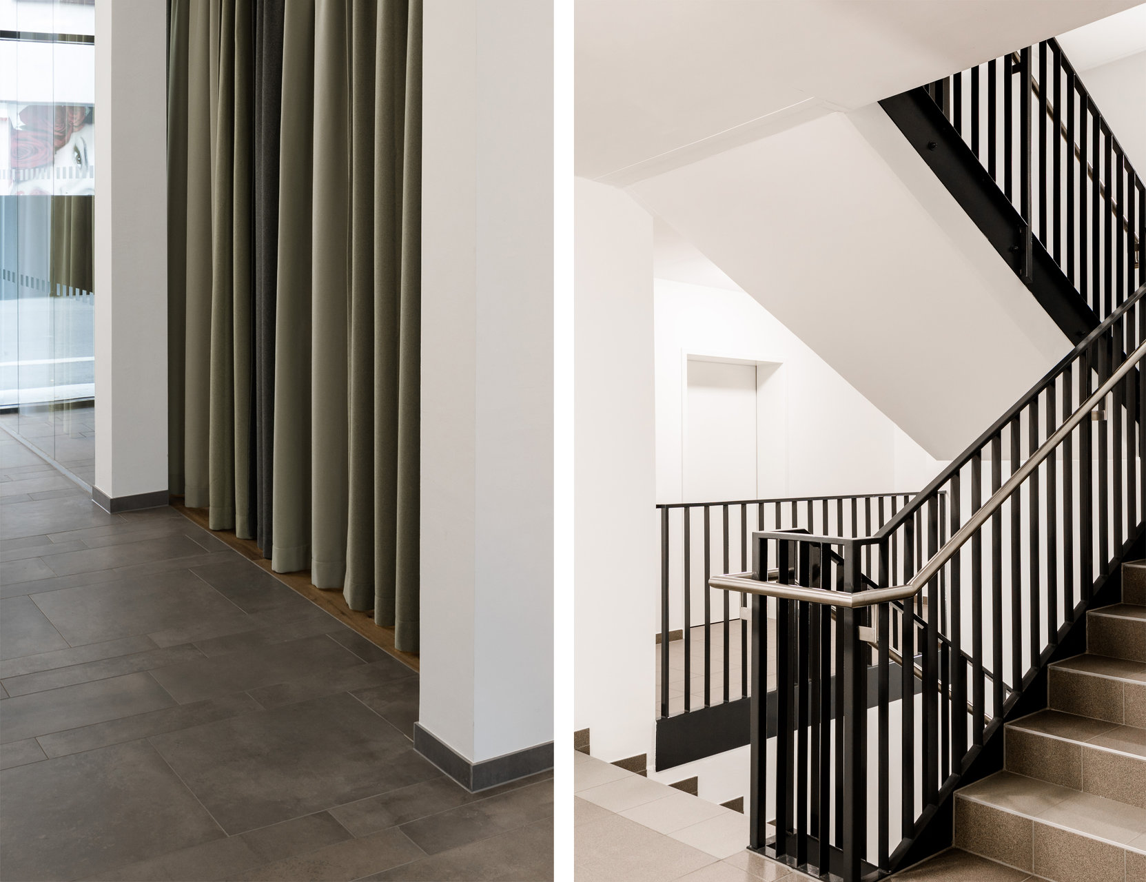 Die Wohnungen im Erdgeschoß befinden sich eigentlich im Hochparterre und werden über eine Treppe und einem Lift barrierefrei erschlossen. Das Stiegenhaus ist platzsparend an der Innenecke des Gebäudes situiert und bringt aufgrund seiner großzügigen Verglasung viel Licht in die kurz gehalten Gänge im Zentrum des Gebäudes.