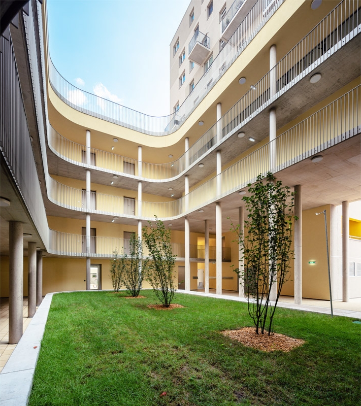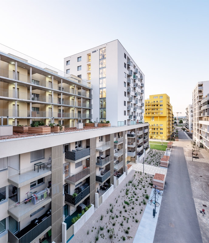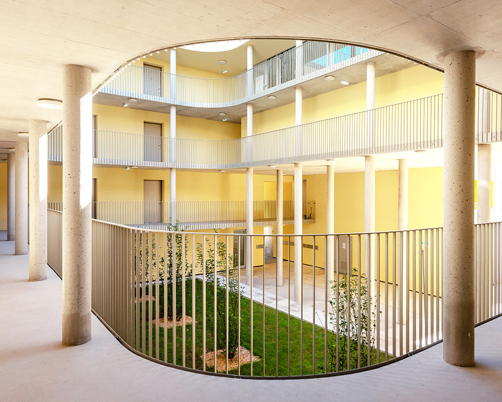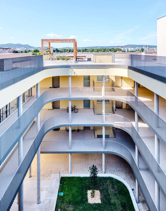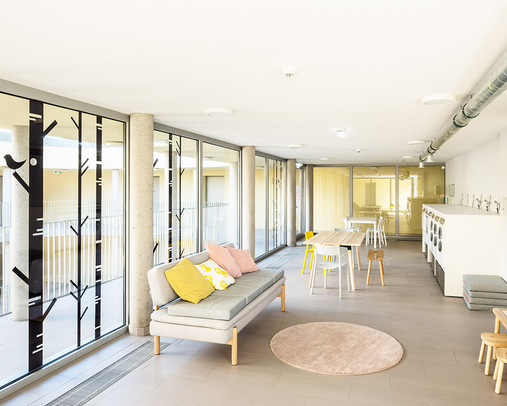 Die Wohnungen sind kleinteilig und mit zahlreichen ökonomischen Smart-Wohnungen durchmischt. Bei den Laubengängen gibt es teilweise Freibereiche, die den Wohnungen zugeordnet sind. Spezielle „Plus-Räume“ in den Wohnungen können flexibel als Arbeitsplatz, Stauraum oder als zusätzliche Schlafnische genutzt werden. (Text: Architekt:innen, bearbeitet)