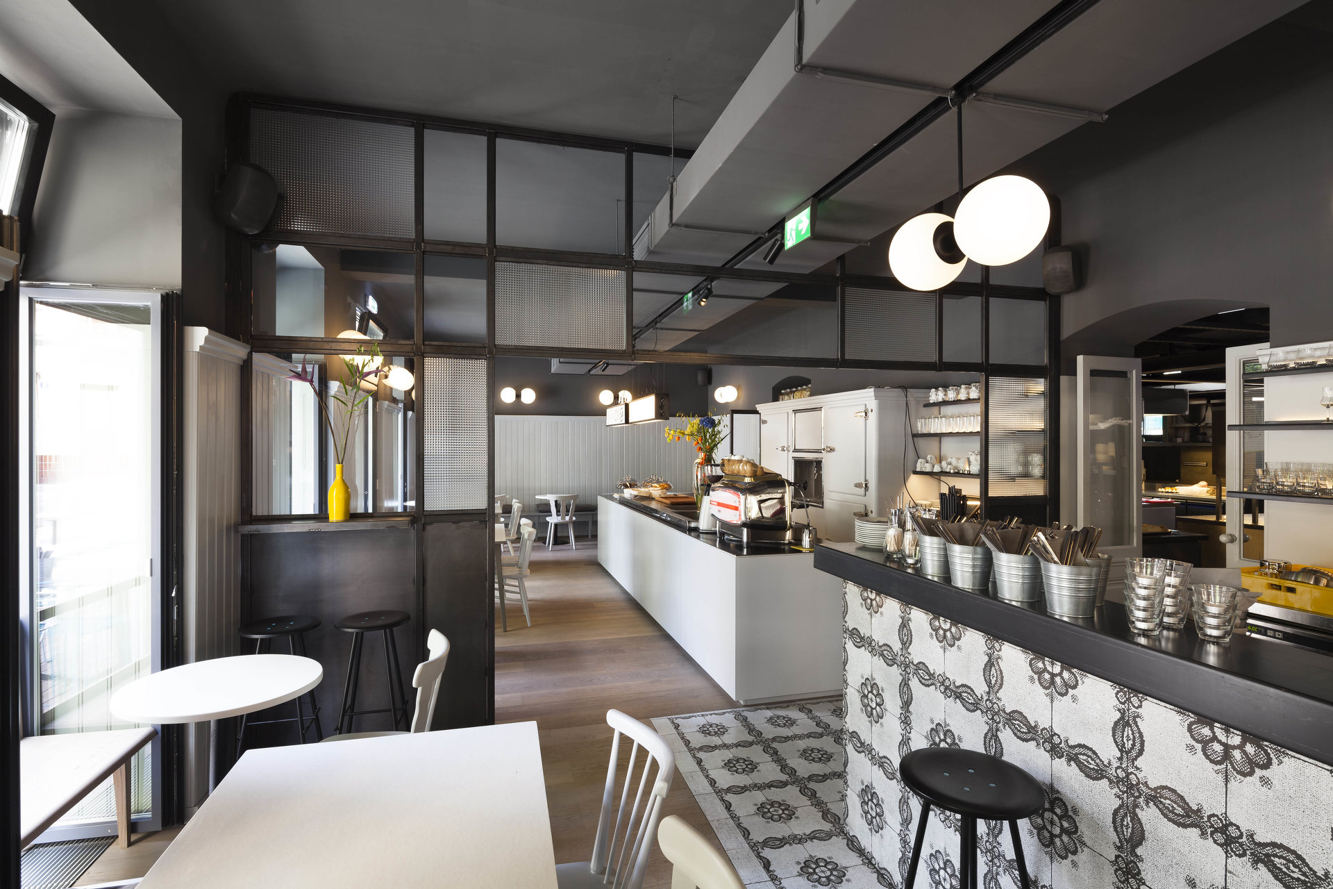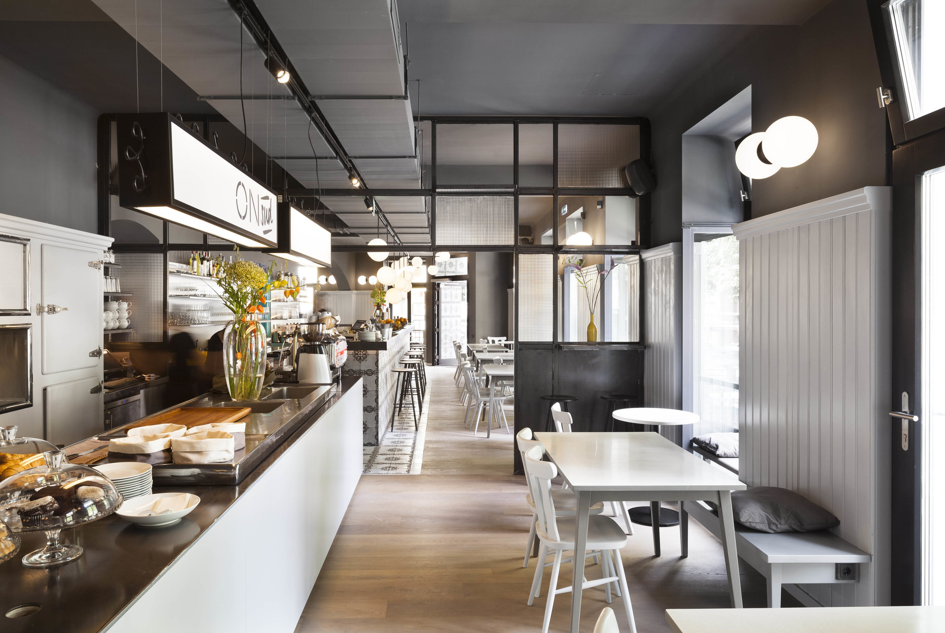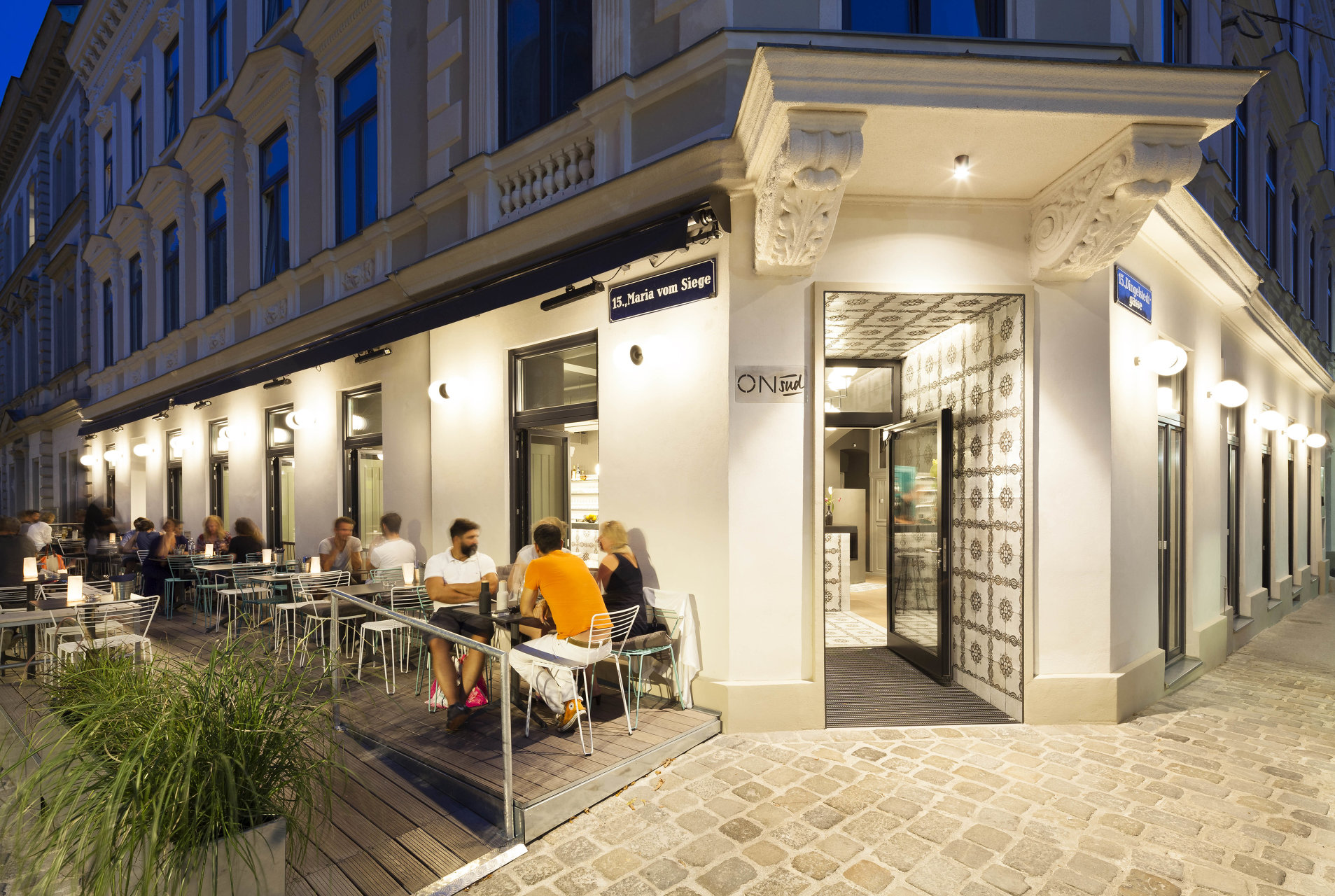 Mit dem neuen Pächter und einem ambitionierten Gastronomiekonzept für das Lokal On Sud ergab sich die Chance, das Ecklokal größer als vorher von Grund auf neu zu denken. Mit subtilen Eingriffen wurde der Raum neu unterteilt, die ehemals neben dem Gastraum situierte Küche wurde zur Hofseite verlegt. Bei der Gestaltung wurden bestehende Teile der Einrichtung wie Schank, Raumteiler zum Extrazimmer, Lamperie, sowie bestehende Tische und Stühle in einem veränderten Kontext wieder eingesetzt. Sie wurden einem neuen Farbkonzept unterworfen, welches auf fein abgestimmten, warmen und kalten Grautönen und wenigen farbigen Akzenten basiert. Mit neuen Holzböden, Oberflächen aus eigens angefertigten Fliesen, Kugelleuchten und neuen Möbeln aus Schwarzstahl entstand ein atmosphärisch stimmiges Gastronomie – Ambiente: Das mittlerweile als „Dingelstedt3“ geführte Grätzlwirtshaus mit Charakter und Spuren der Vergangenheit, in dem man sich schnell zu Hause fühlt.
