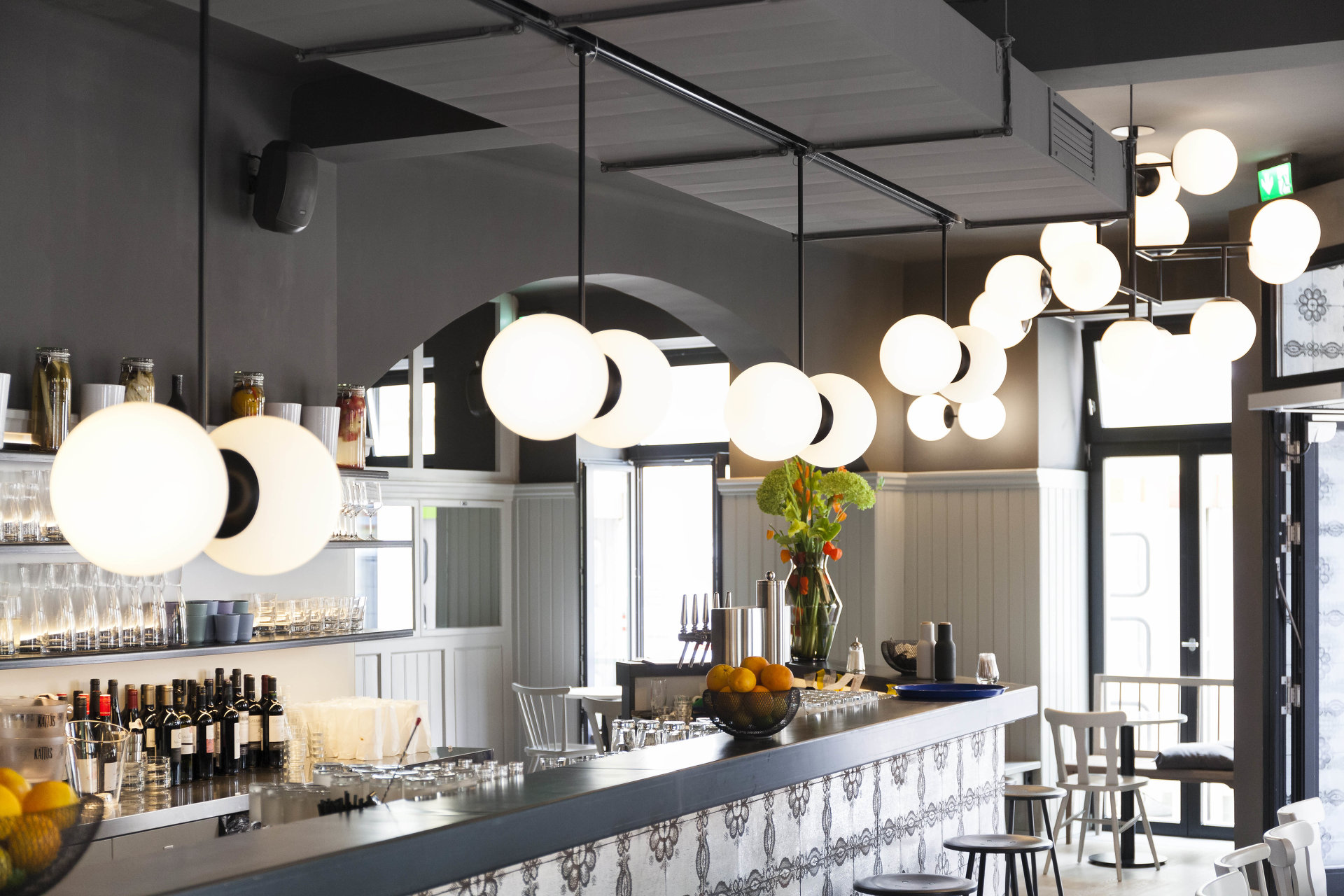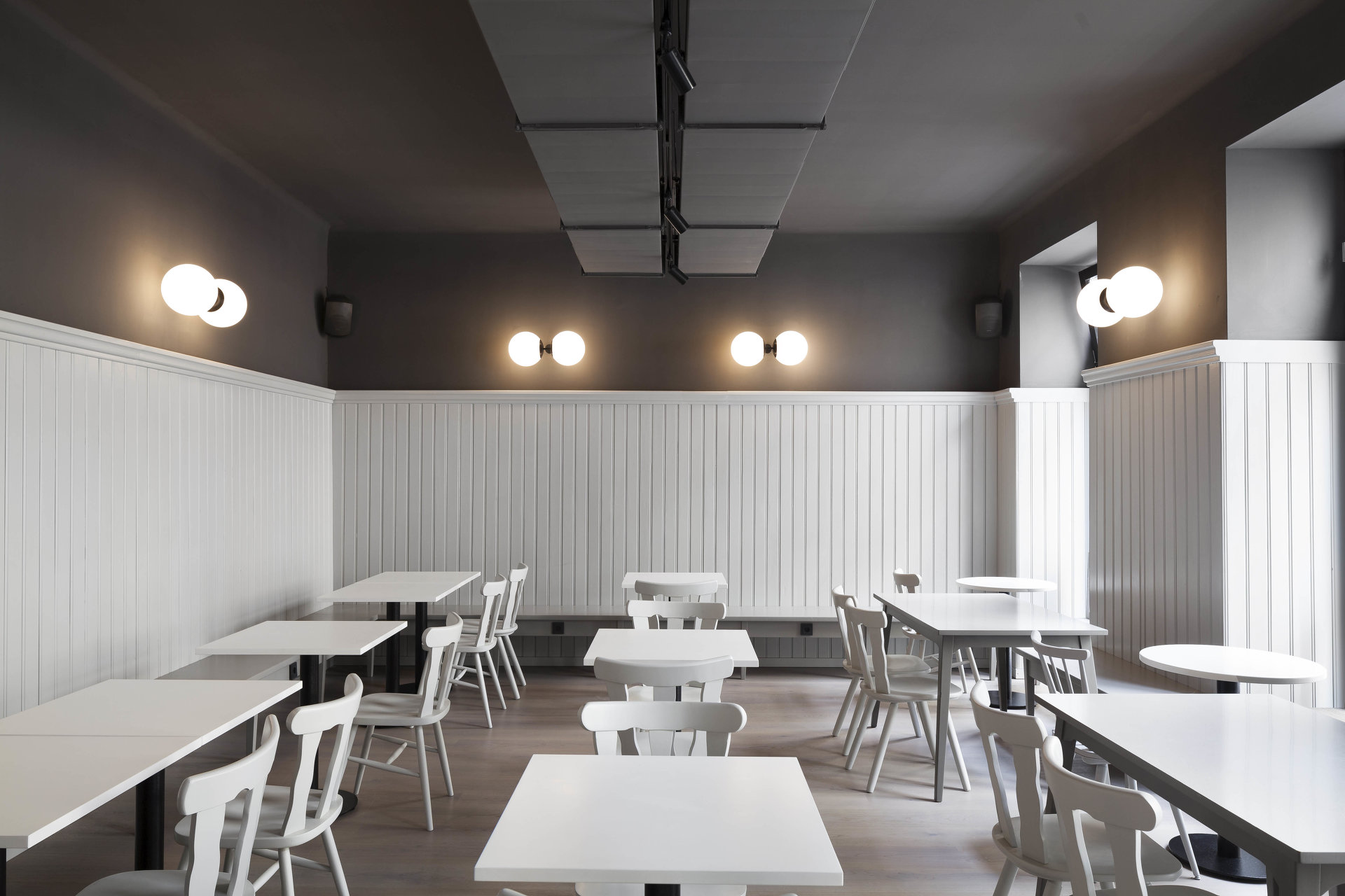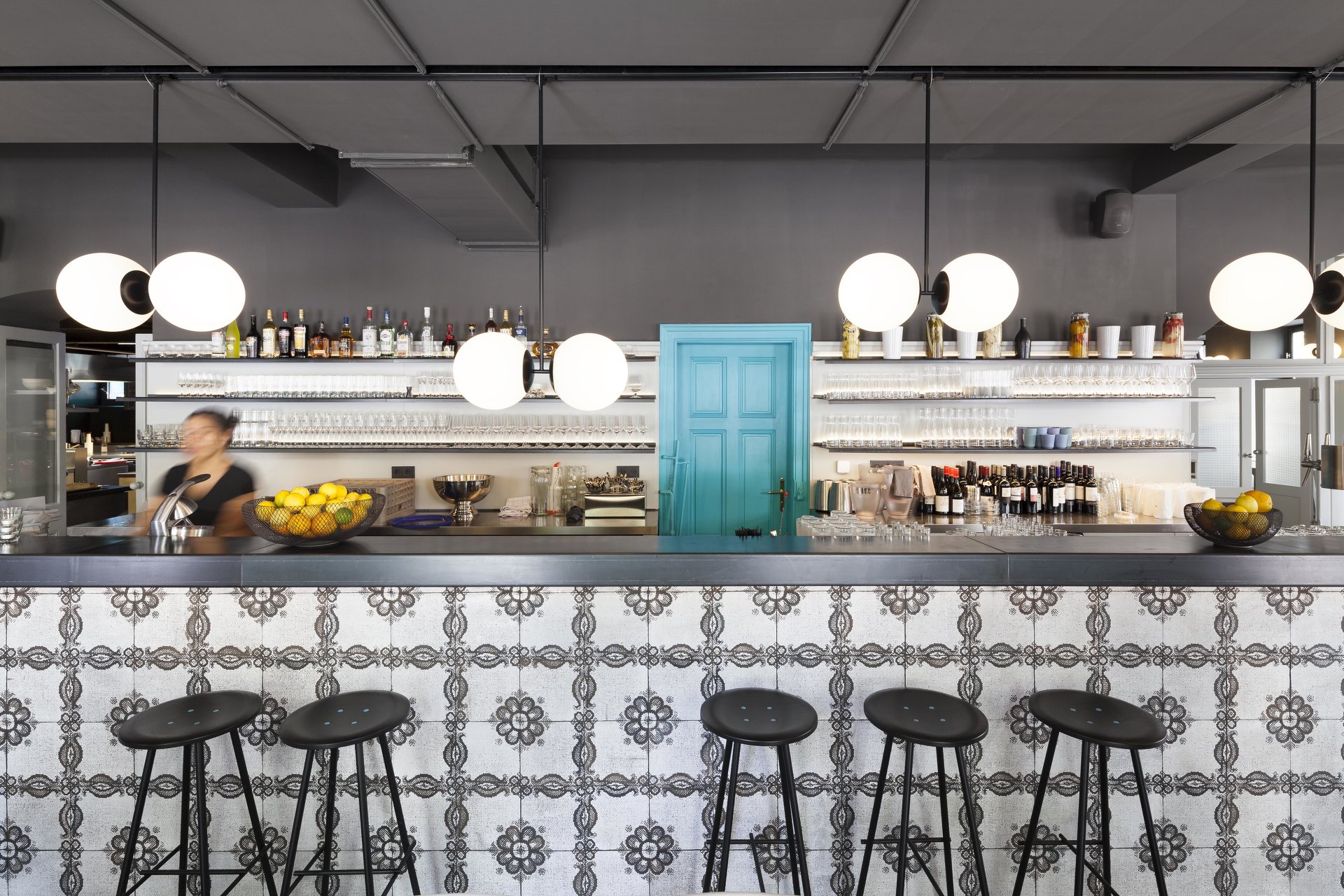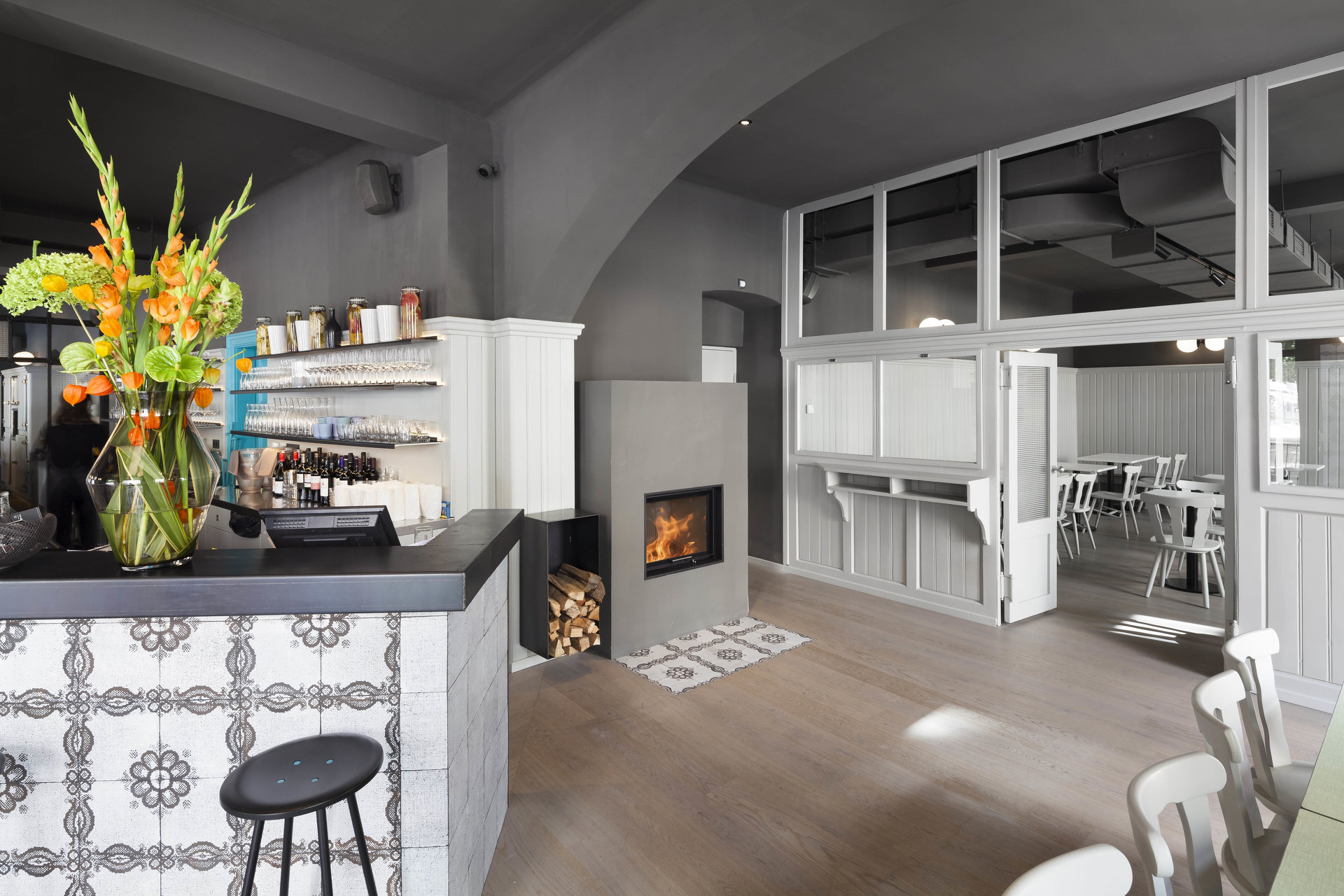 Mit dem neuen Pächter und einem ambitionierten Gastronomiekonzept für das Lokal On Sud ergab sich die Chance, das Ecklokal größer als vorher von Grund auf neu zu denken. Mit subtilen Eingriffen wurde der Raum neu unterteilt, die ehemals neben dem Gastraum situierte Küche wurde zur Hofseite verlegt. Bei der Gestaltung wurden bestehende Teile der Einrichtung wie Schank, Raumteiler zum Extrazimmer, Lamperie, sowie bestehende Tische und Stühle in einem veränderten Kontext wieder eingesetzt. Sie wurden einem neuen Farbkonzept unterworfen, welches auf fein abgestimmten, warmen und kalten Grautönen und wenigen farbigen Akzenten basiert. Mit neuen Holzböden, Oberflächen aus eigens angefertigten Fliesen, Kugelleuchten und neuen Möbeln aus Schwarzstahl entstand ein atmosphärisch stimmiges Gastronomie – Ambiente: Das mittlerweile als „Dingelstedt3“ geführte Grätzlwirtshaus mit Charakter und Spuren der Vergangenheit, in dem man sich schnell zu Hause fühlt.