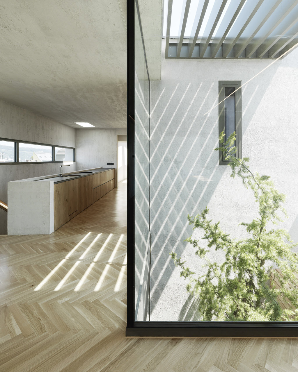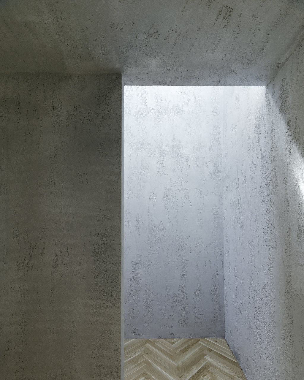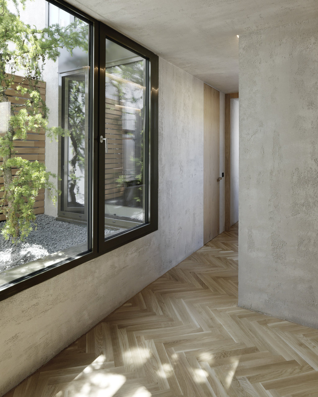 Die lichtdurchfluteten Raumsequenzen, mal eng, mal weit, mit integrierter Feuerstelle oder mit Glasdecke, durchzieht ein Eichenboden mit Fischgrätmuster, alle übrigen Flächen sind innen konsequent mit grauem, porös strukturiertem Verputz überzogen. Auch die Großteils raumhohen Türen und Möbeleinbauten sind aus Eichenholz.