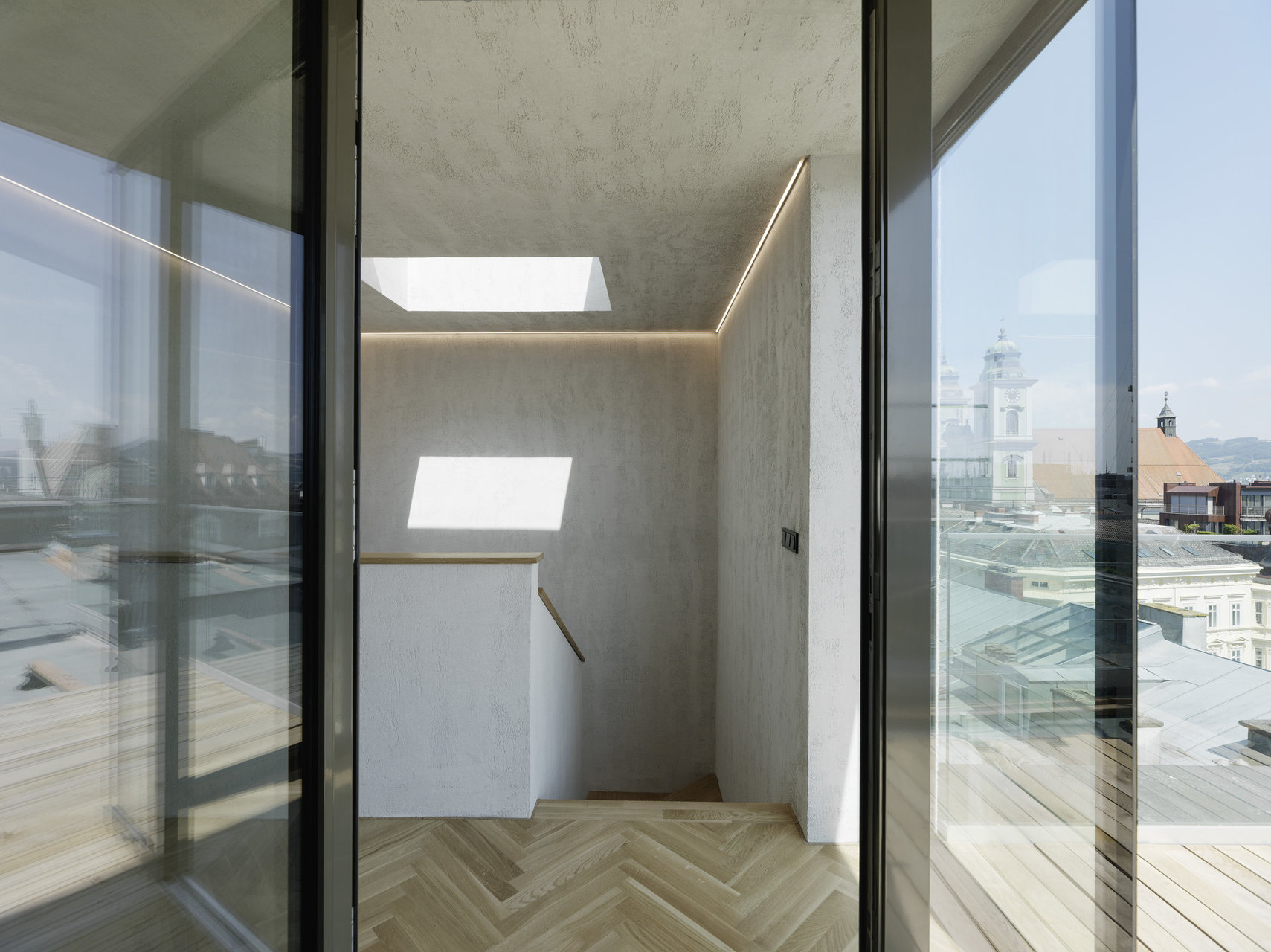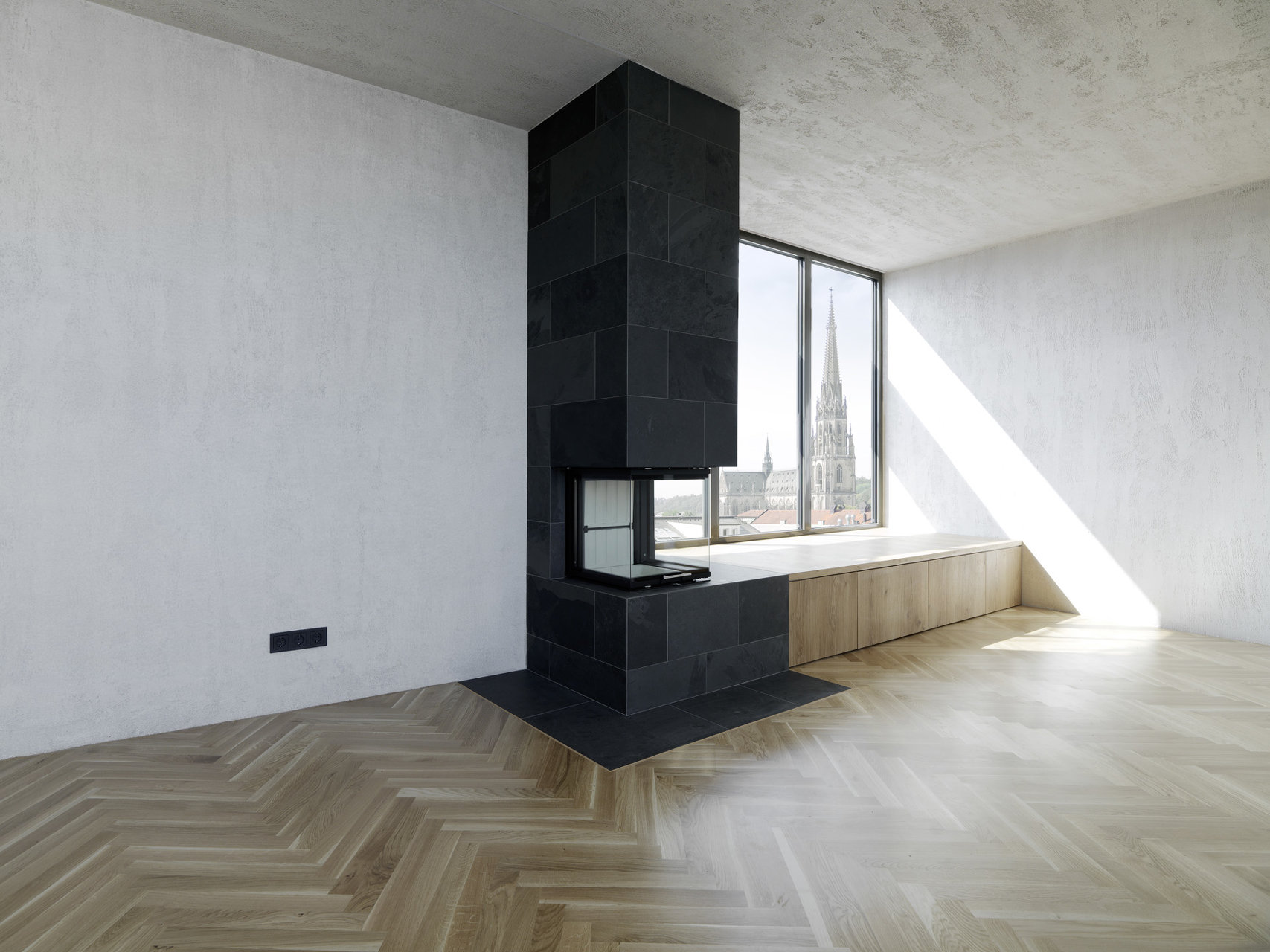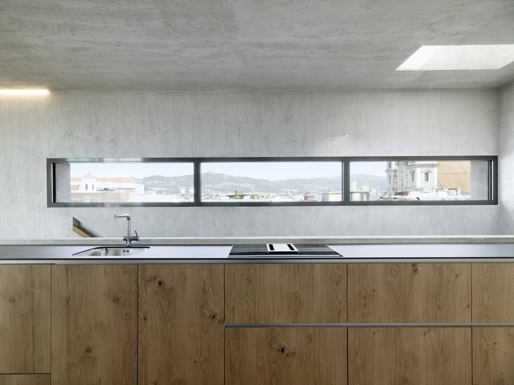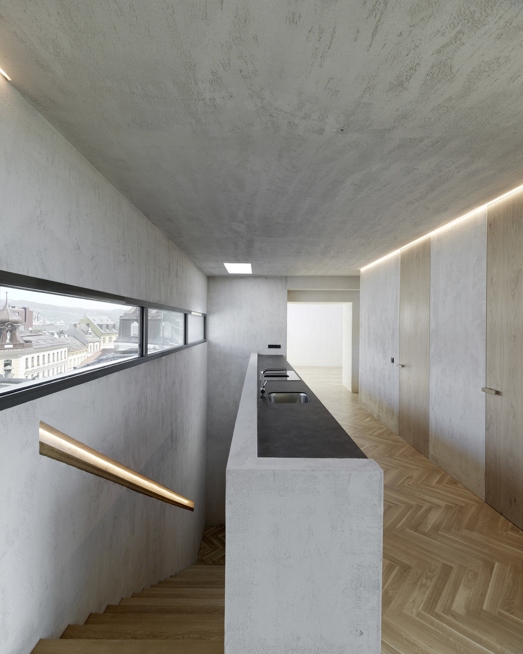 Die lichtdurchfluteten Raumsequenzen, mal eng, mal weit, mit integrierter Feuerstelle oder mit Glasdecke, durchzieht ein Eichenboden mit Fischgrätmuster, alle übrigen Flächen sind innen konsequent mit grauem, porös strukturiertem Verputz überzogen. Auch die Großteils raumhohen Türen und Möbeleinbauten sind aus Eichenholz.