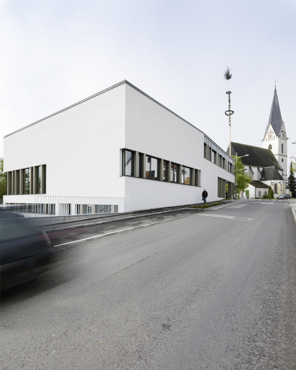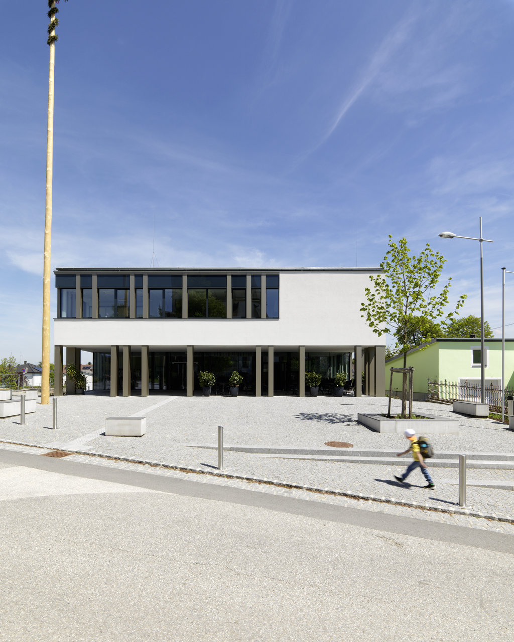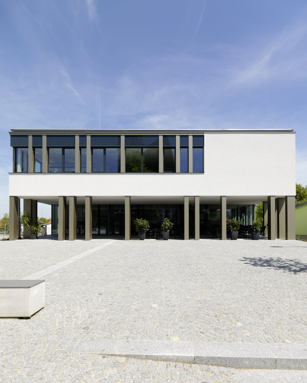 Seine identifikationsstiftende Erscheinung erhält das Gemeindezentrum durch groß ausgeschnittene Öffnungen im massiven Baukörper. Die übliche Fensterteilung bleibt im Hintergrund. Bronzeverkleidete Stützen füllen die Öffnungen mit einer abstrakten Textur aus, die zu einer gewissen Maßstabslosigkeit in der Wahrnehmung führt und dem Haus Leichtigkeit verleiht. (Text: Architekt)