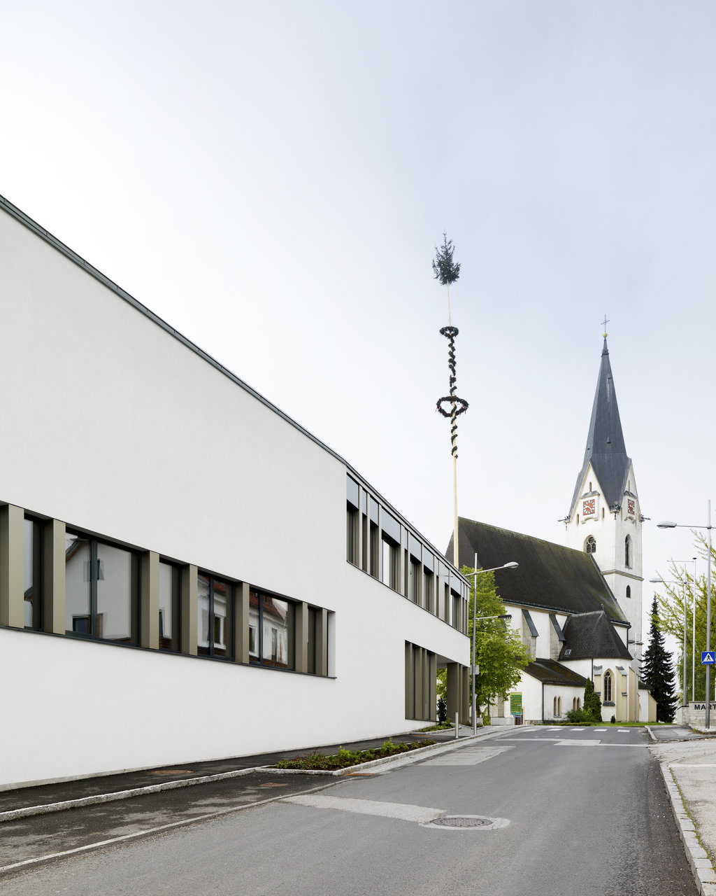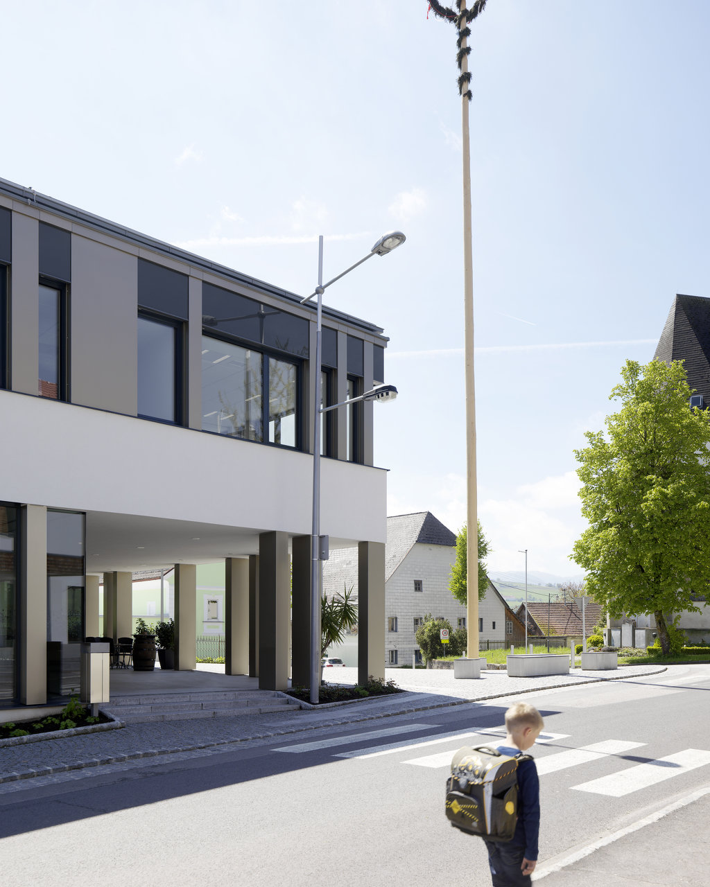 Das komplette Gemeindeamt befindet sich im Obergeschoss, es ist über einen Luftraum mit dem Foyer verbunden. Dadurch baut sich für den Besucher sofort nach Betreten des Gebäudes eine Blickbeziehung nach oben auf. Im Gemeindeamt selbst sind die Büros und Funktionszonen ringförmig um den Luftraum angeordnet; somit sind kurze Wege zwischen den Mitarbeitern und die Möglichkeit, direkten Blickkontakt zu halten, jederzeit gegeben. Ein Probesaal für die örtliche Musikkapelle ist im Untergeschoss integriert. Aufgrund der Topografie kann sich dieser Bereich nach Osten hin öffnen. Der geringe Höhenunterschied wird von einer Vorzone mit Sitzstufen überbrückt.