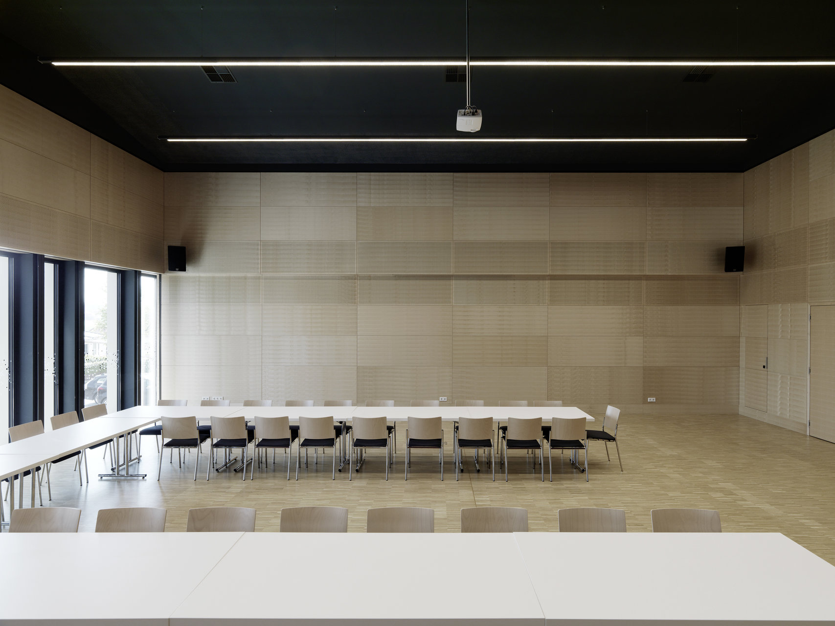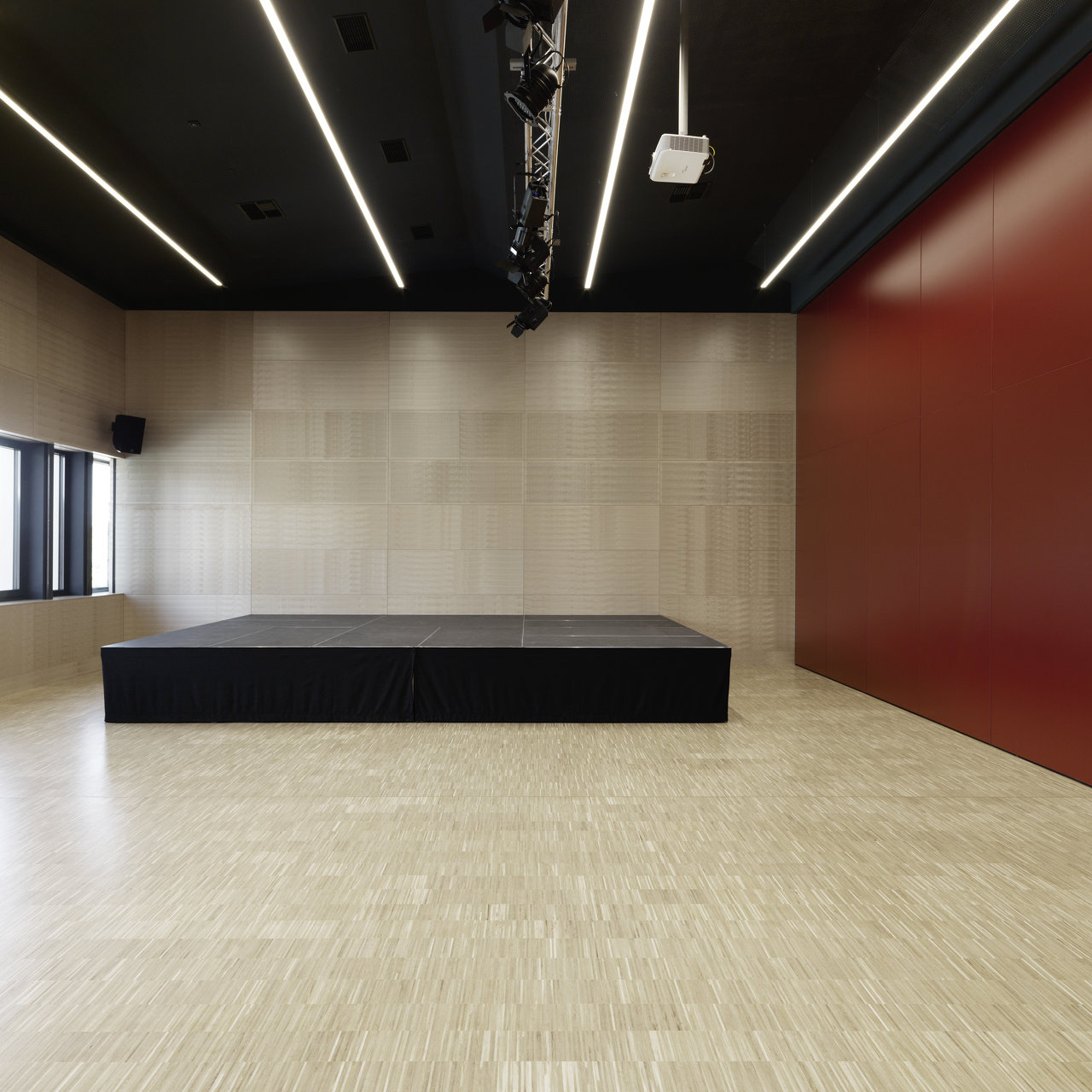 Über das quer zum Platz liegende Foyer werden sowohl der Saal als auch das Gemeindeamt erschlossen. Der Saalbereich, teilbar in zwei getrennt nutzbare Einheiten, wird durch eine Servicezone, in der sich Künstlergarderoben und ähnliche Nebenräume, aber auch die Vertikalerschließung mit Aufzug und Treppenhaus befinden, mit zwei breiten Zugängen erschlossen.