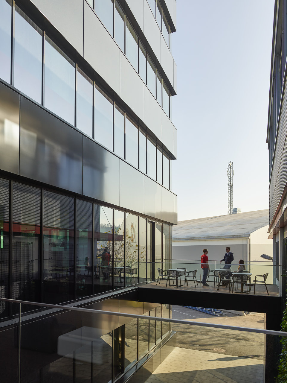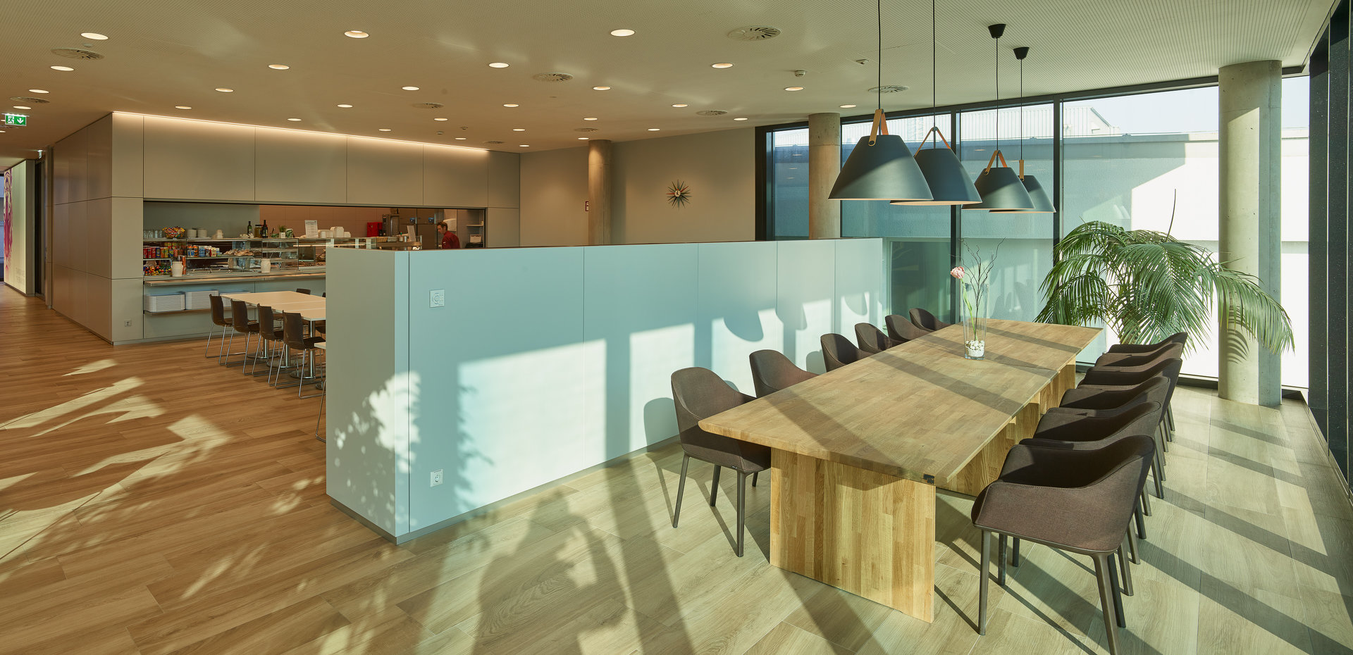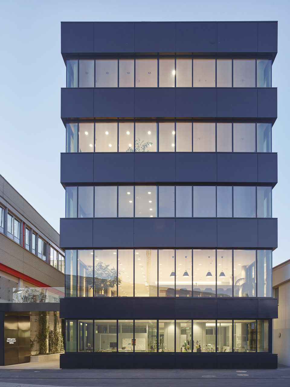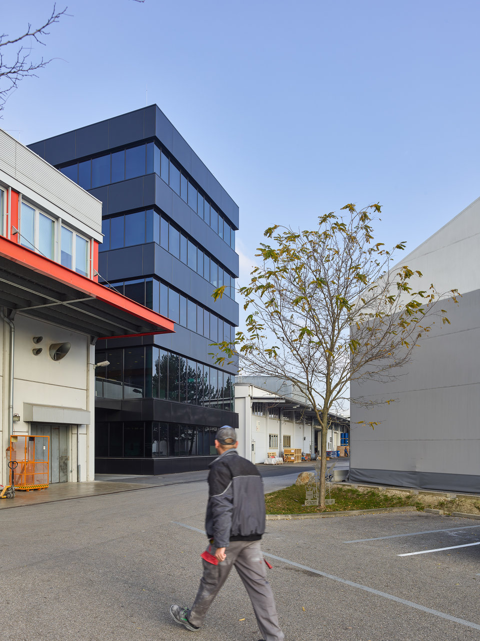Im Zuge der Neustrukturierung sämtlicher Büros am Betriebsgelände wurde auch das Bestandsgebäude an der Negrellistraße saniert und erweitert. Das neu gestaltete Foyer wird zum repräsentativen Showroom.