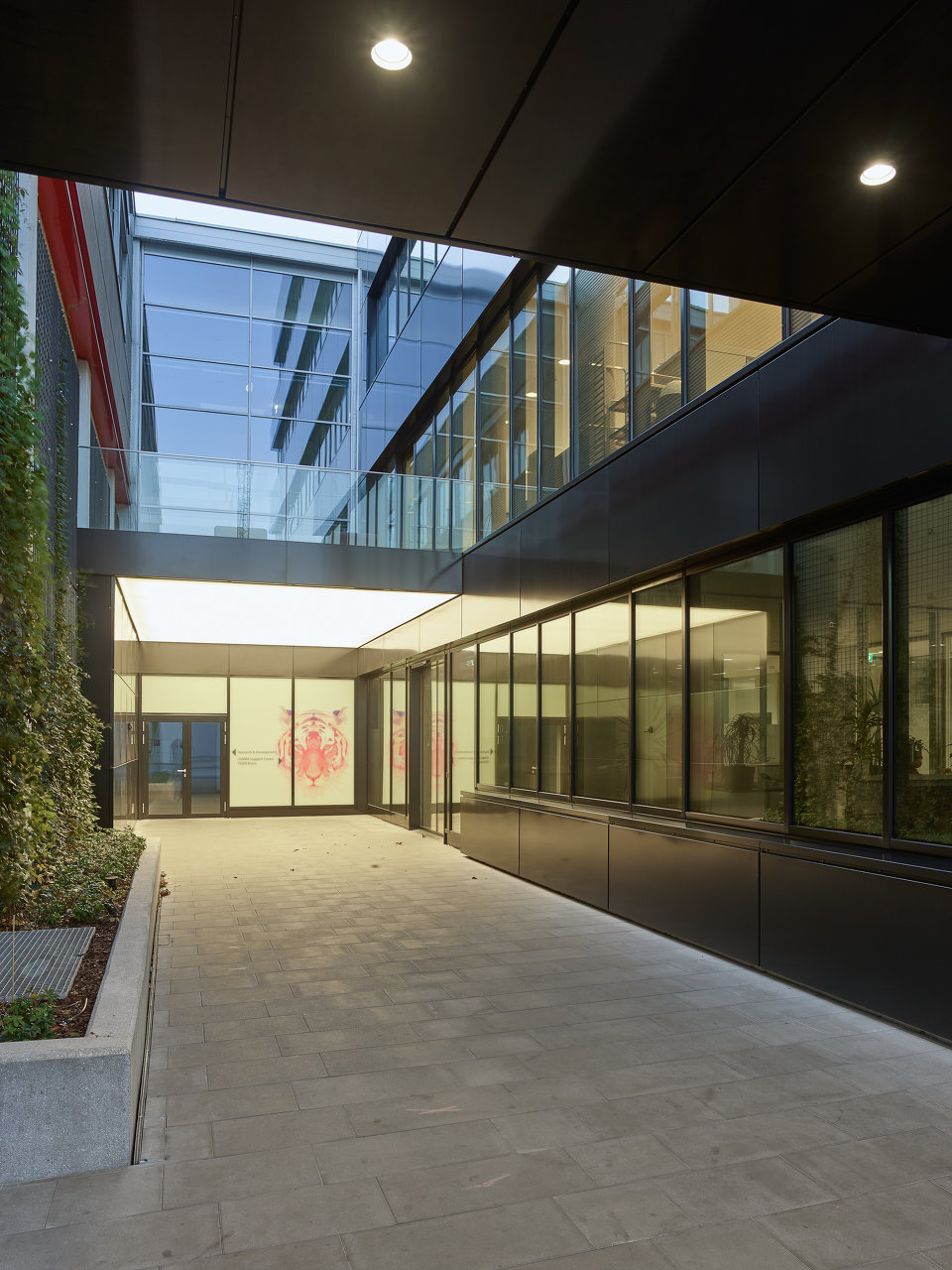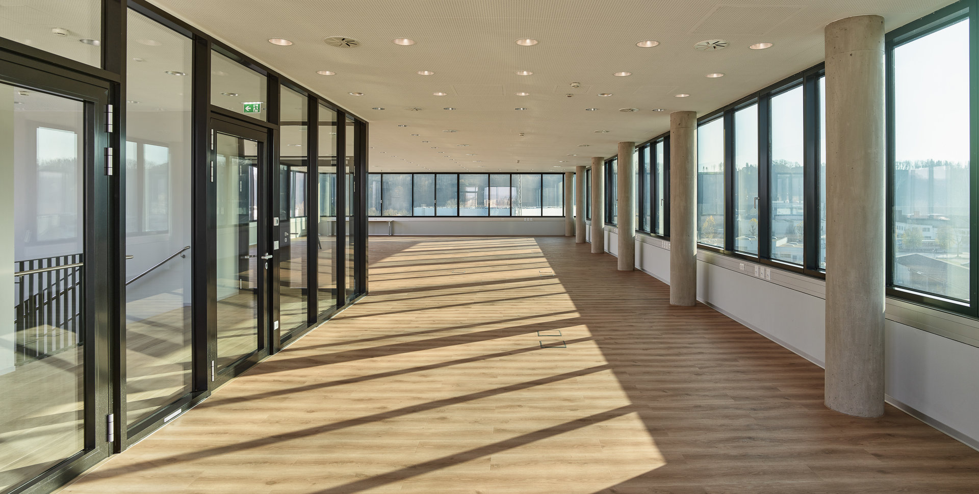 Großer Wert wird auf erneuerbare Energiequellen gelegt: Für die Wärmepumpe funktioniert das Abkühlbecken der hauseigenen Pulverlack-Produktion. Im Sommer werden die Temperaturen über abgehängte Kühldecken reduziert, als natürliche Kältequelle dient hier ein Grundwasserbrunnen. Die Stromerzeugung erfolgt über eine leistungsstarke Photovoltaik-Anlage am Dach. (Text: Architekten, bearbeitet)