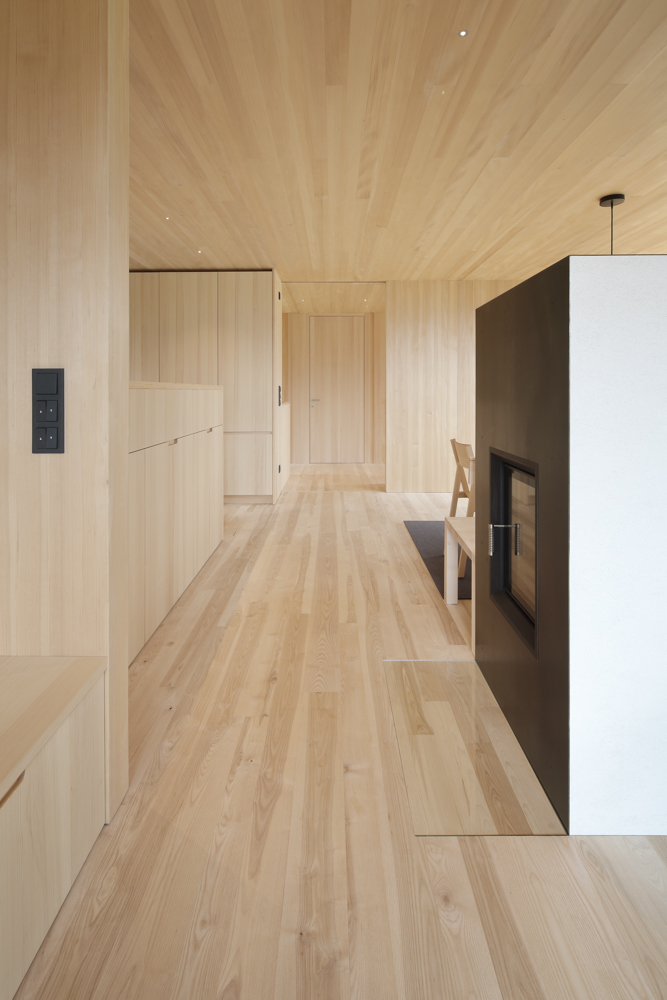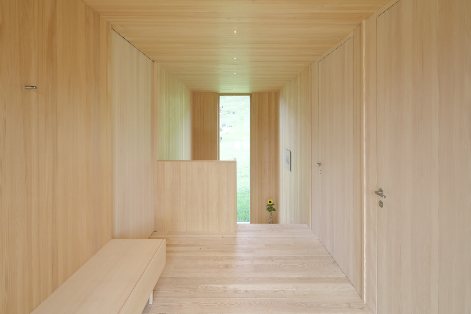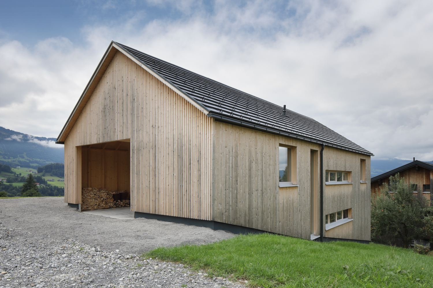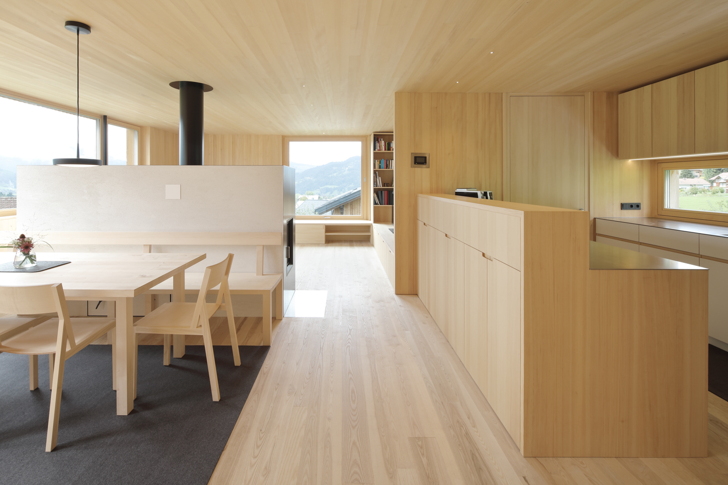 Glück muss man haben, dass in der Familie Handwerker zur Verfügung stehen, die einem beim Häuselbauen unterstützen. Noch mehr Glück braucht es, dass, wie bei diesem Haus, die zahlreichen Helfer einem roten Faden folgen und zum Schluss ein kompaktes Haus aus einem Guss außen, innen, unten und oben mit Holz dasteht. (Vorarlberger Holzbaupreis 2019 - Begründung der Jury)