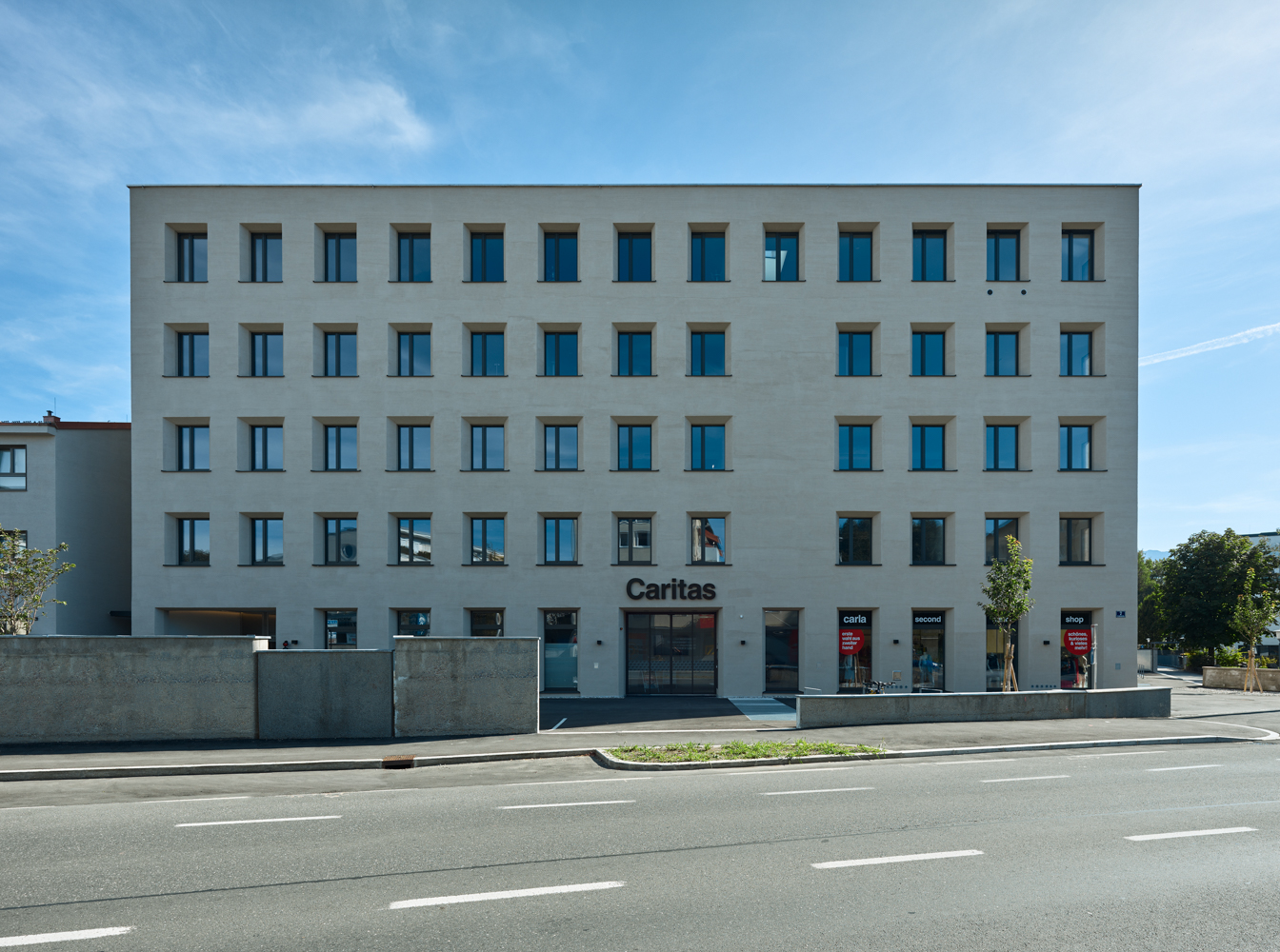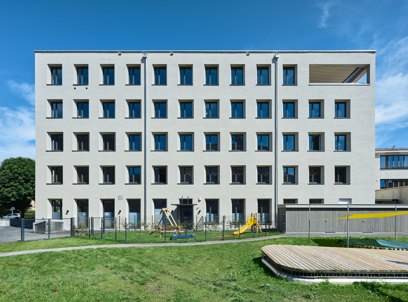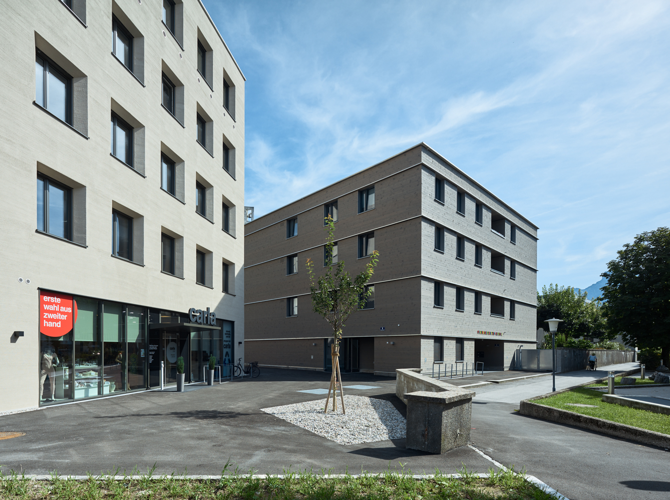Der bestehende Kindergarten wurde abgetragen, um Raum zu schaffen für eine zeitgemäße Interpretation dieser Bauaufgabe und barrierefreie Wohnungen in den Obergeschossen. Zusätzlich sollten Flächen für die Administration der Caritas mit einem großzügigen Geschäftslokal entstehen. Im Bezug zur städtebaulichen Körnung des Ortes wurde das umfangreiche Raumprogramm in zwei separaten Volumen gefasst, die durch eine Tiefgarage miteinander verbunden sind. Die beiden Gebäude formen eine prägnant artikulierte Pforte in der Klostermauer, um ihre Funktion als soziale Anlaufstellen zu verdeutlichen und den Charakter des Pfarrgartens als allgemein zugänglichen Grünraum auszuweisen.