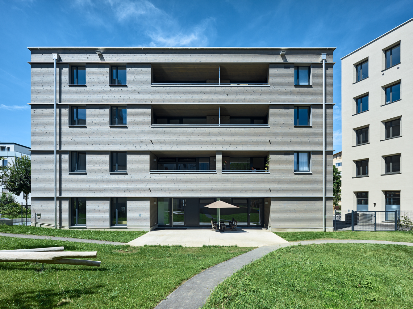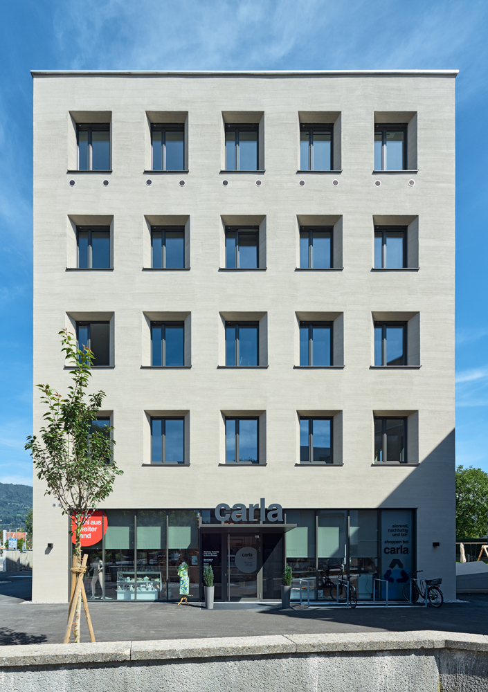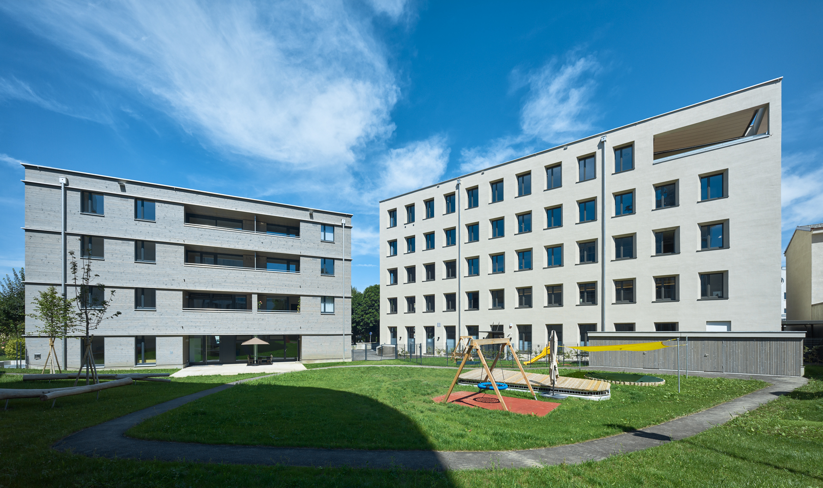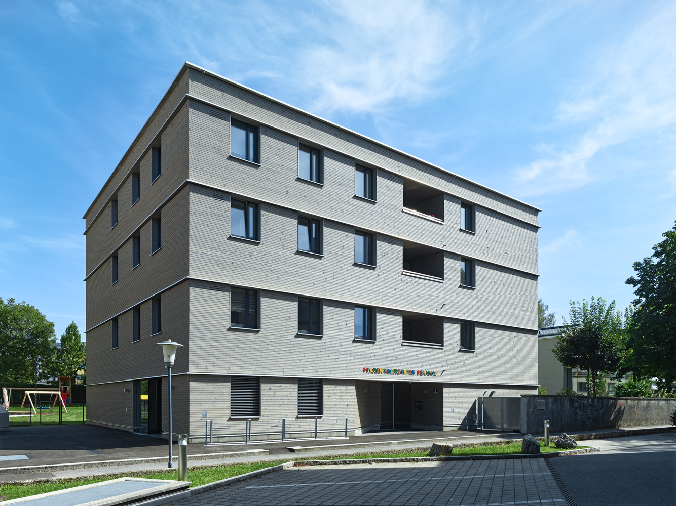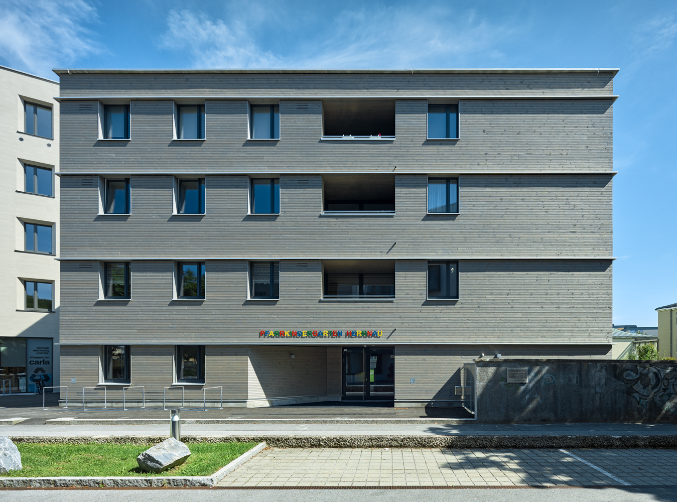 Der Verwaltungsbau im Passivhaus-Standard ist klar und pragmatisch strukturiert, seine Grundrisse und Fassaden sind zweckmäßig auf die Nutzung als Bürogebäude abgestimmt. Um eine flexible Einteilung der Räume zu ermöglichen, werden die statischen Lasten über einen massiven Kern und die Außenwände abgetragen. Diese sind aus innovativen Wärmedämmziegeln gemauert, auf welche eine Schicht Isolierputz und darüber fein gearbeiteter Deckputz im Besenstrich aufgetragen sind. Das Kindergarten- und Wohngebäude hingegen ist in seiner Gestaltung offen und verspielt ausformuliert und als Hybridbau im Niedrigenergie-Standard konzipiert. Der Tragstruktur aus Stahlbeton und Mauerwerk wurde eine horizontal verschalte Holzfassade vorgehängt, die mit Mineralwolle gedämmt ist. Das Ensemble verfügt über Photovoltaik-Anlagen, nachhaltige Heiz-, Kühl- und Lüftungssysteme und ist mit vier Ladestationen für Elektrofahrzeuge ausgestattet. (Text: Architekt)