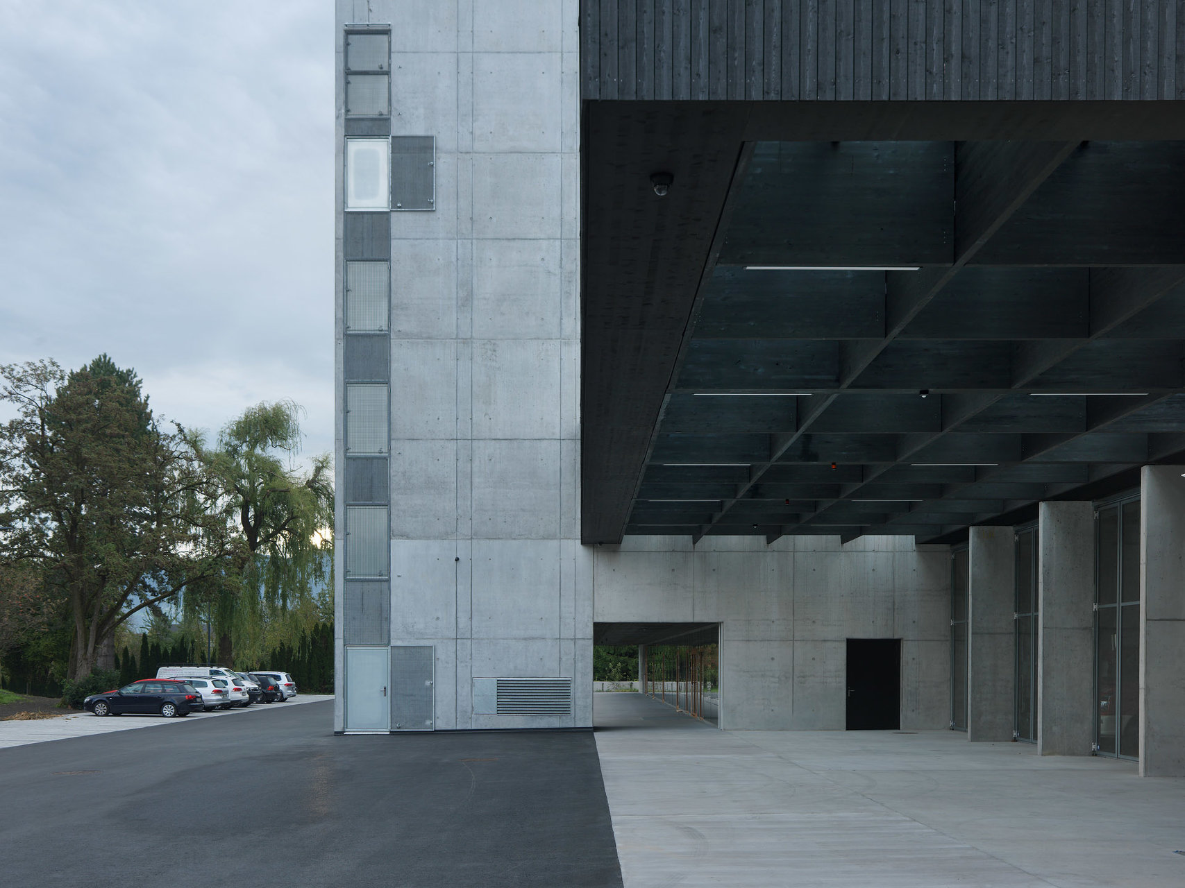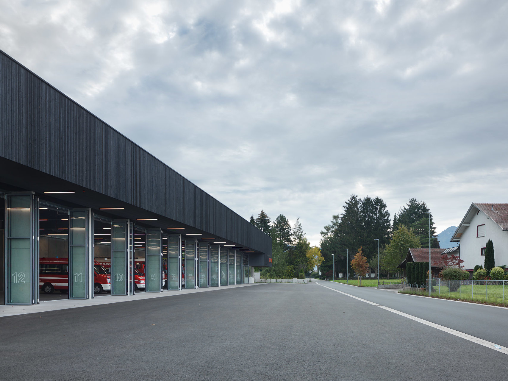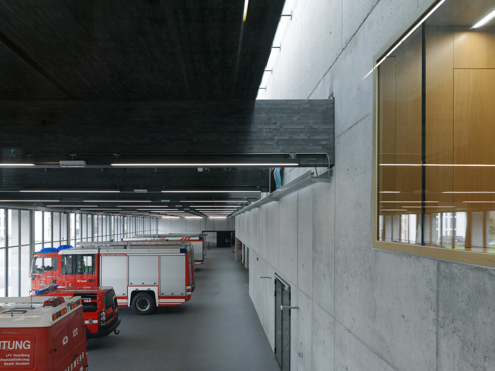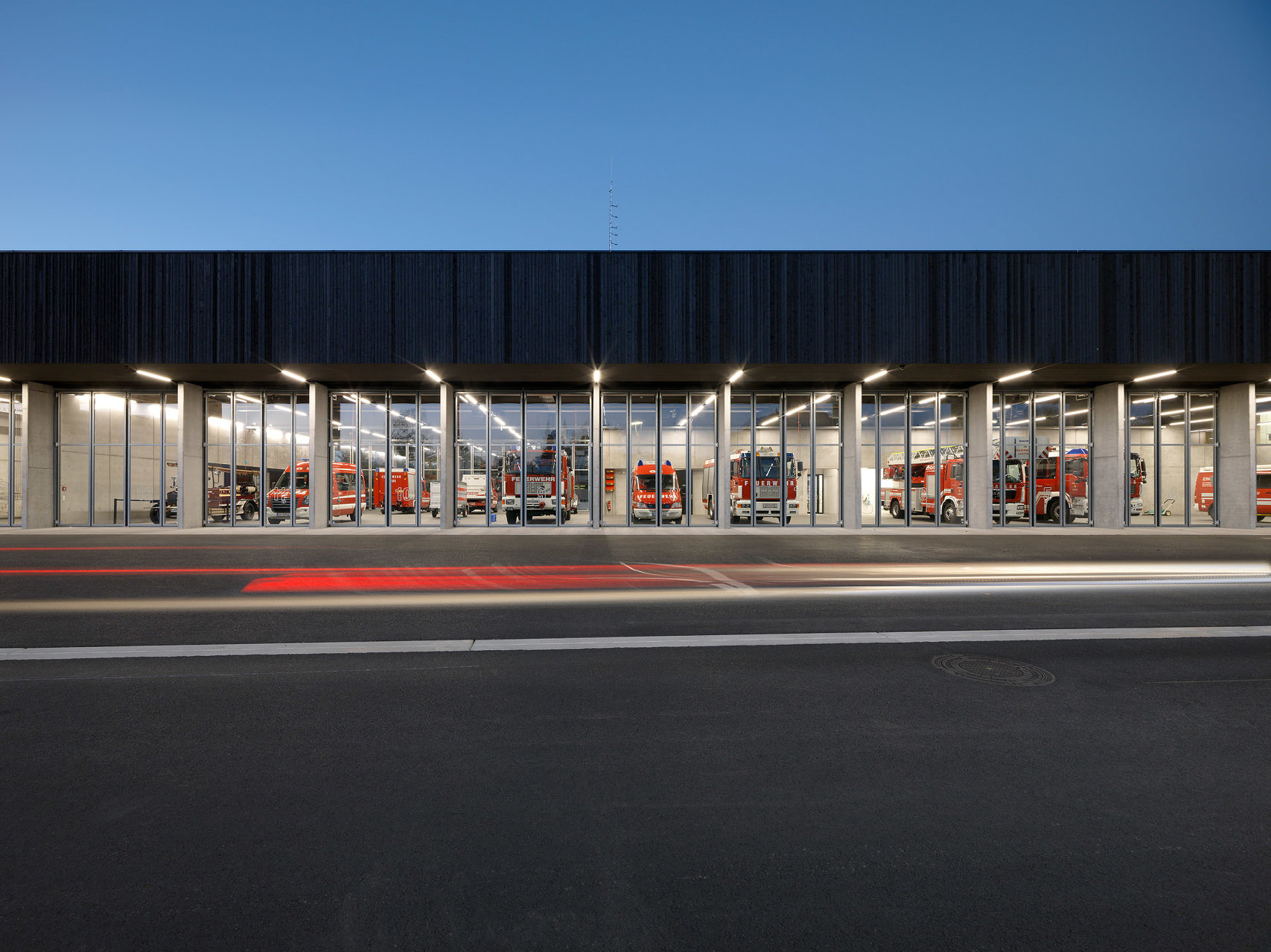 Der Anspruch der Architekten, einen zeitlos eleganten, funktionalen Zweckbau mit minimierten Erhaltungskosten zu errichten, definiert auch die Qualität der Materialien: Sowohl die Sichtbetonbauteile im Sockelgeschoß, als auch der Baustoff Holz für Dachtragwerk und Fassade sind robust, beständig und alterungsfähig im Erscheinungsbild. Die Falttoranlagen der Fahrzeughalle mit verzinkten Stahlprofilen und großflächigen Verglasungen in Eichenrahmen bilden dazu einen angenehmen Kontrast. (Text: Tobias Hagleitner nach einem Text der Architekten)