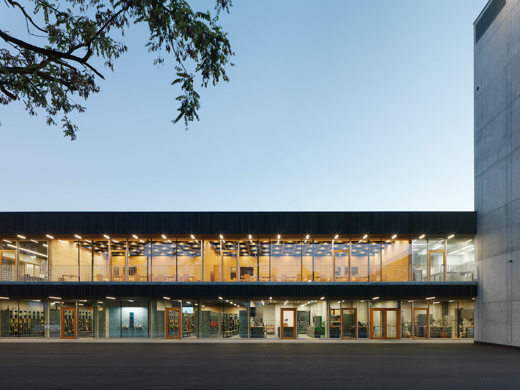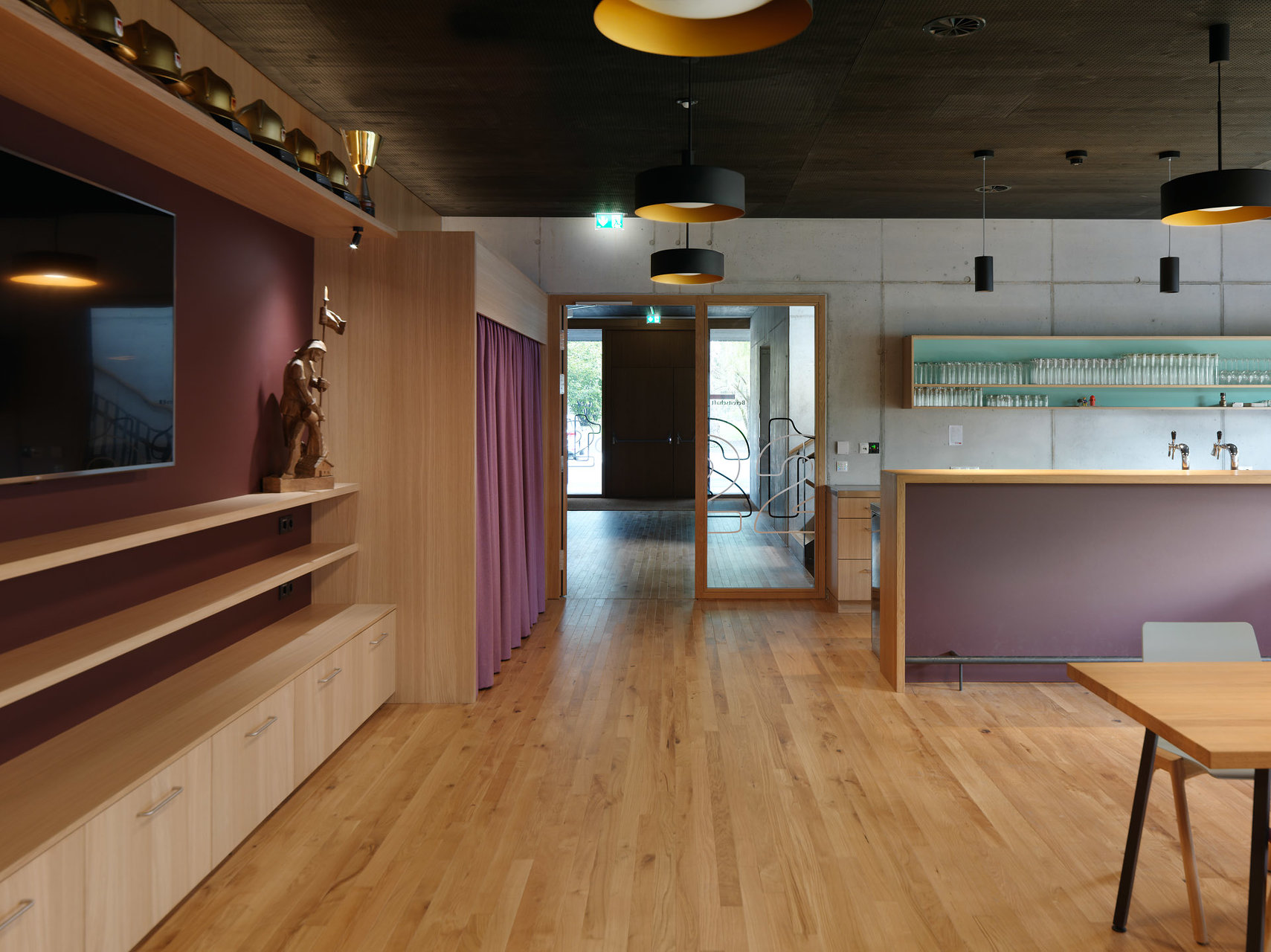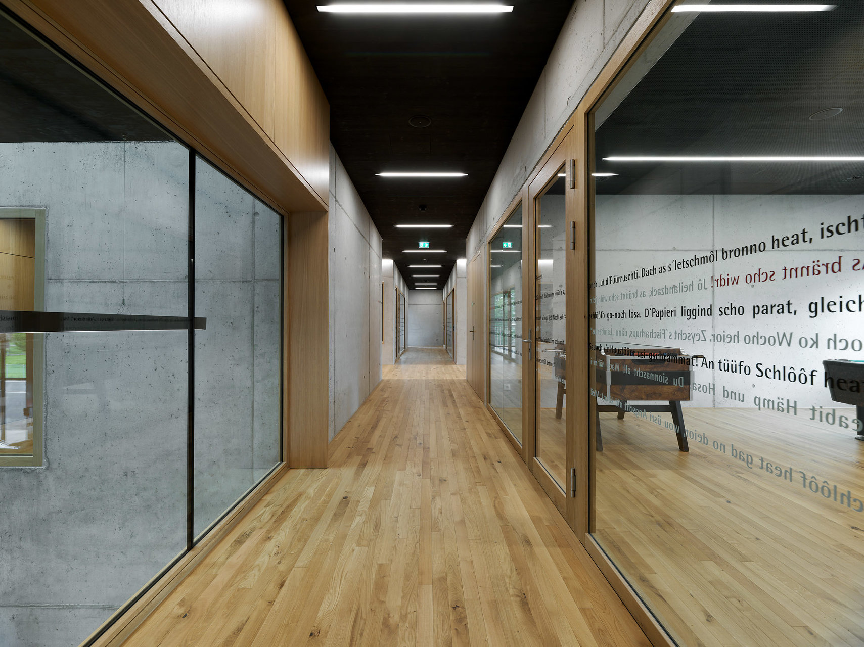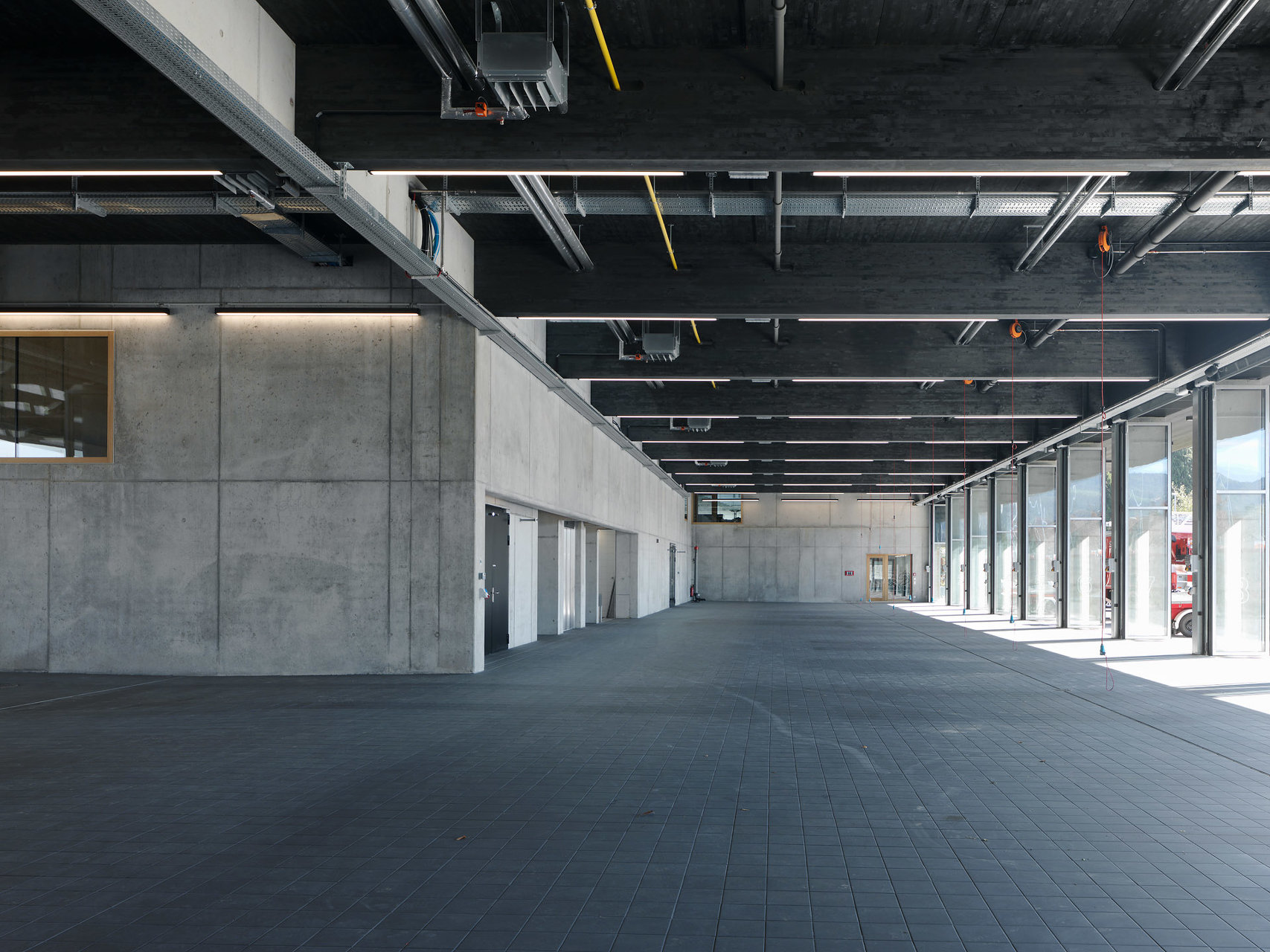 Der Anspruch der Architekten, einen zeitlos eleganten, funktionalen Zweckbau mit minimierten Erhaltungskosten zu errichten, definiert auch die Qualität der Materialien: Sowohl die Sichtbetonbauteile im Sockelgeschoß, als auch der Baustoff Holz für Dachtragwerk und Fassade sind robust, beständig und alterungsfähig im Erscheinungsbild. Die Falttoranlagen der Fahrzeughalle mit verzinkten Stahlprofilen und großflächigen Verglasungen in Eichenrahmen bilden dazu einen angenehmen Kontrast. (Text: Tobias Hagleitner nach einem Text der Architekten)