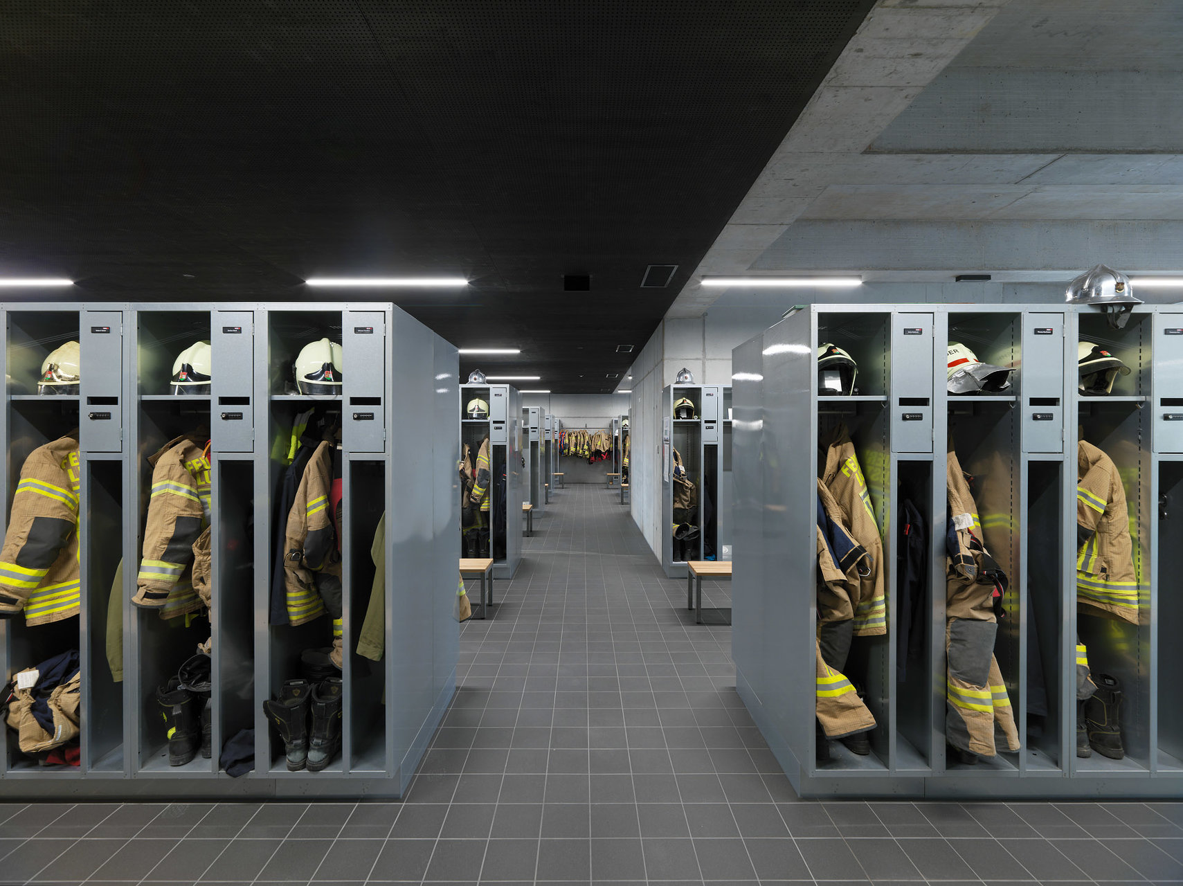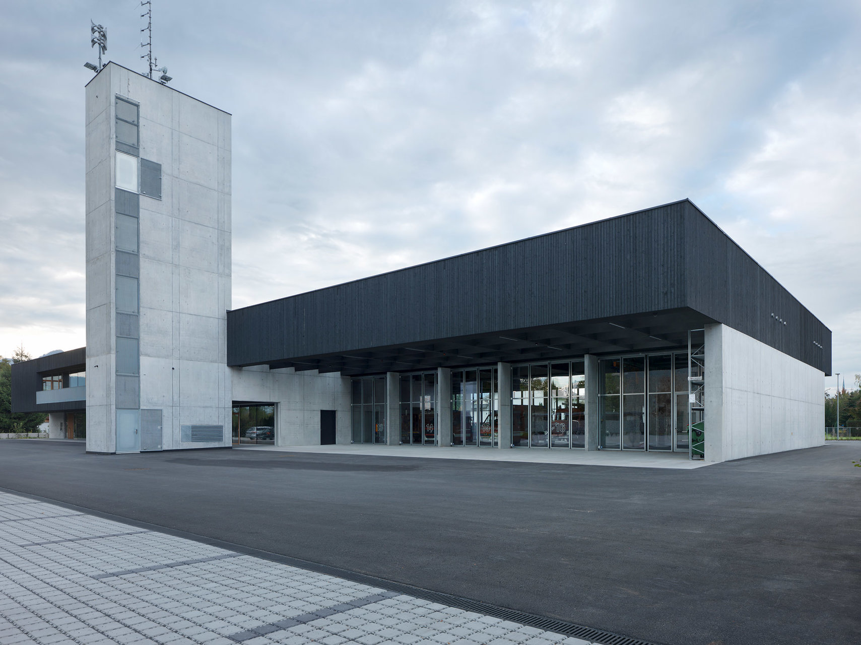 Die Bauwerkshöhe, definiert von den Erfordernissen der Einsatzfahrzeuge, lässt rückseitig die Organisation der Einsatz- und Schulungsräume auf zwei Ebenen zu. Der Schlauchturm wurde entsprechend den funktionellen Anforderungen positioniert, als Zeichenträger bewusst nicht überbewertet. Der Ausbildungs- und Übungsplatz auf der Rückseite hat einen großzügig überdachten Bereich und kann bei Veranstaltungen bespielt werden, ohne die Einsatzabläufe zu behindern. Entsprechend den geologischen Gegebenheiten erfolgte eine Teilunterkellerung als „weiße Wanne“ auf erschütterungsarmer Pfahlgründung. Die tragende Struktur, erdberührte Bauteile und der Fahrzeughallenbereich sind aus Stahlbeton. Im gesamten Dachtragwerk sind Holzbauwerkstoffe konstruktiv eingesetzt. Die thermisch beanspruchten Außenwände sind, mit Mineralfaser gedämmt und hinterlüftet, von einer sägerauen, dunkel geölten Holzschalung geschützt. Mit geölten Holzböden im Obergeschoß und Akustik-Holzdecken in Schulungsräumen und Sitzungszimmer bietet das neue Einsatzzentrum auch ein ansprechendes Ambiente für kulturelle und festliche Veranstaltungen der Gemeinde.