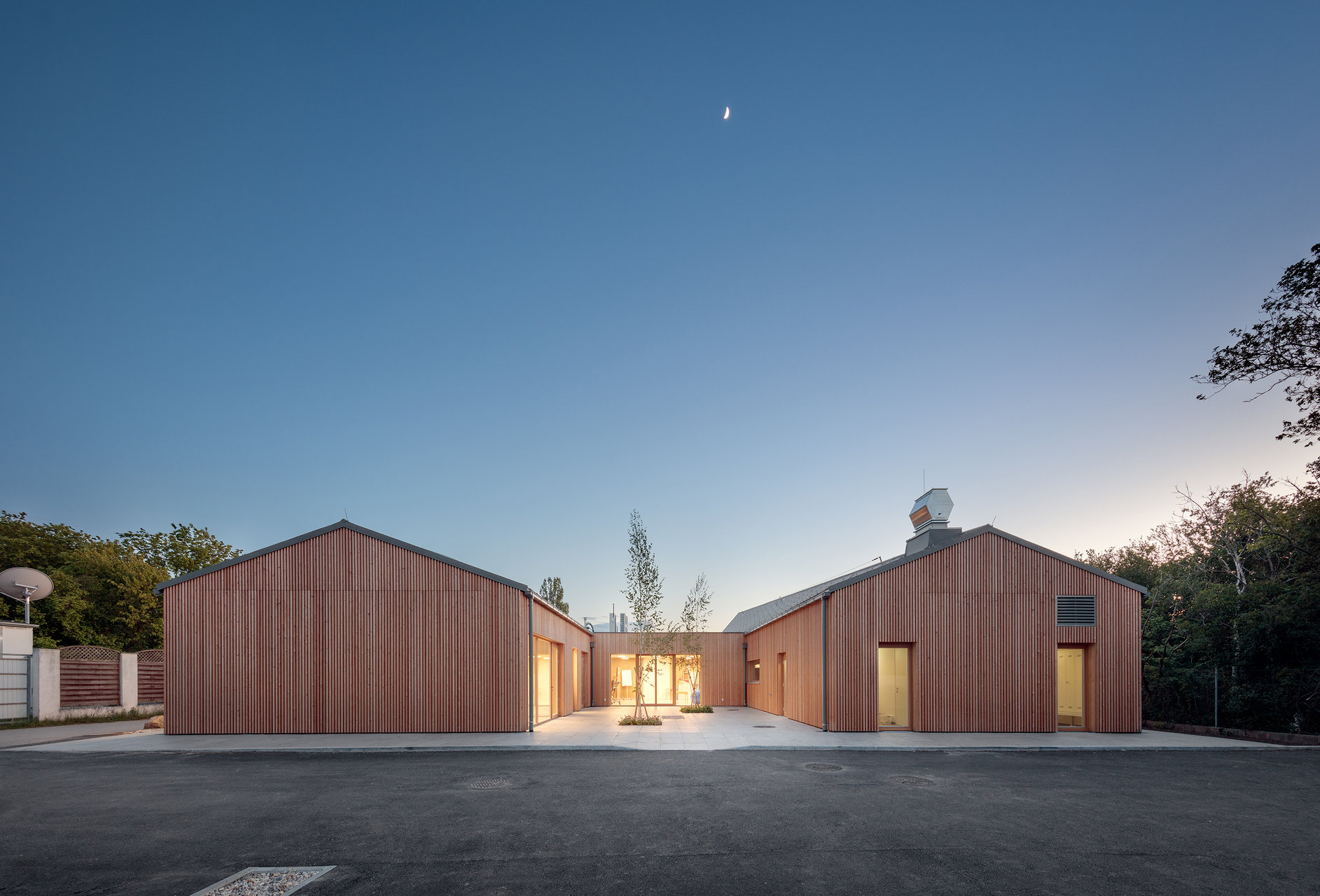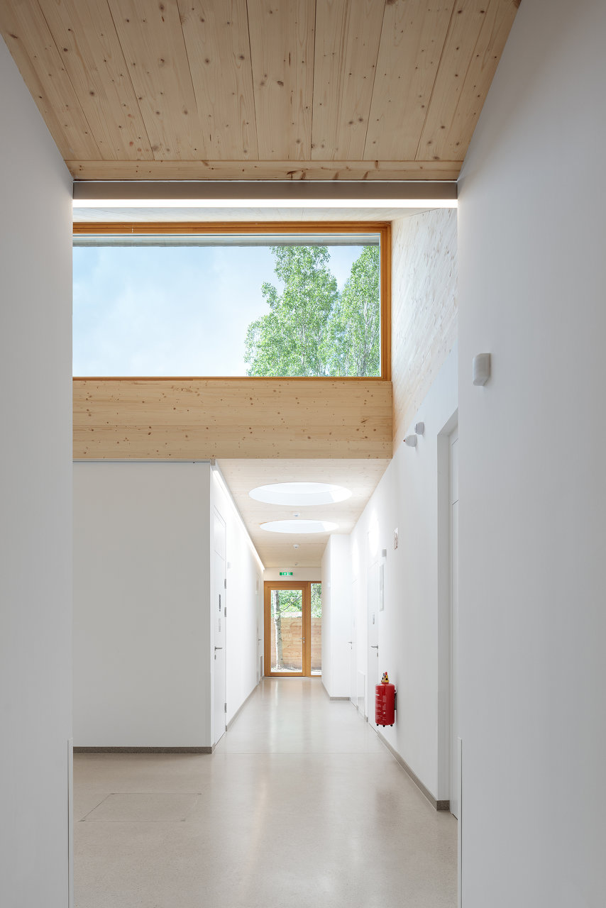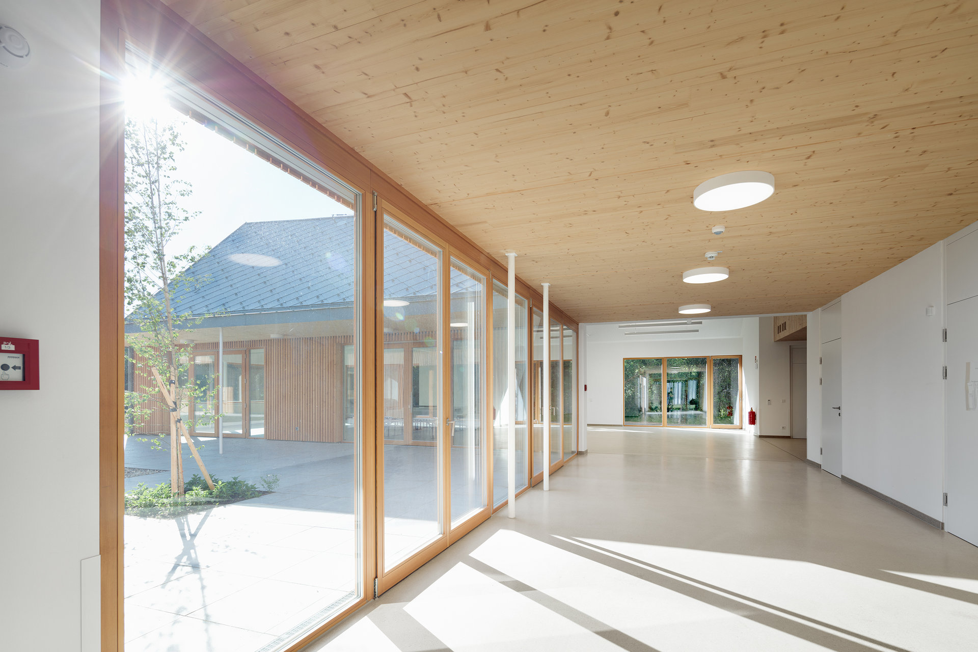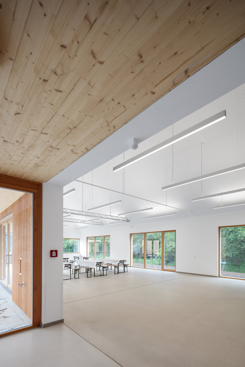 Im Gebäude für die Tagesgruppen galt es fünf verschiedene Funktionen zu vereinen. Die Anlage als H-Form mit zwei länglichen Baukörpern, einer davon mit abfallender Giebellinie des Satteldachs, lässt die Organisation im Inneren nachvollziehen: Mehrzwecksaal für bis zu 120 Personen mit Küche und Nebenräumen; im Zwischenteil der Therapieraum mit Foyer; im niedrigeren Längsbaukörper Ruhe-, Sozial-, Mediaraum und Büros mit Besprechungszimmer.