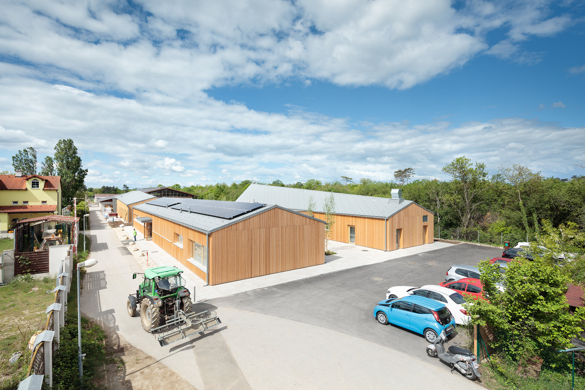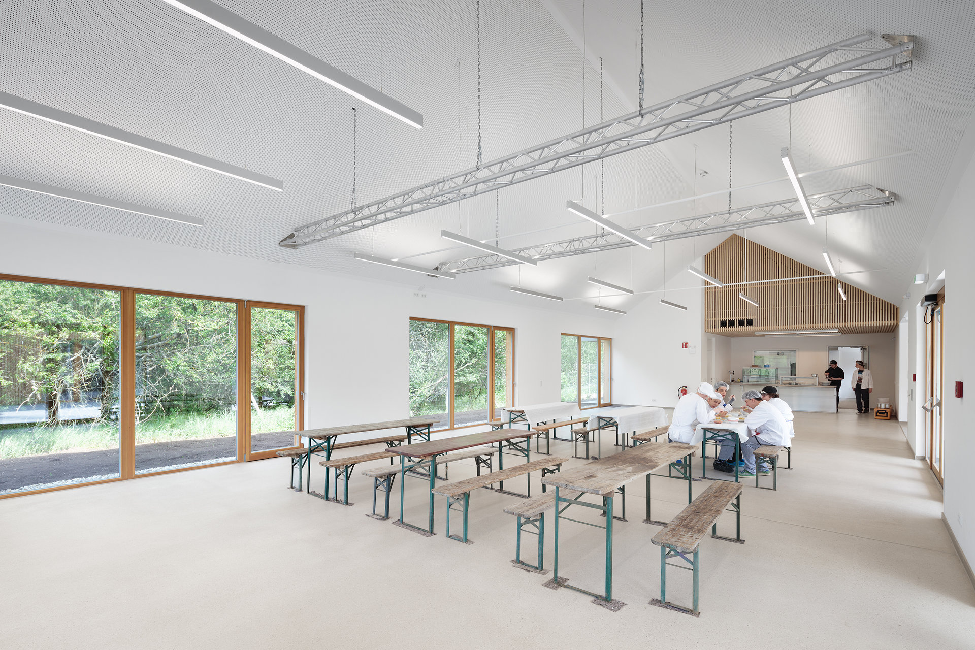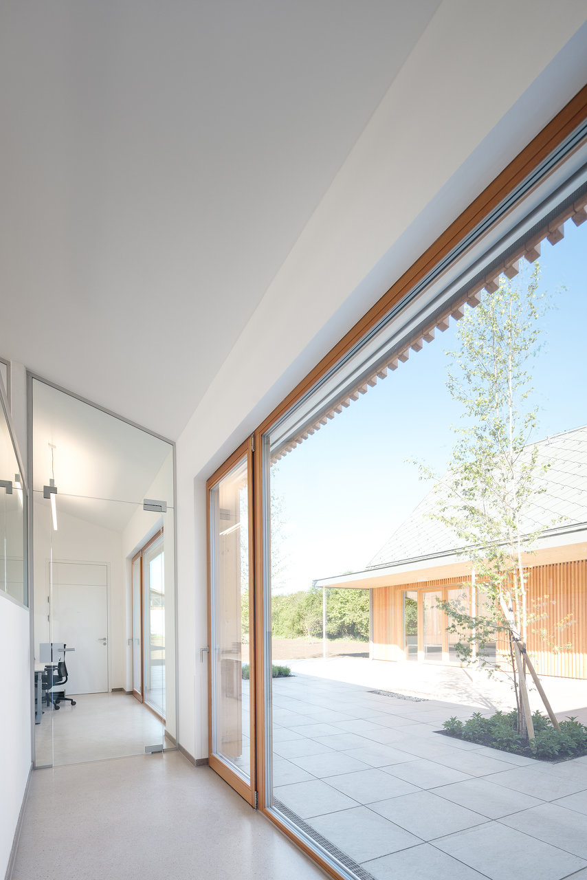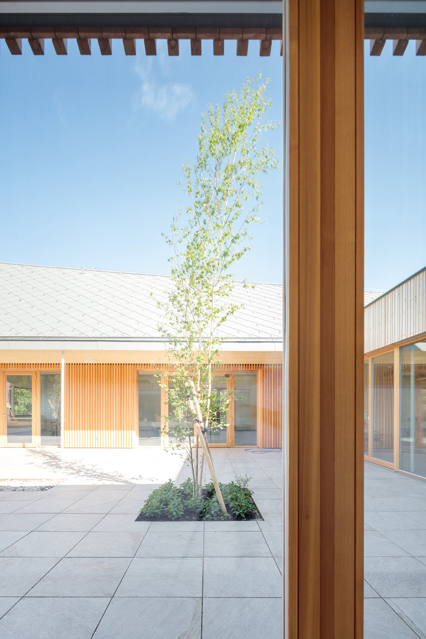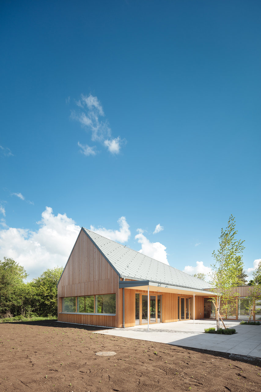 Das Schulungsgebäude mit Bewegungsraum und Seminarräumen ist so positioniert, dass einerseits die gewünschte Abgrenzung Richtung östlichem Nachbarn gelingt und andererseits die davorliegende Wiese zum zentralen Platz des Baukörperensembles wird.