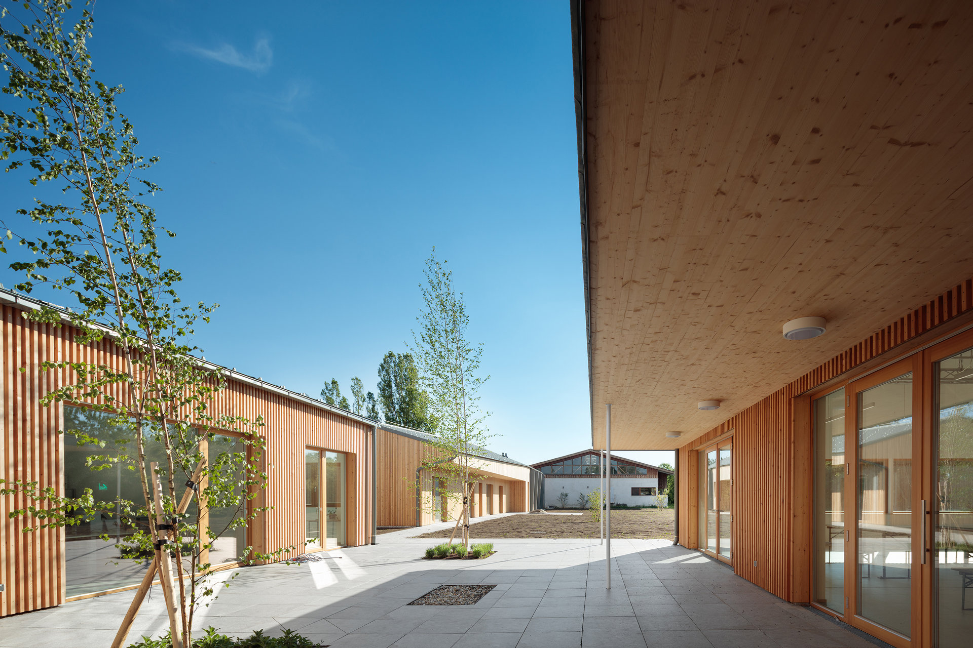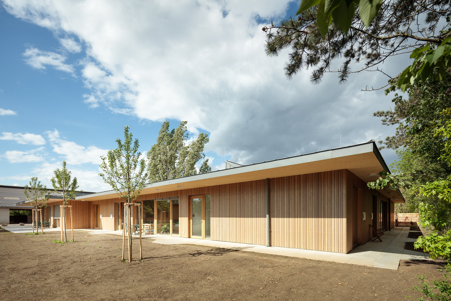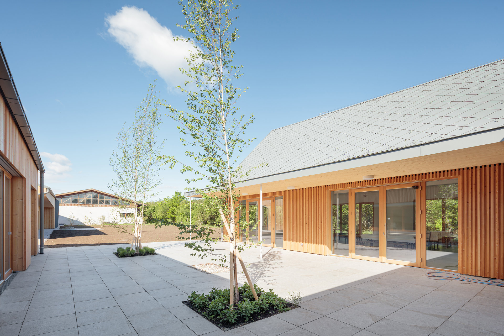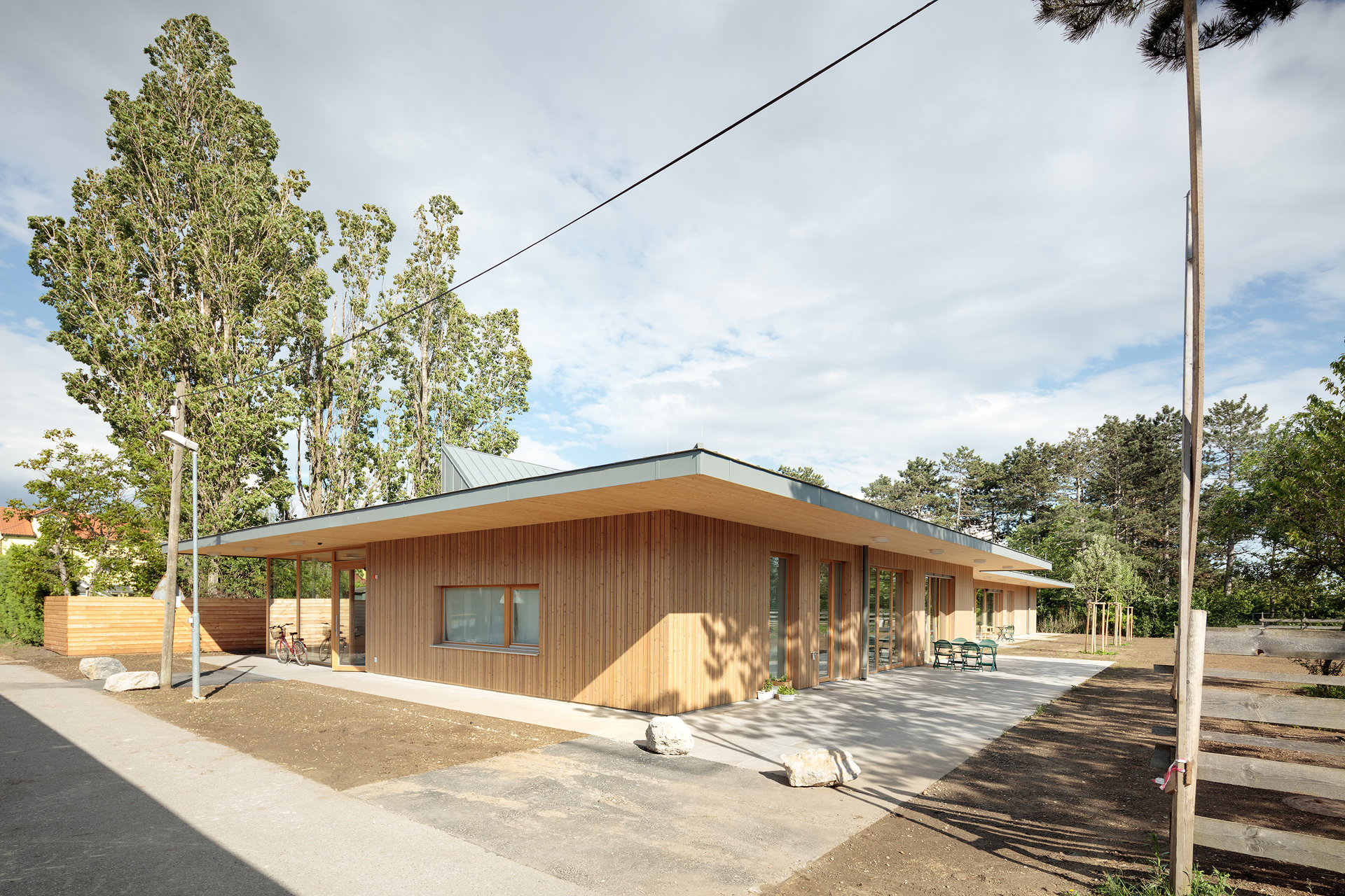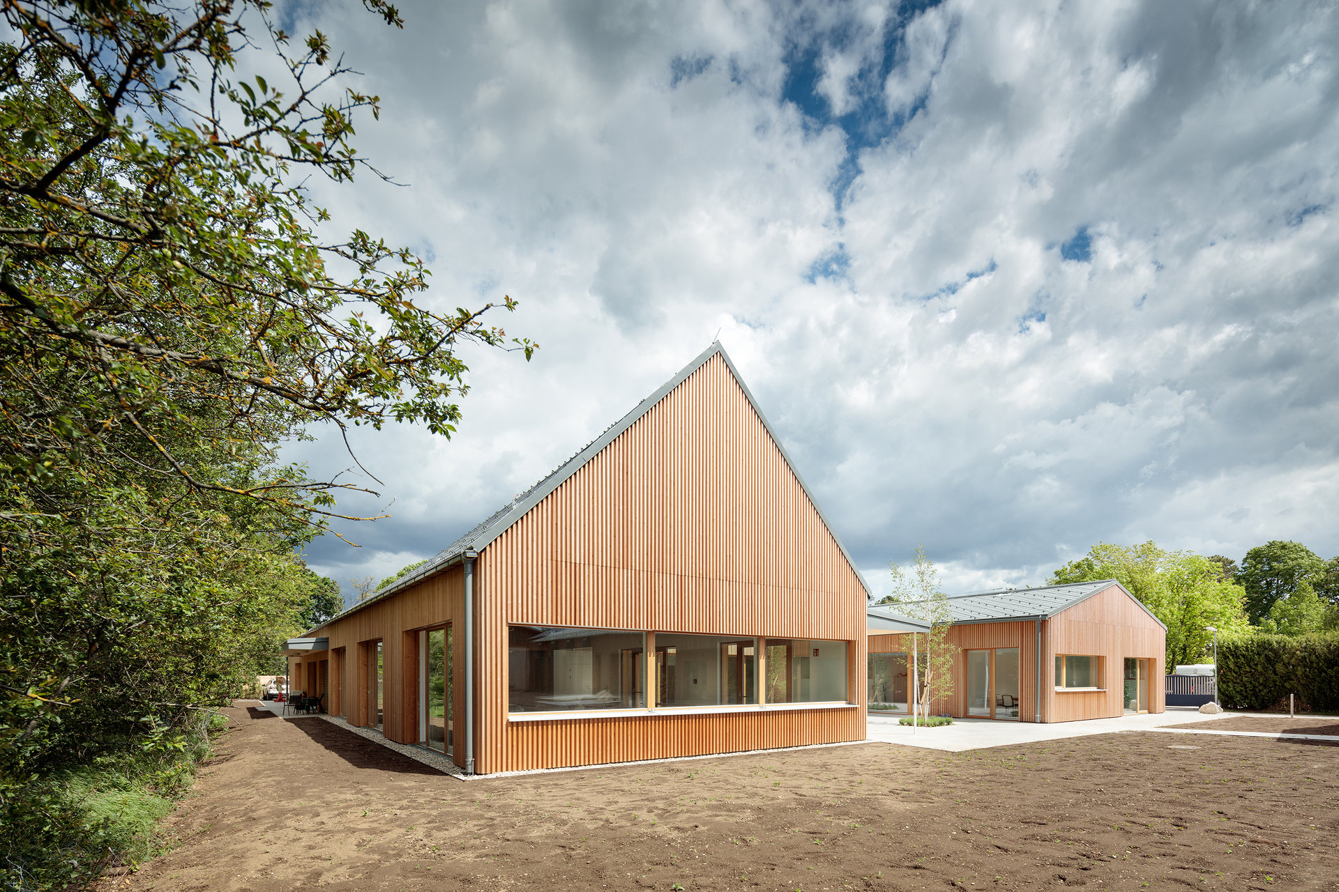 Das Grundstück ist weitläufig, sodass die Gebäude für Tagesgruppe, Schulung, Wohnen und Therapiehof eingeschossig und damit barrierefrei angelegt werden können. Die Entscheidung für Holzbauweise resultierte aus den Anforderungen bezüglich möglichst kurzer Bauzeit und vor allem aus ökologischen und atmosphärischen Überlegungen.