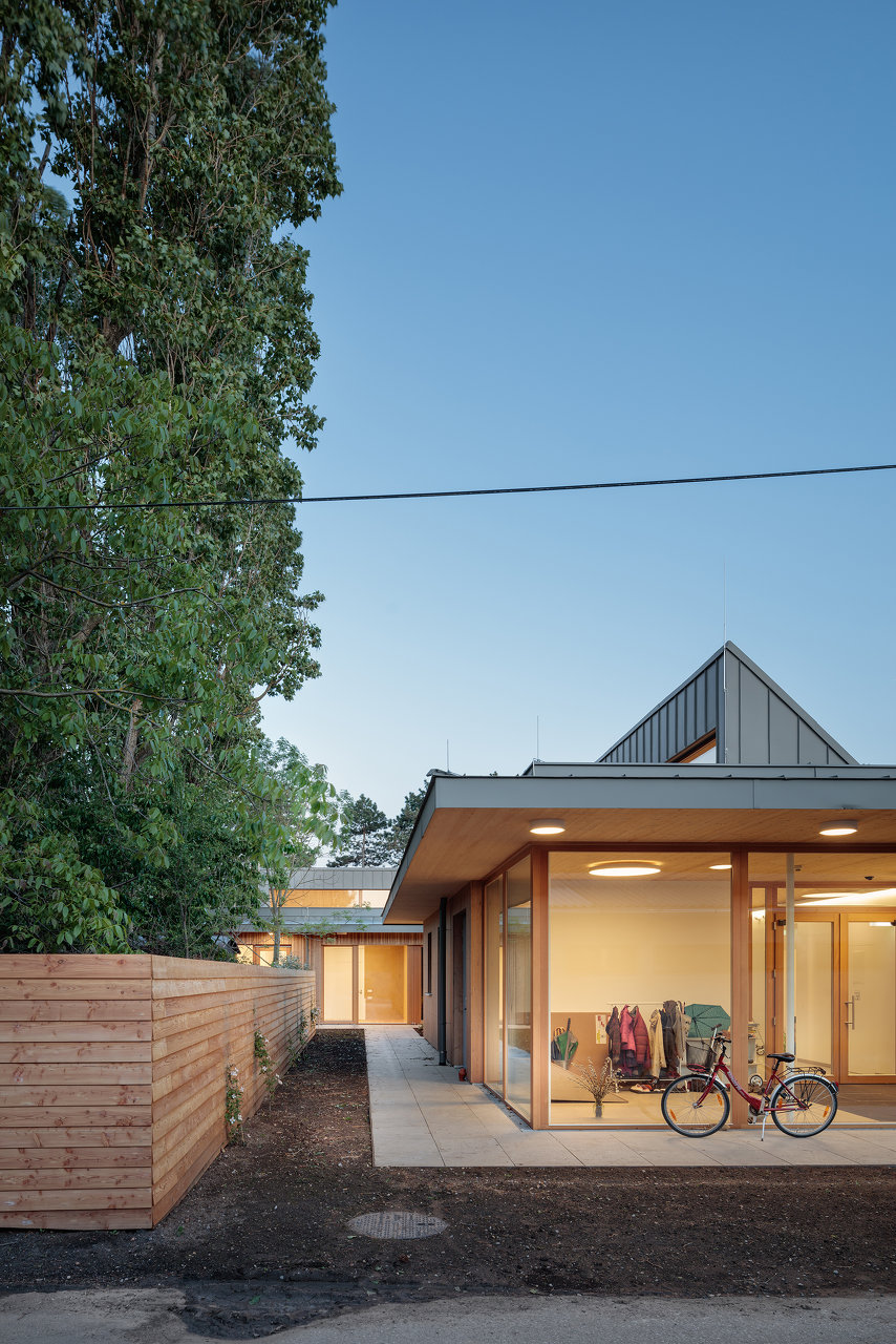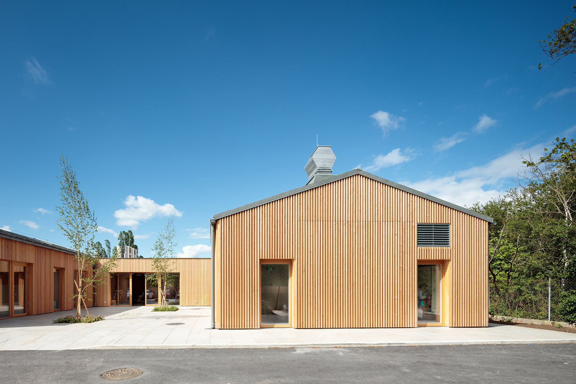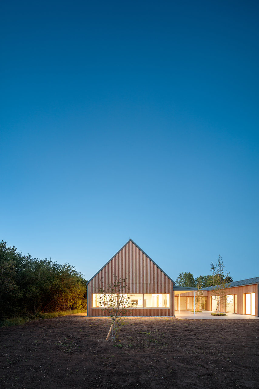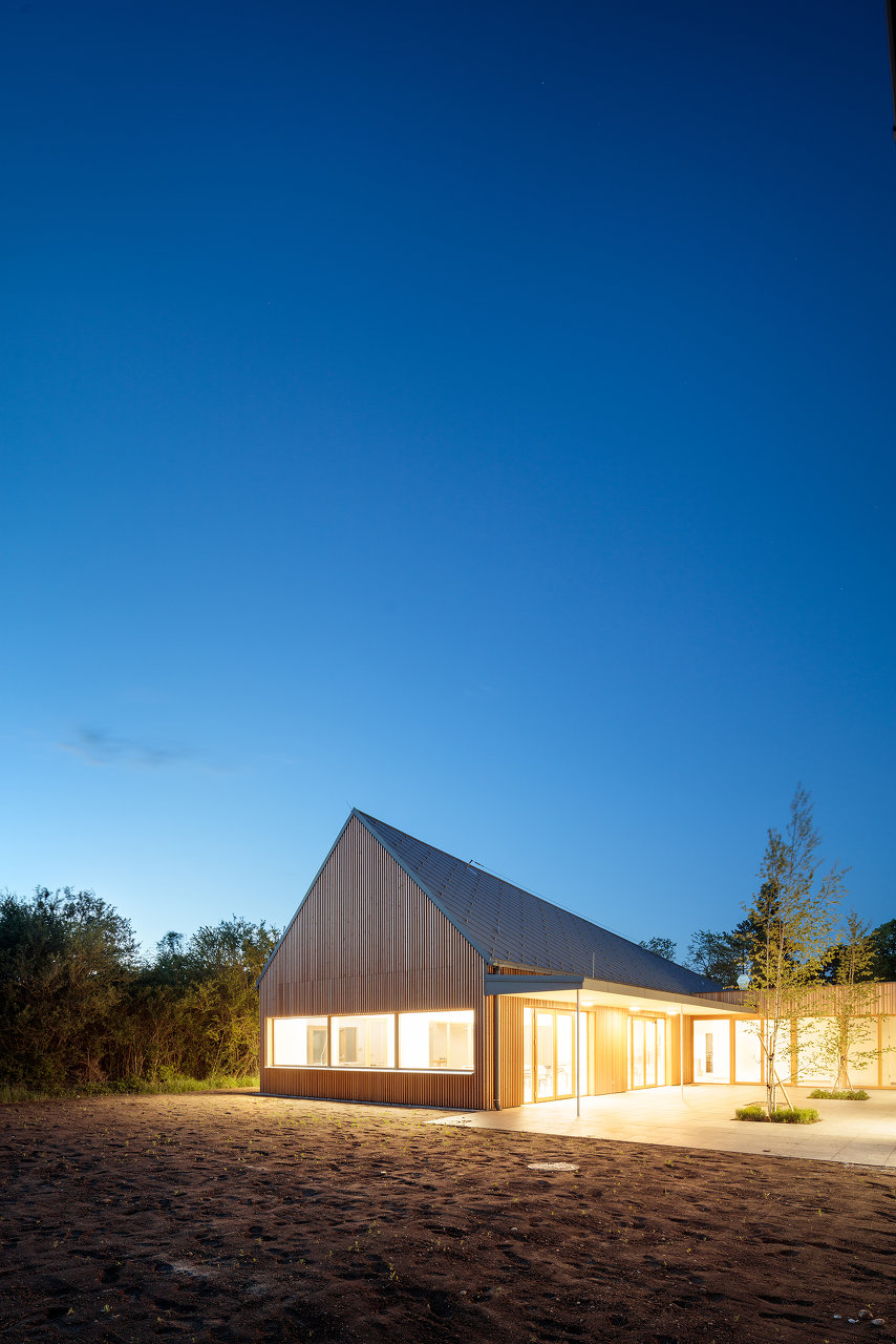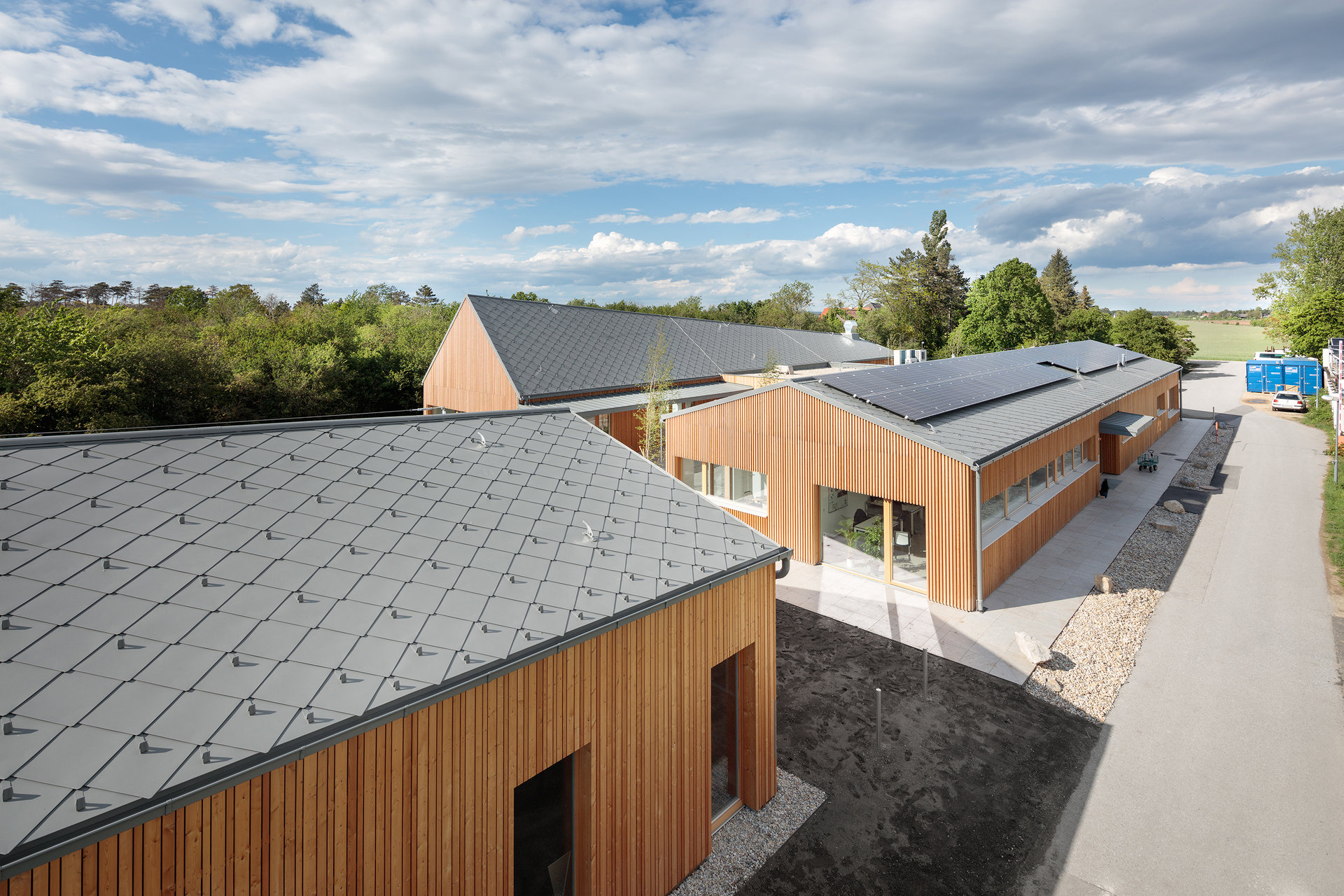 Das Grundstück ist weitläufig, sodass die Gebäude für Tagesgruppe, Schulung, Wohnen und Therapiehof eingeschossig und damit barrierefrei angelegt werden können. Die Entscheidung für Holzbauweise resultierte aus den Anforderungen bezüglich möglichst kurzer Bauzeit und vor allem aus ökologischen und atmosphärischen Überlegungen.