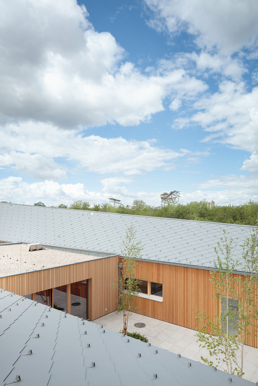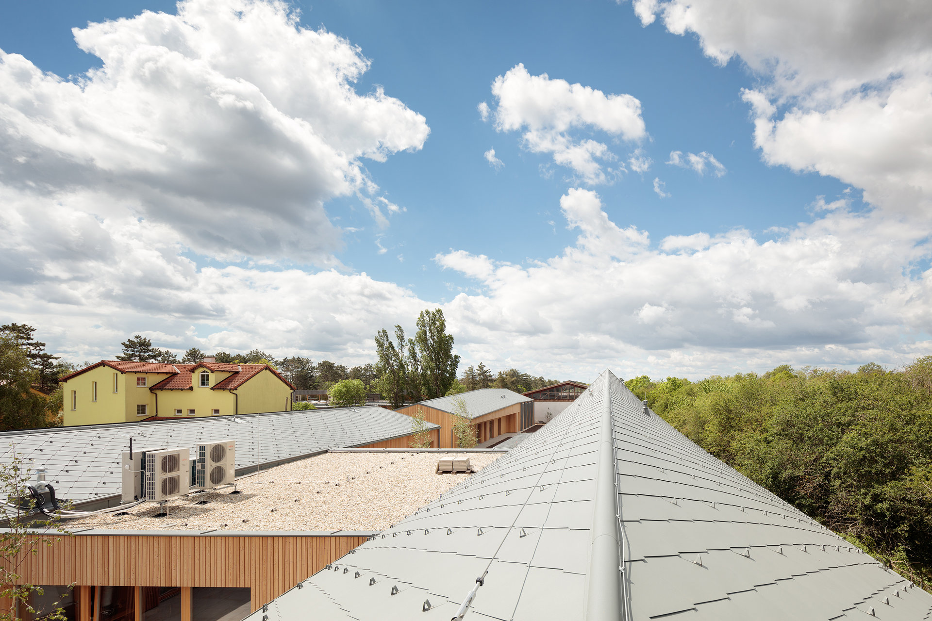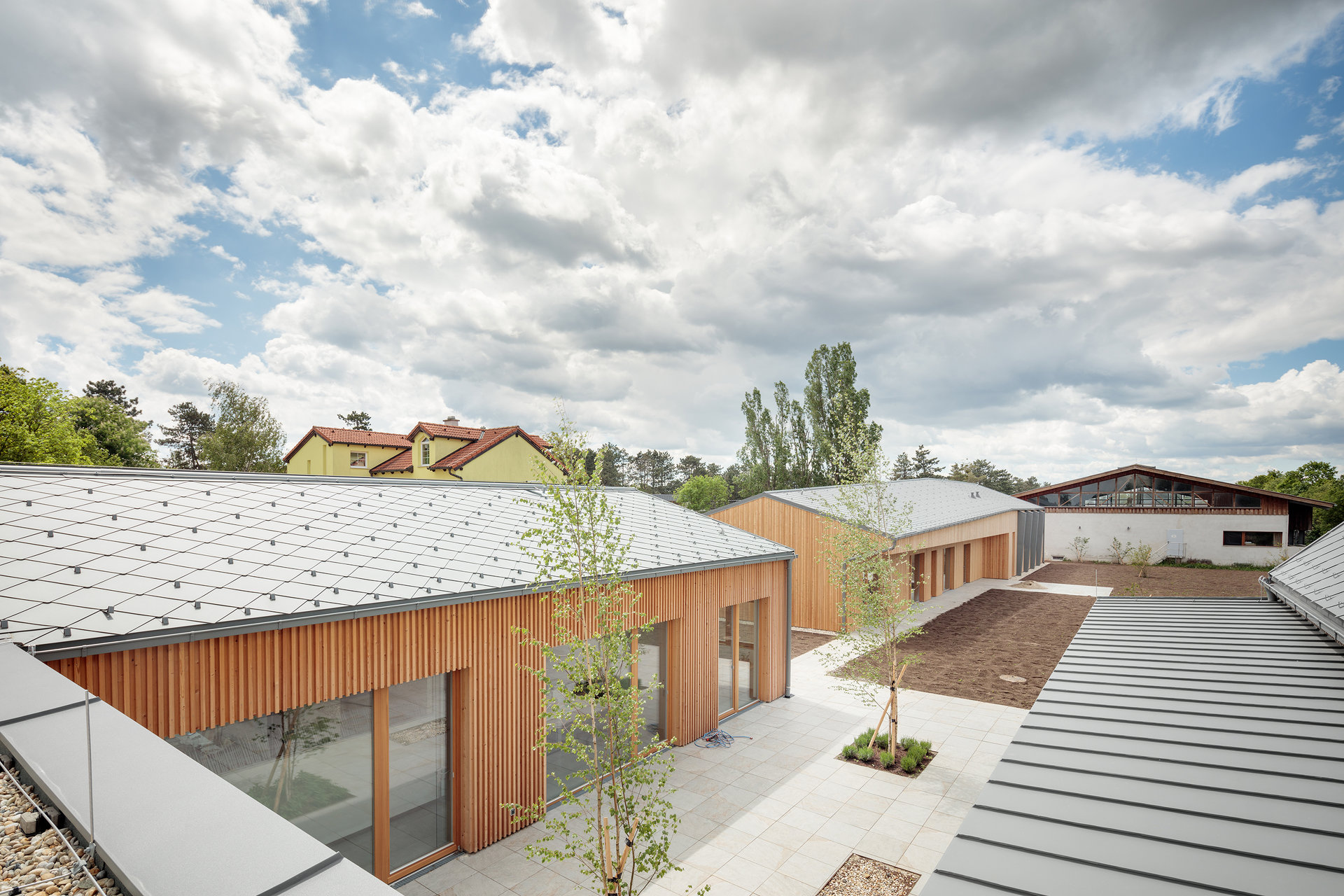 Das Raumprogramm für die Wohngruppen forderte eine kleinteilige Raumstruktur mit attraktiven Aufenthaltsbereichen. Der im Vergleich zu den insgesamt vier Volumen auch in der Dachlandschaft stärker gegliederte Baukörper orientiert sich zum beliebten Garten und der Futterwiese der Therapie-Lamas. (Text: Architekt, bearbeitet)