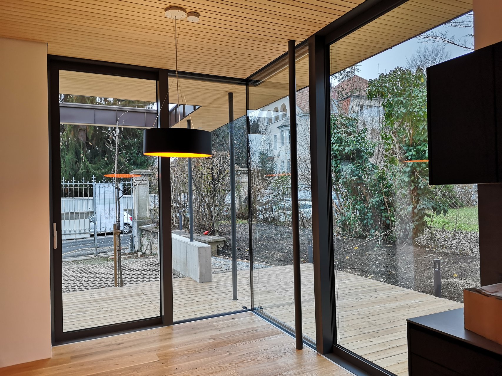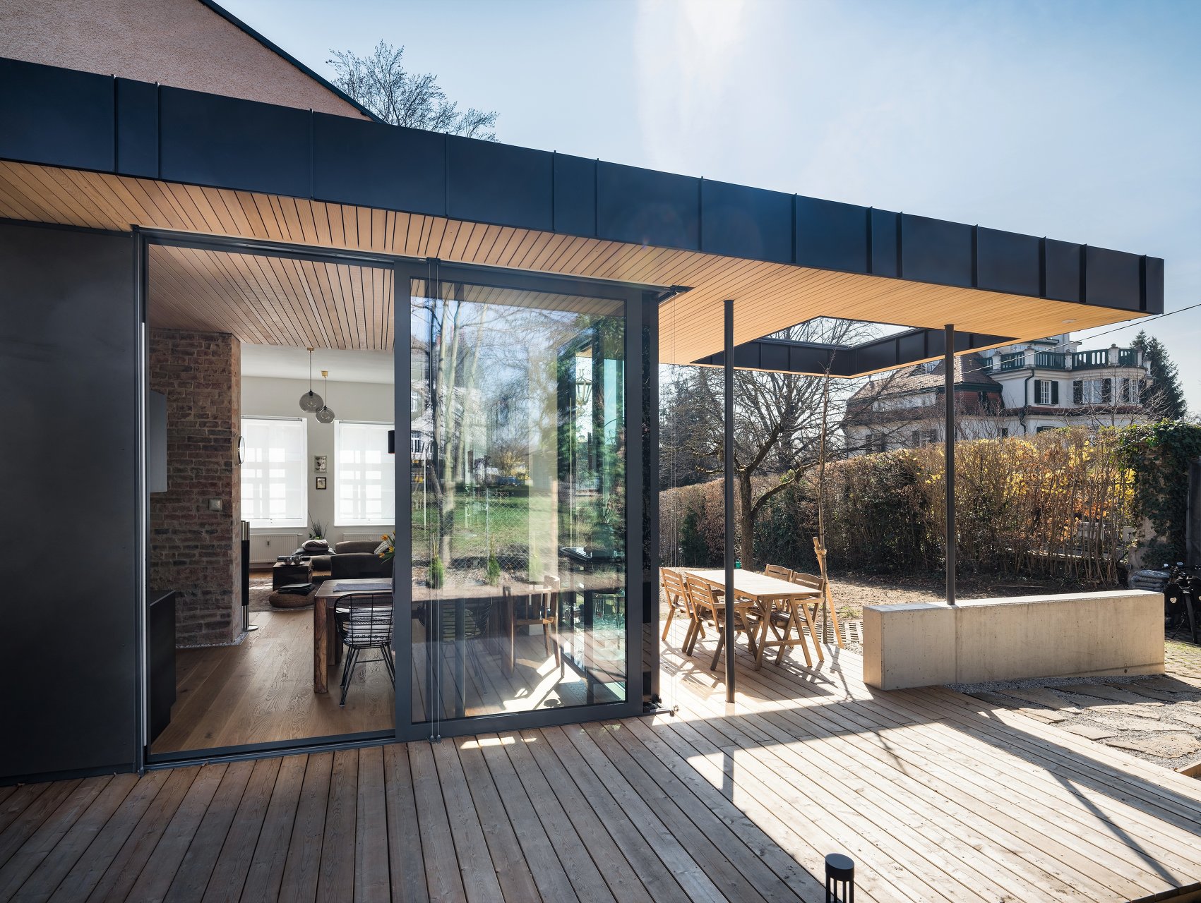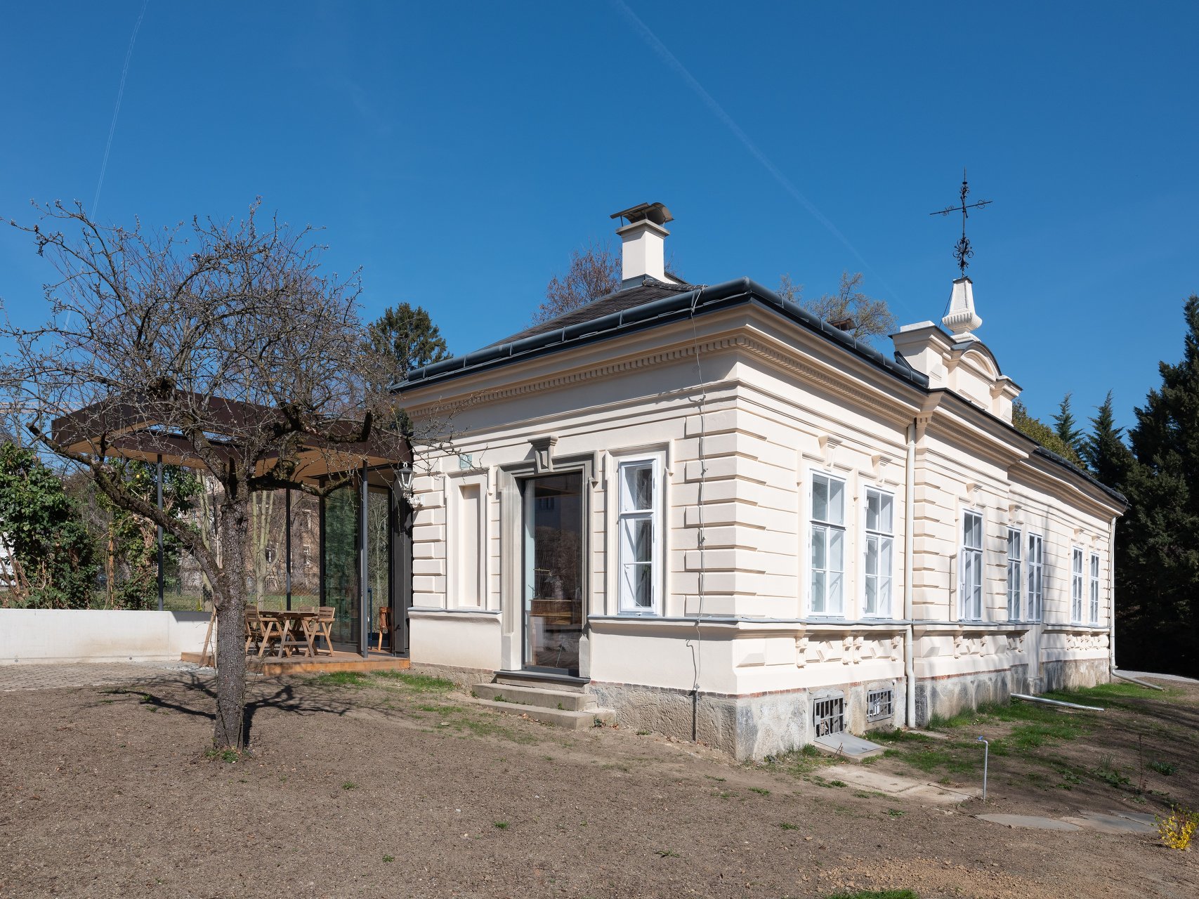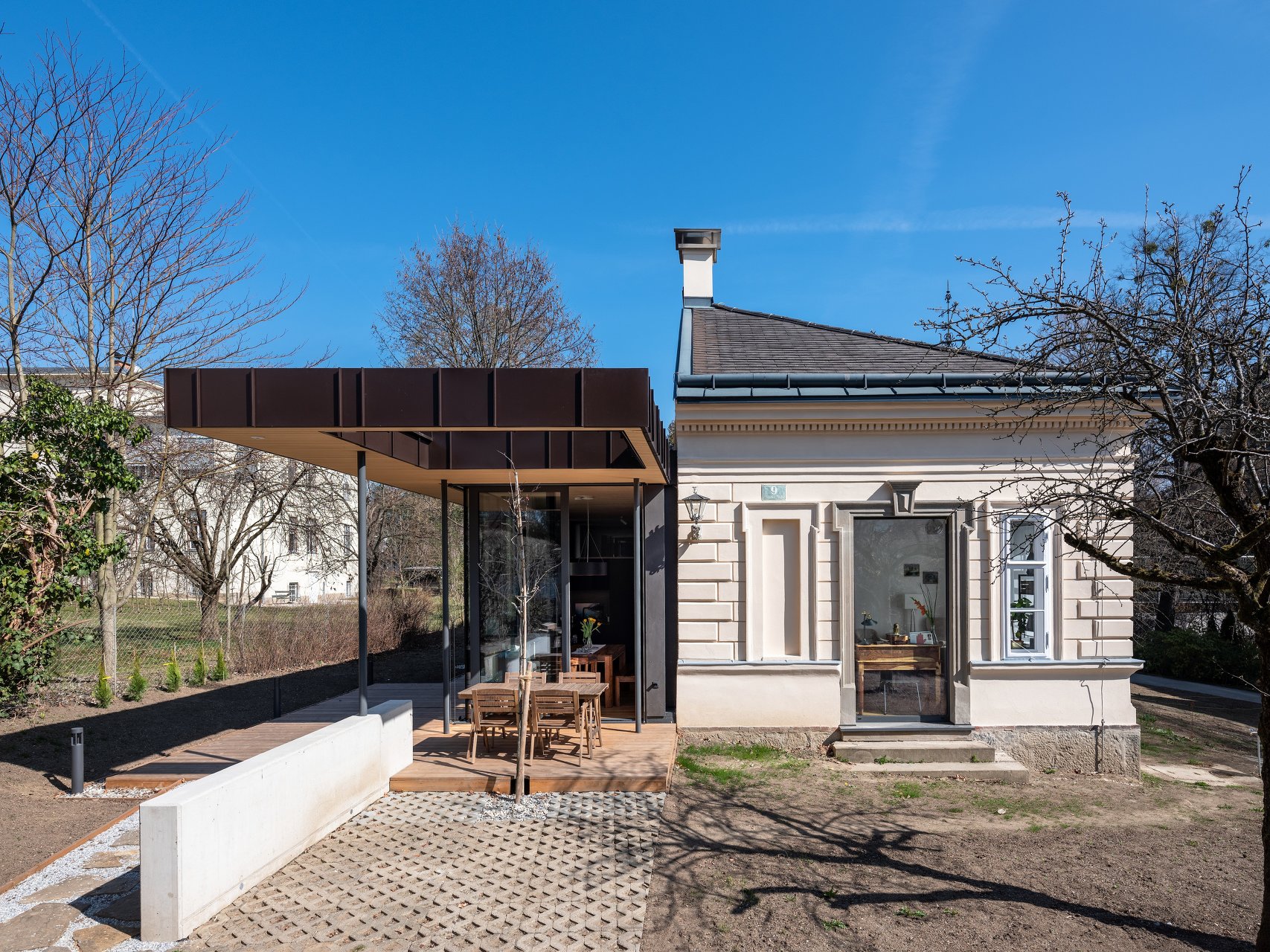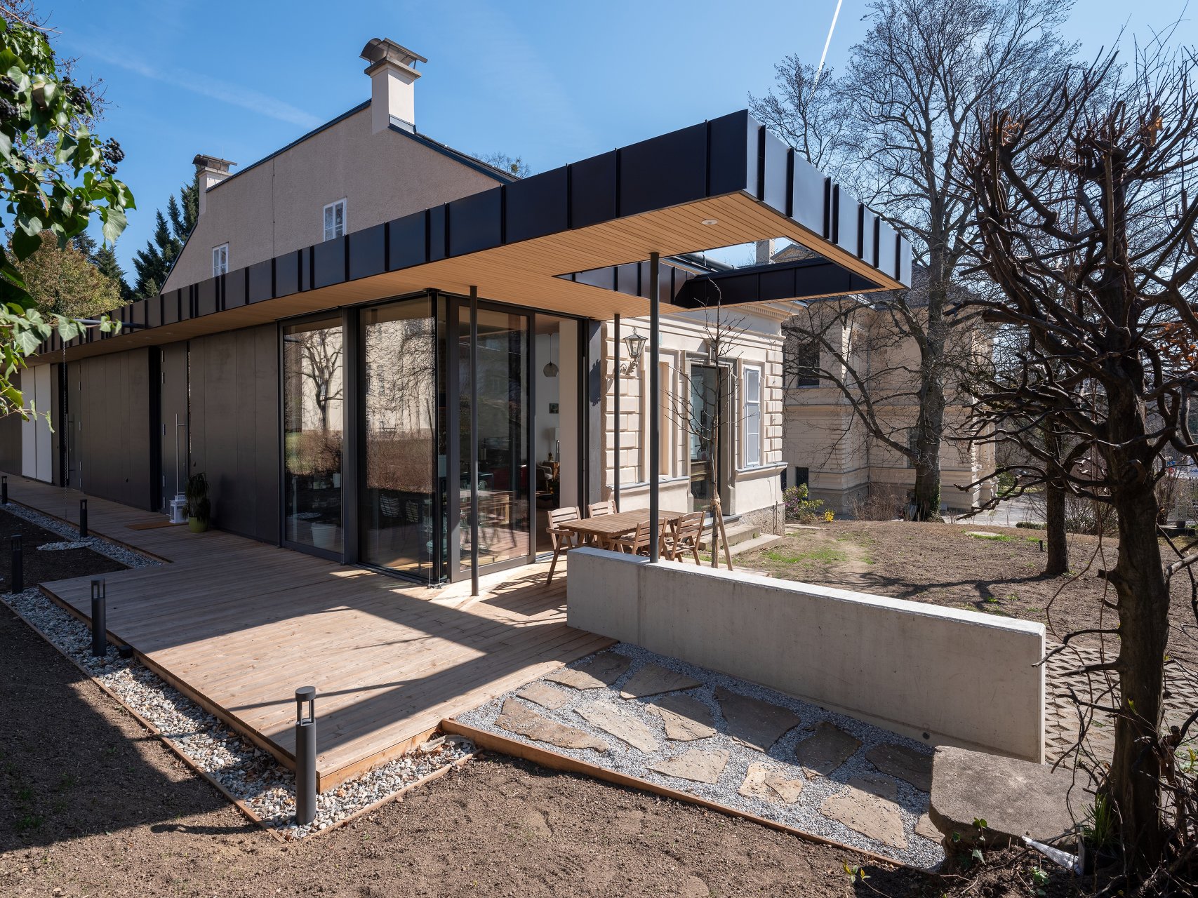 Der Anbau vermittelt durch seine leichte und offene Konstruktion den Charakter eines Pavillons. Die lineare, horizontale Gliederung der historischen Fassade wird im neu angefügten Flachdach aus Brettsperrholz weitergeführt, raumhohe Fensterelemente lösen die Fassade auf und lassen die bestmögliche Belichtung zu. Dieser Bauteil wurde mit einer bewussten Trennfuge zum Bestand ausgeführt, um die Eigenständigkeit zu unterstreichen. Im Südwesten und Nordosten liegen Terrassen, welche durch das vorgezogene, begrünte Dach beschattet werden.