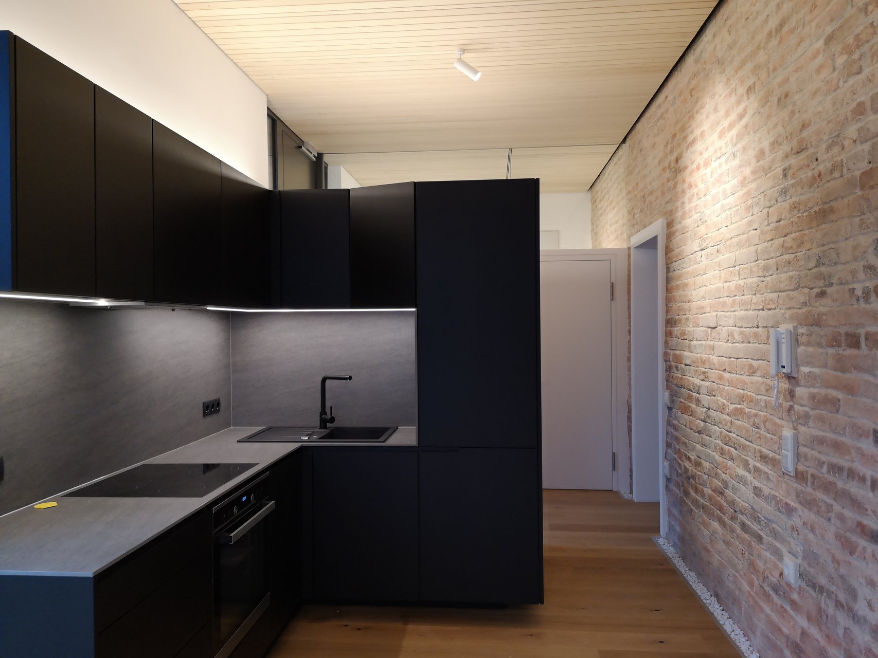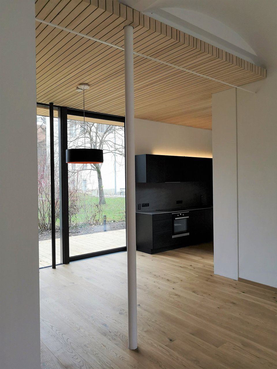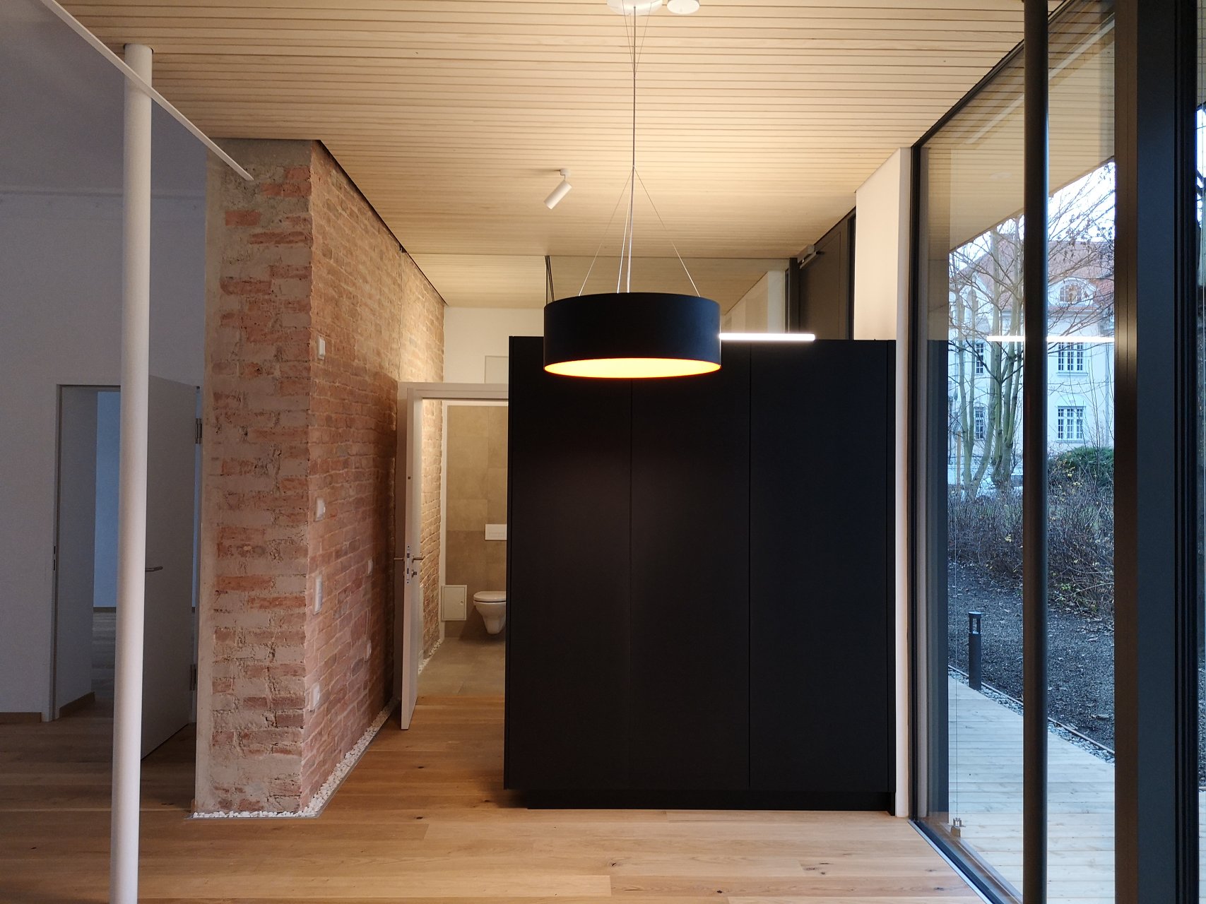 Im Inneren wurde die schmucklose Nordwestwand großzügig durchbrochen, um eine räumliche Verbindung zwischen Bestand und dem lichtdurchfluteten Neubau zu schaffen. Die ehemalige Außenseite dieser Wand wurde vom groben Putz befreit und die Ziegel freigelegt, um das Historische vom Neuen optisch zu differenzieren. (Text: Architekt:innen)