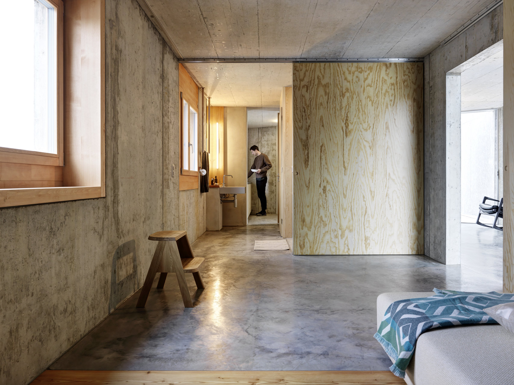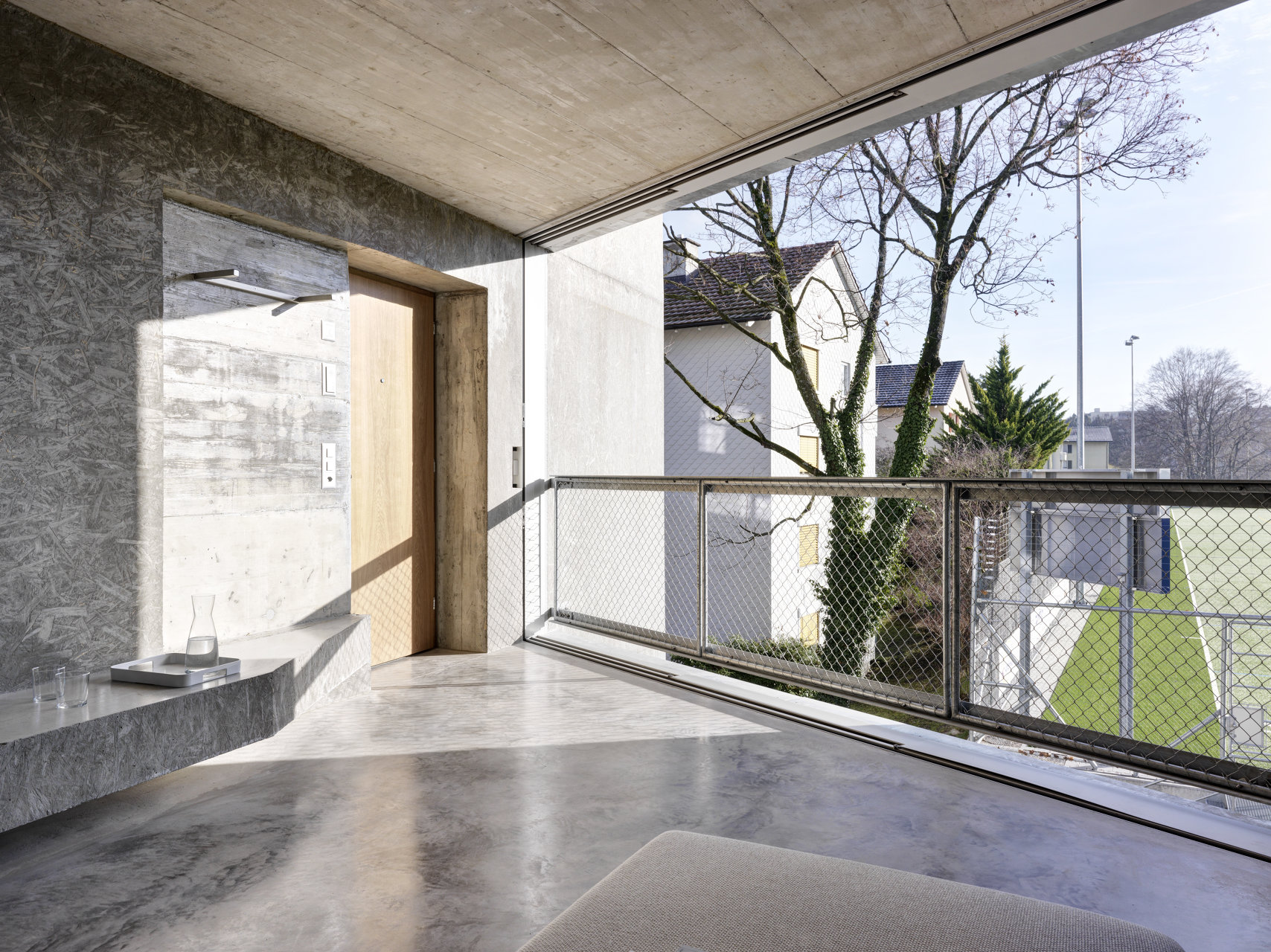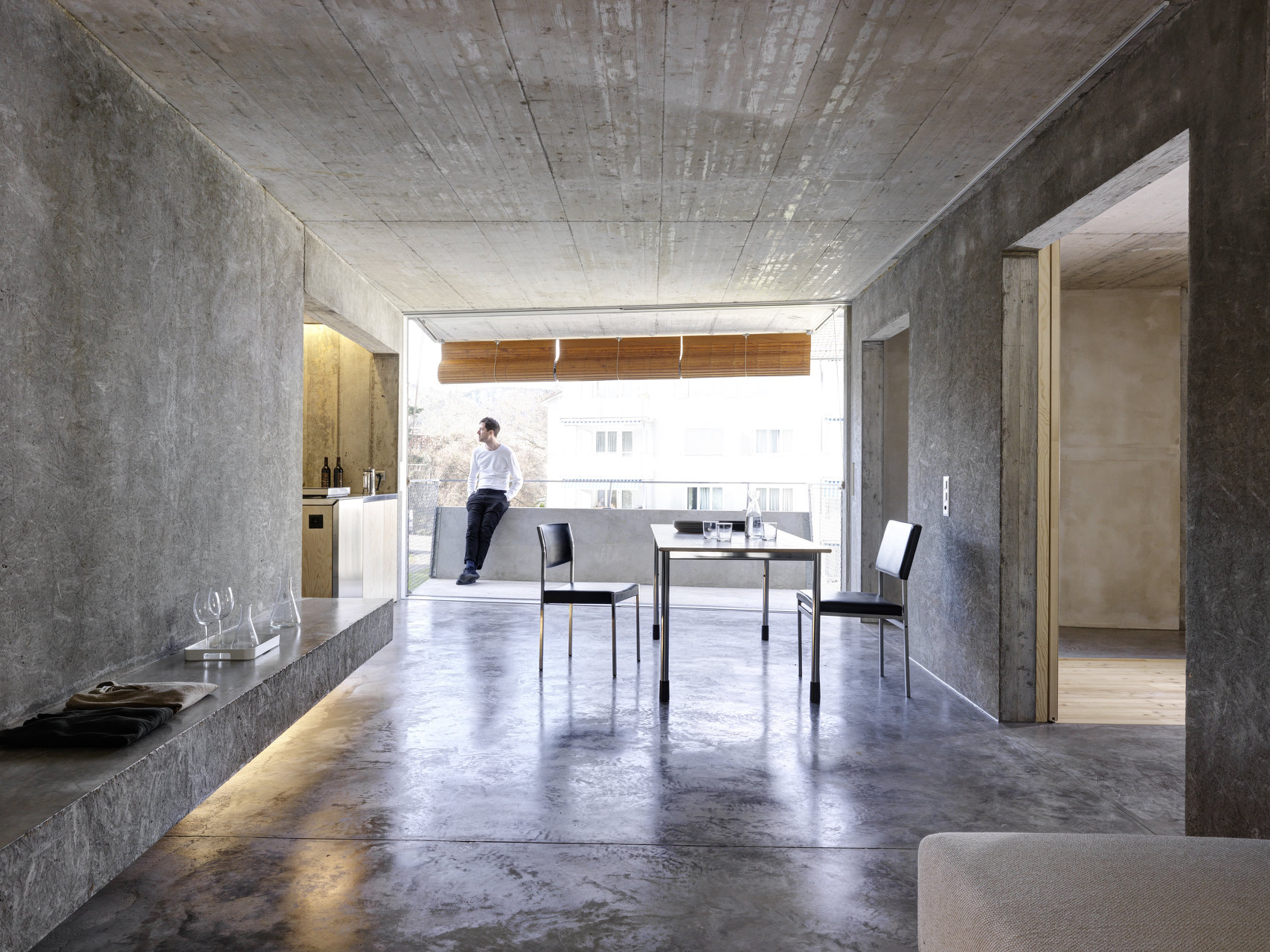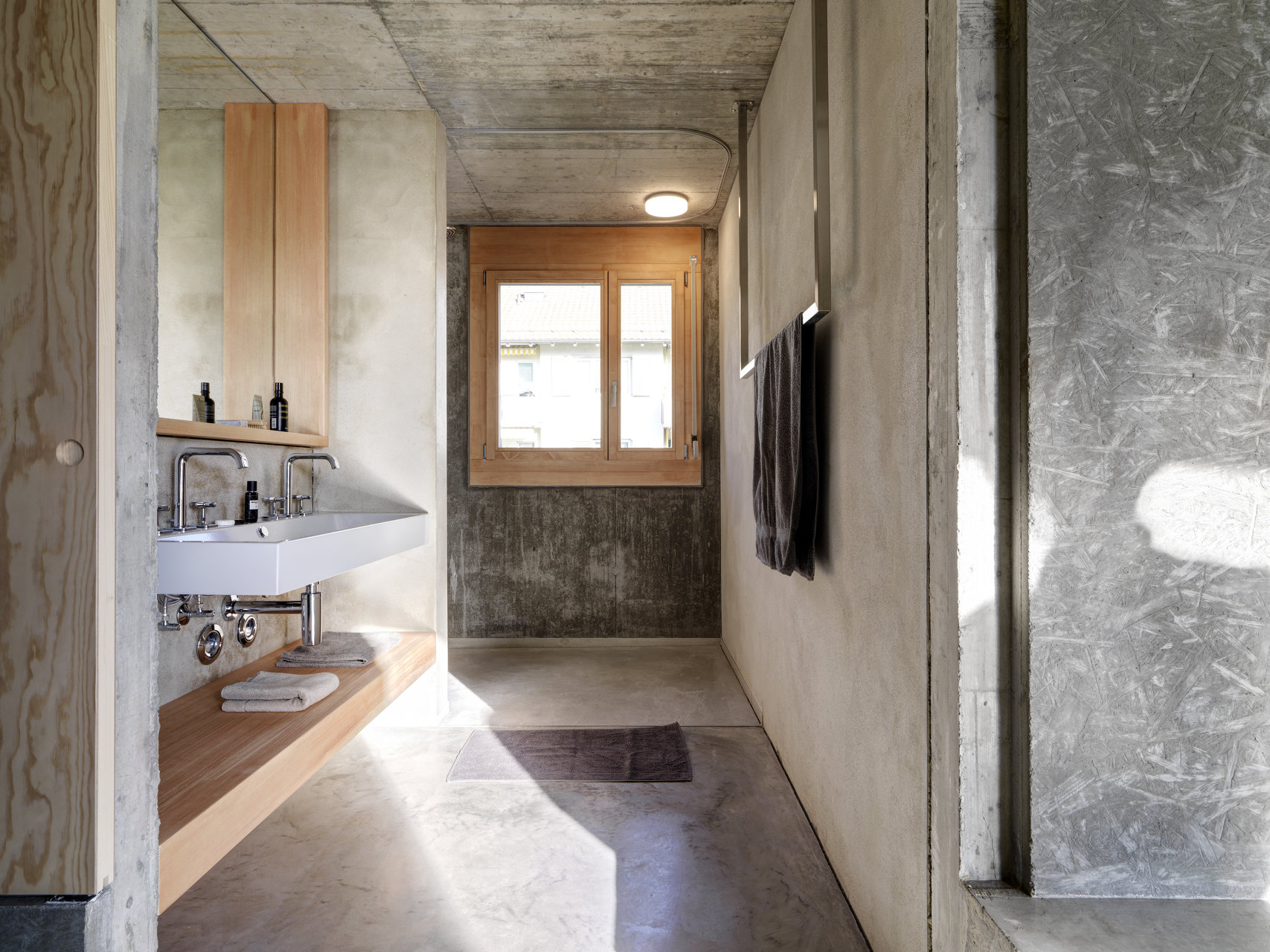 Die Peripherie des Wohnraums wird topographisch bearbeitet und macht die raumbegrenzenden Elemente kommunikativ. Daher werden die raumdefinierenden Elemente nicht als Trennwände empfunden, sondern als kommunikative Protagonisten. Der Mensch wird in die Topographie der Masse mit einbezogen. Dies umfasst Programme wie Garderoben, Wohnzimmerbank bis zur Küche ... Das Badezimmer der 4½-Zimmer-Wohnung ist durch eine Schiebetür vom Gemeinschaftsraum getrennt, die den Boden nie berührt. Der Raum fließt als Kontinuum weiter – und erzeugt gleichzeitig Intimität. Der Eingang zu jeder Wohnung wird von einem massiven Betonunterzug komprimiert und damit der Moment des Eintritts erfasst. Die Betonbank, die aus der Badezimmerwand 'herauswächst‘, schafft unmittelbar am Eingang mit der Badschiebetür einen Moment des Übergangs. Der Betonboden fließt als Fragment des Gemeinschaftlichen in alle Schlafzimmer, im Schlafzimmer iniziiert die Holzfläche am Boden eine neue Ebene der Intimität. (Text: Architekt)